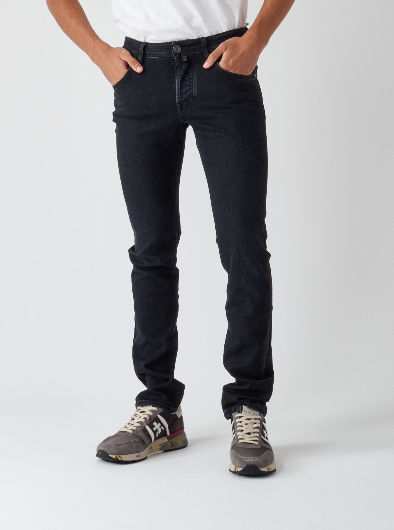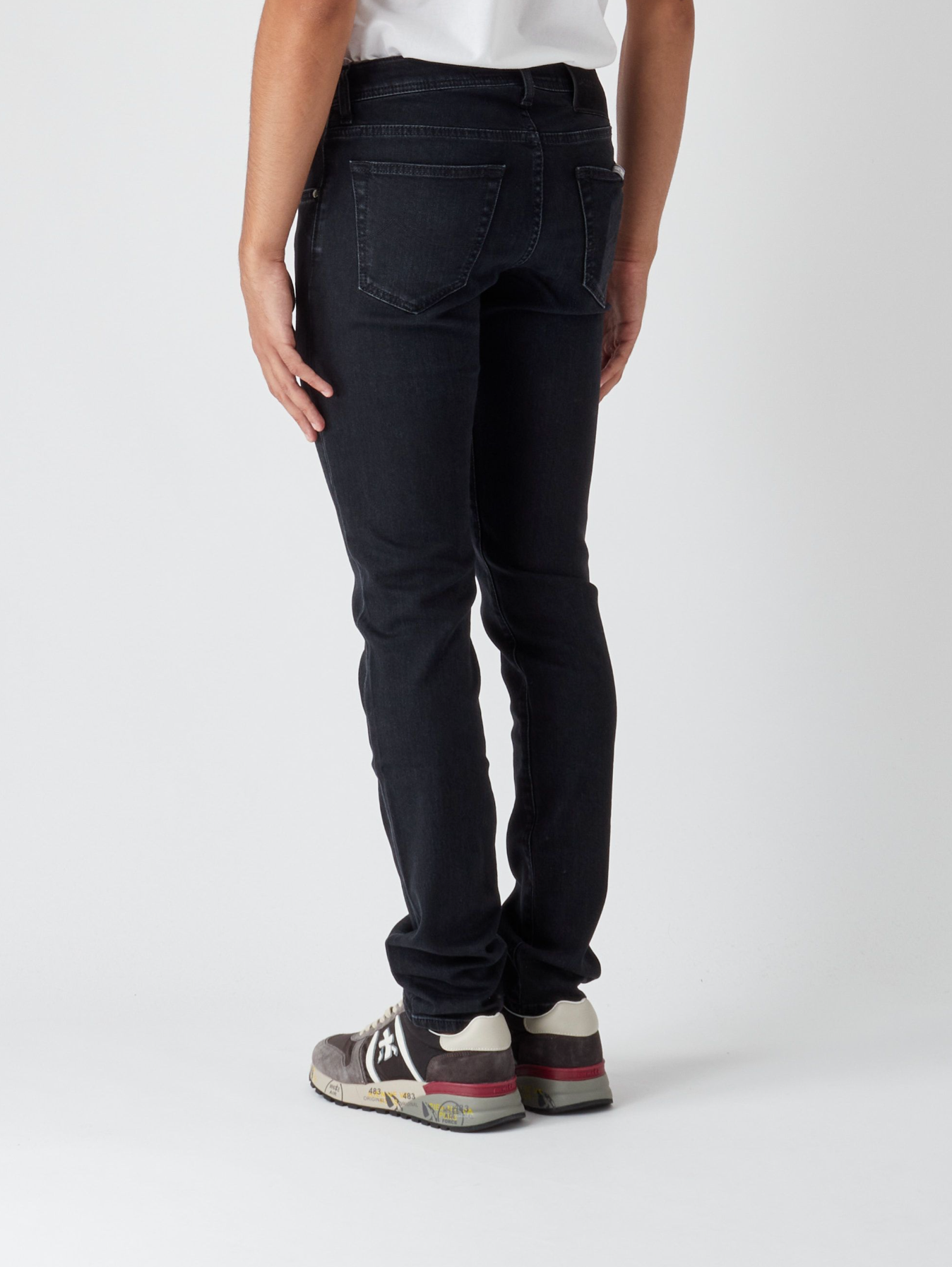 Discover sophistication with our super slim fit denim, perfect for the fashion-forward gentleman. These jeans feature a sleek black hue complemented by a 5-pocket design, ensuring both style and practicality. A distinctive black suede leather patch on the back adds a touch of luxury, while the front buttons closure secures a comfortable fit. Meticulously crafted in Italy, they embody refined craftsmanship and timeless elegance.