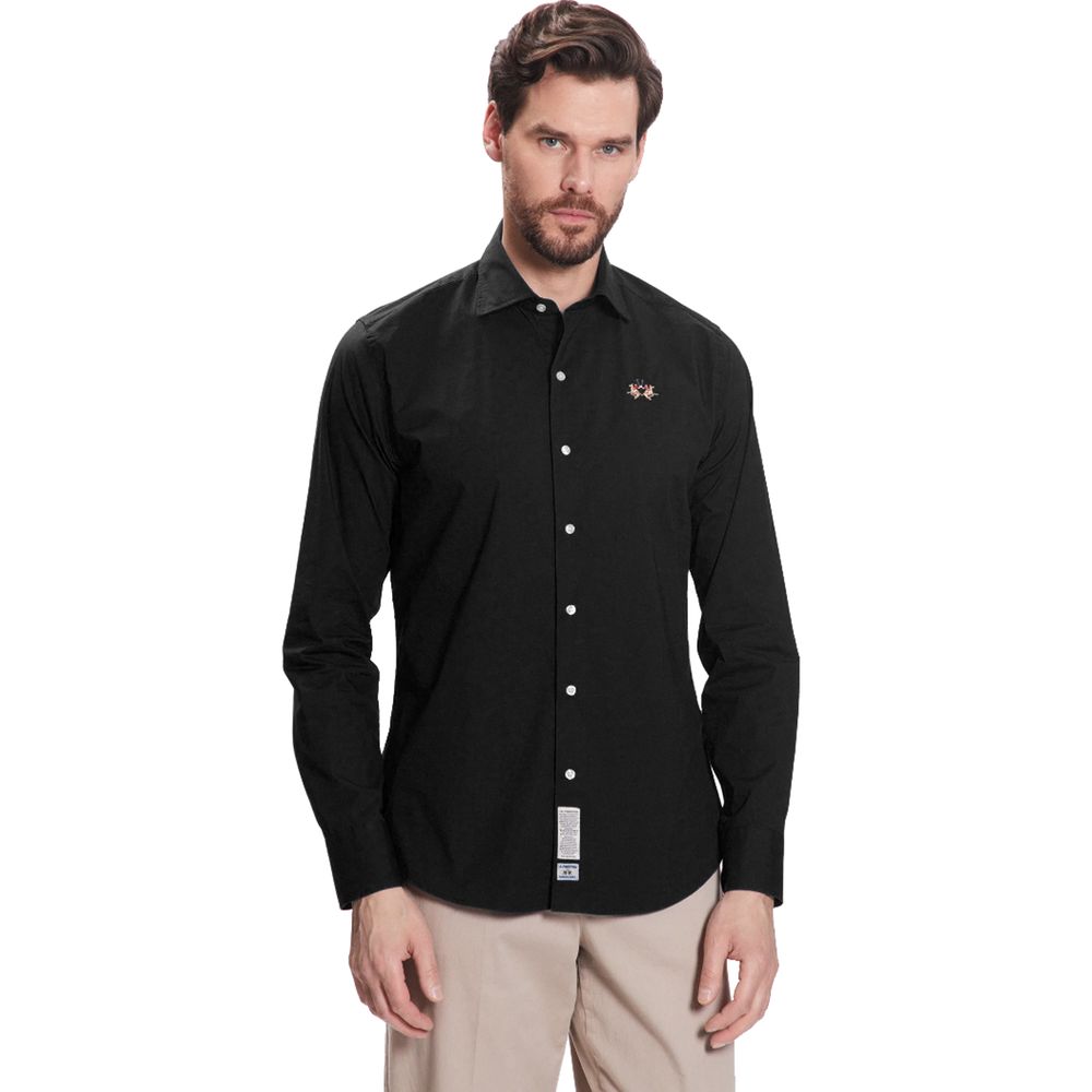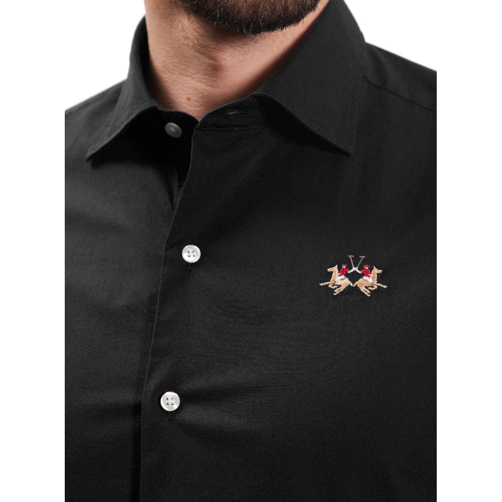 Discover the epitome of sophistication with our Elegant Black Poplin Cotton Shirt. Perfectly tailored to add a touch of elegance to your wardrobe, this shirt features a sleek black hue complemented by the iconic logo of La Martina, intricately embroidered on the chest. Crafted from a blend that ensures both comfort and a perfect fit, it’s a versatile piece that’s essential for any fashion-forward gentleman.