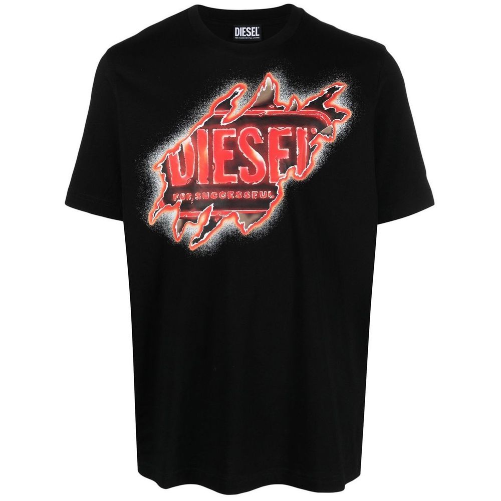Discover the perfect blend of comfort and style with our Diesel black cotton t-shirt, featuring a striking colorful print on the chest that captures attention and exudes confidence. Perfect for any casual occasion, this t-shirt pairs effortlessly with your favorite jeans or shorts.