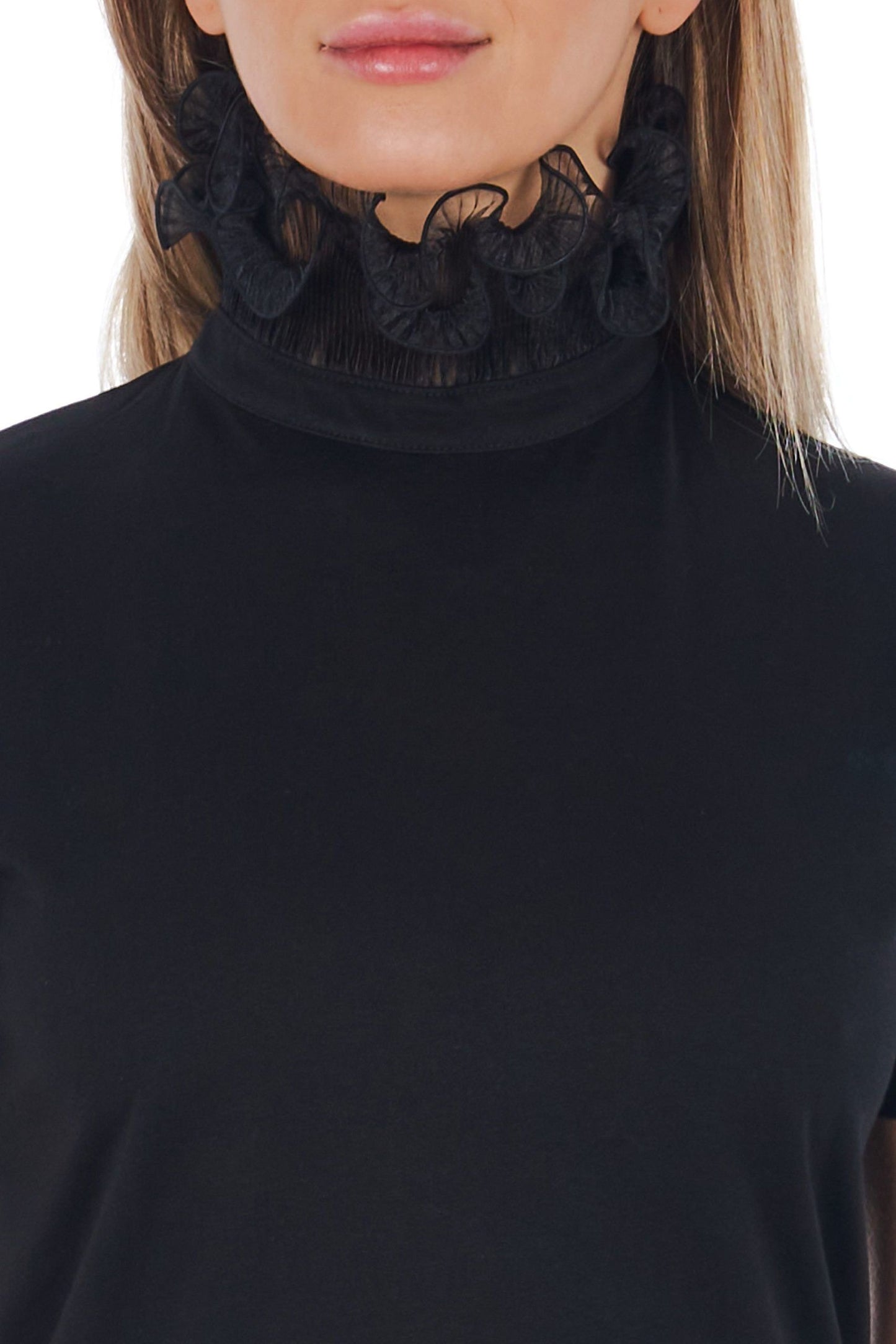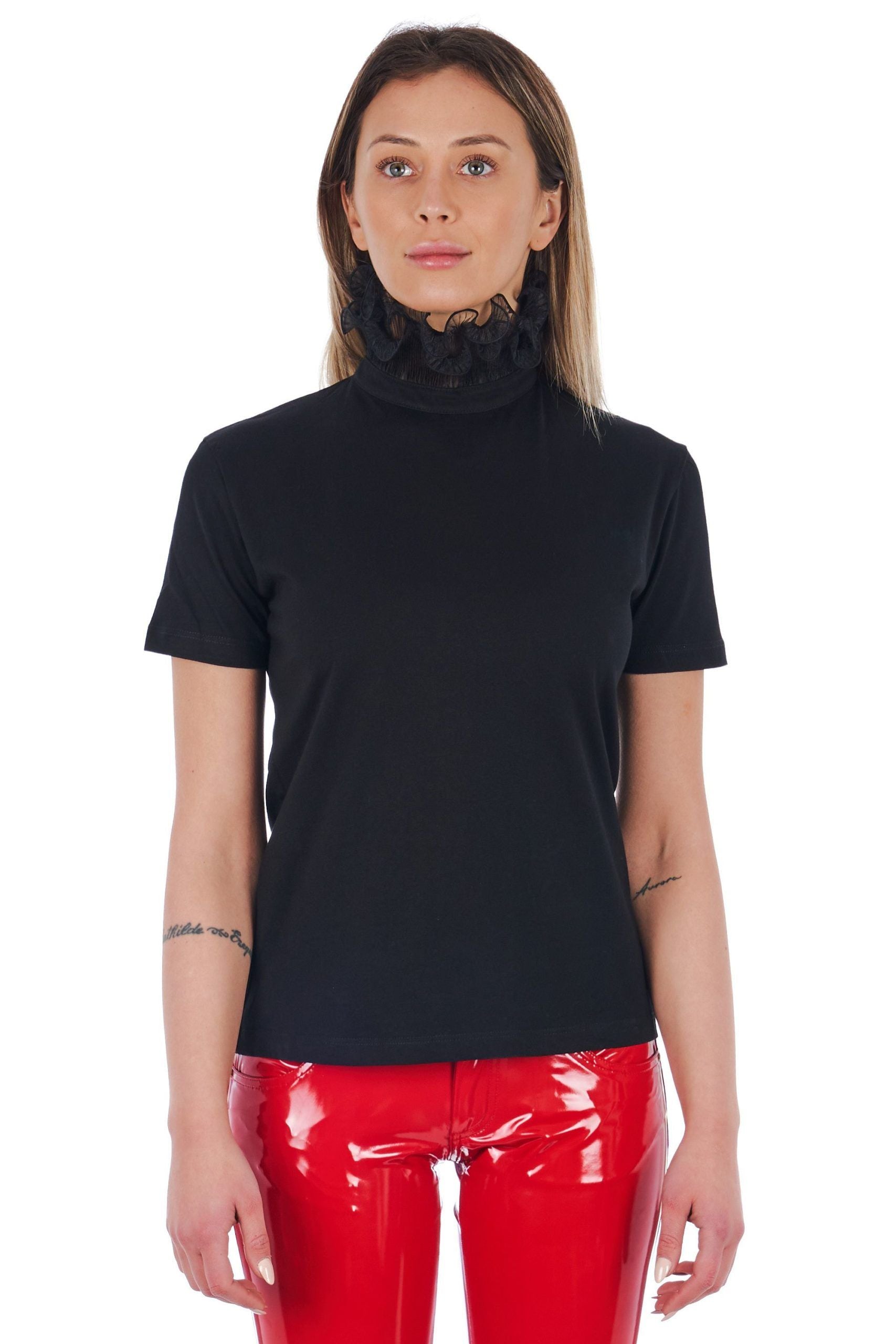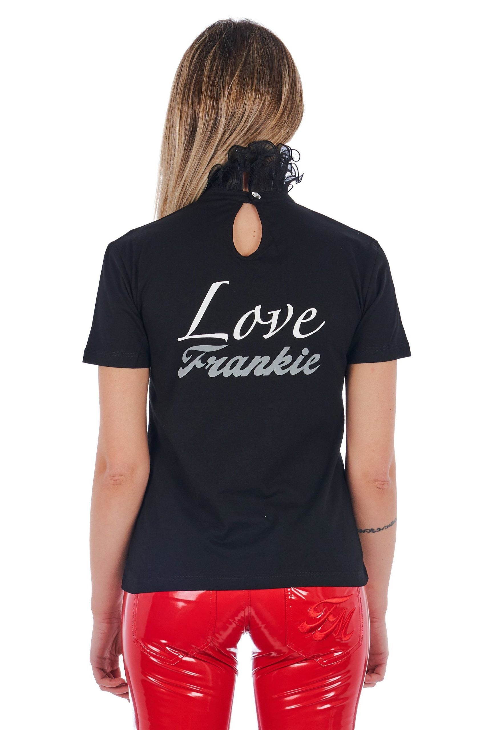Indulge in the epitome of sophistication with Frankie Morello’s High Neck Short Sleeve T-shirt, elegantly accented with lace. This chic black top is designed to elevate your style, featuring a unique print on the back and a graceful teardrop opening. Perfect for those who appreciate a blend of modern detail with classic sensibilities.