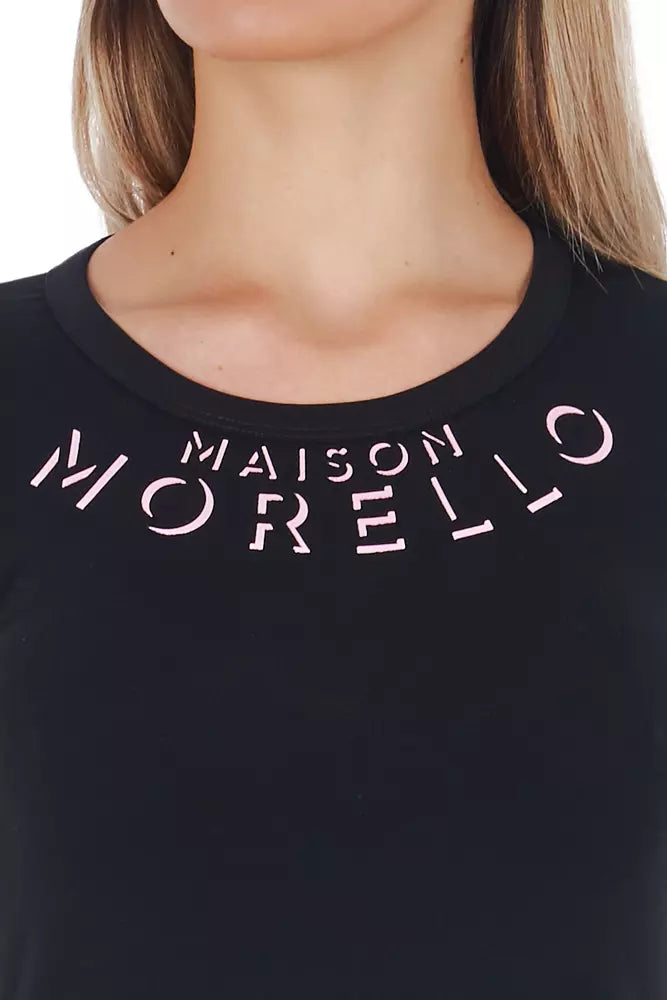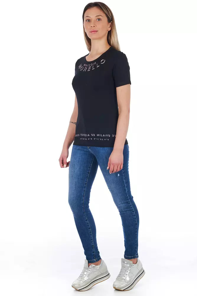 Indulge in the perfect blend of comfort and style with this sleek black t-shirt, featuring a chic front print and the signature Frankie Morello logo at the neck. Crafted from a premium cotton and elastane mix, this top offers a flattering fit while ensuring ease of movement. Ideal for a casual day out or a sophisticated layering piece.