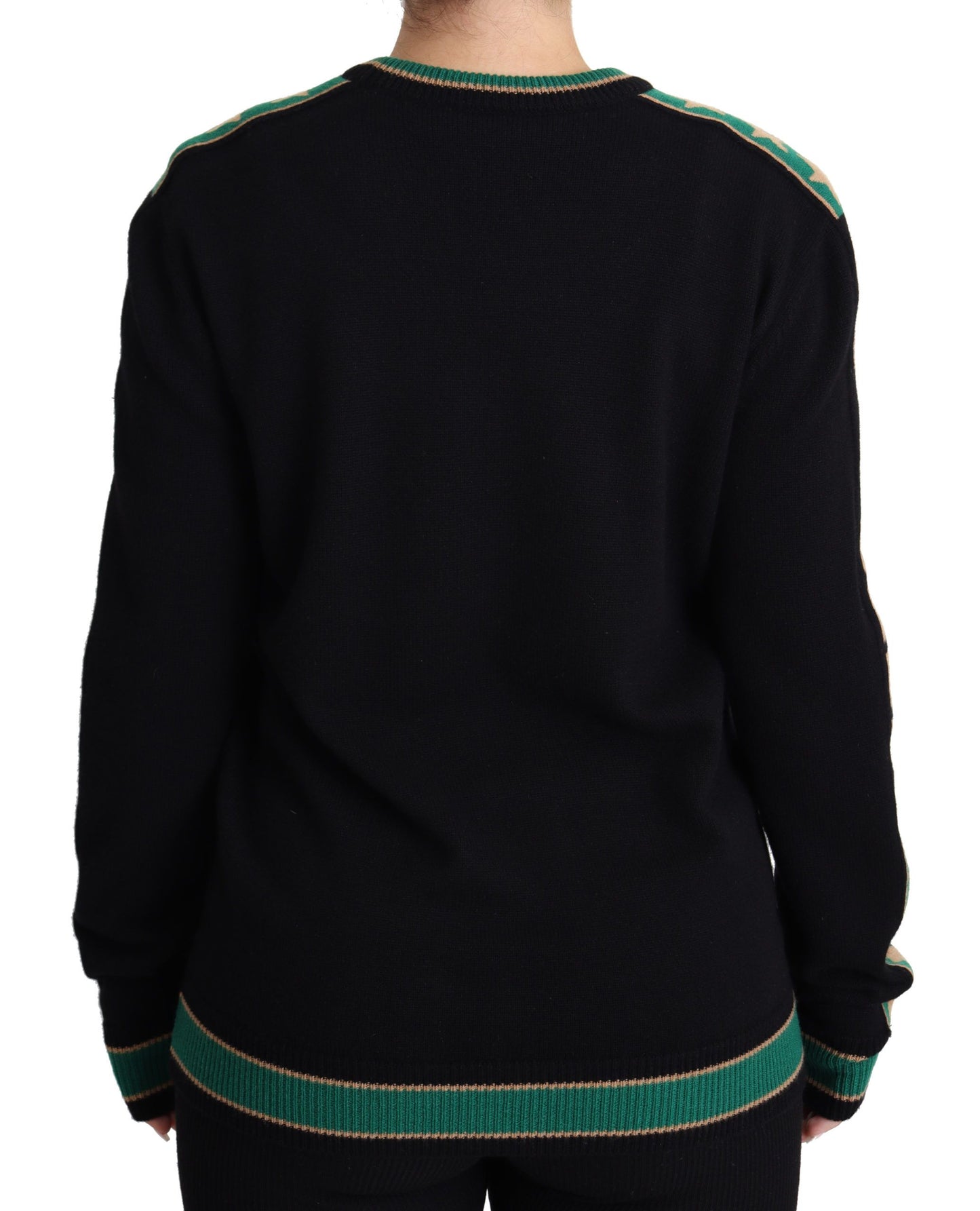 Step up your style game with this stunning Dolce & Gabbana black pullover sweater, featuring a chic beige and green DG Queen monogram on the sleeves. Made in Italy, this piece is not just a fashion statement but a testament to high-end craftsmanship. Crafted from luxurious 100% cashmere, this sweater promises to envelop you in warmth and sophistication. Perfect for those seeking exclusive elegance in their wardrobe.