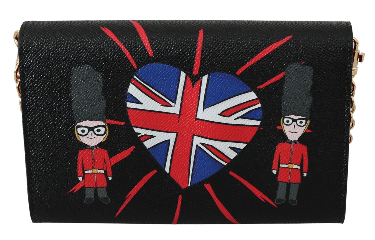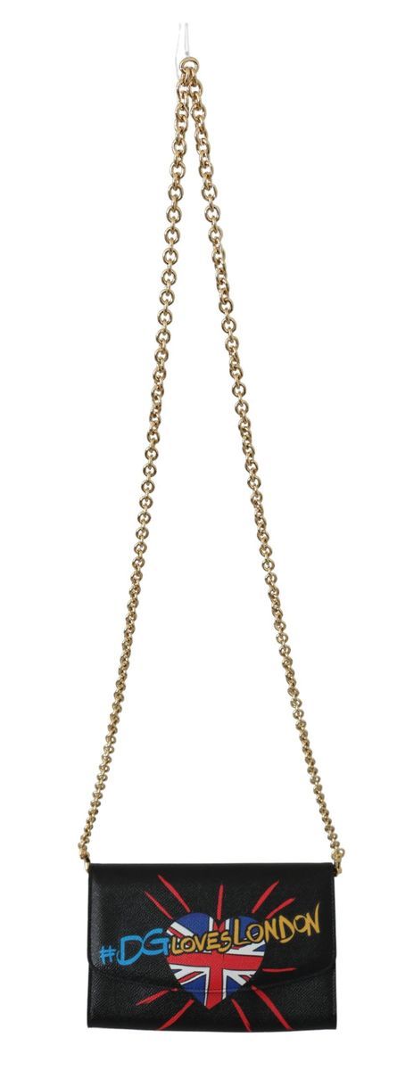 Elevate your style with this luxurious Dolce & Gabbana black leather shoulder bag. Exquisitely crafted in Italy, this bag features a magnetic flap closure with a vibrant red leather inner lining. It’s the perfect accessory with practicality to hold your cards, bills, and phone neatly. The detachable gold shoulder chain adds a touch of glamour, making it an ideal choice for both daytime elegance and evening sophistication. With its ‘DGLovesLondon’ print, this piece is as exclusive as it is stylish, reflecting high craftsmanship and attention to detail.