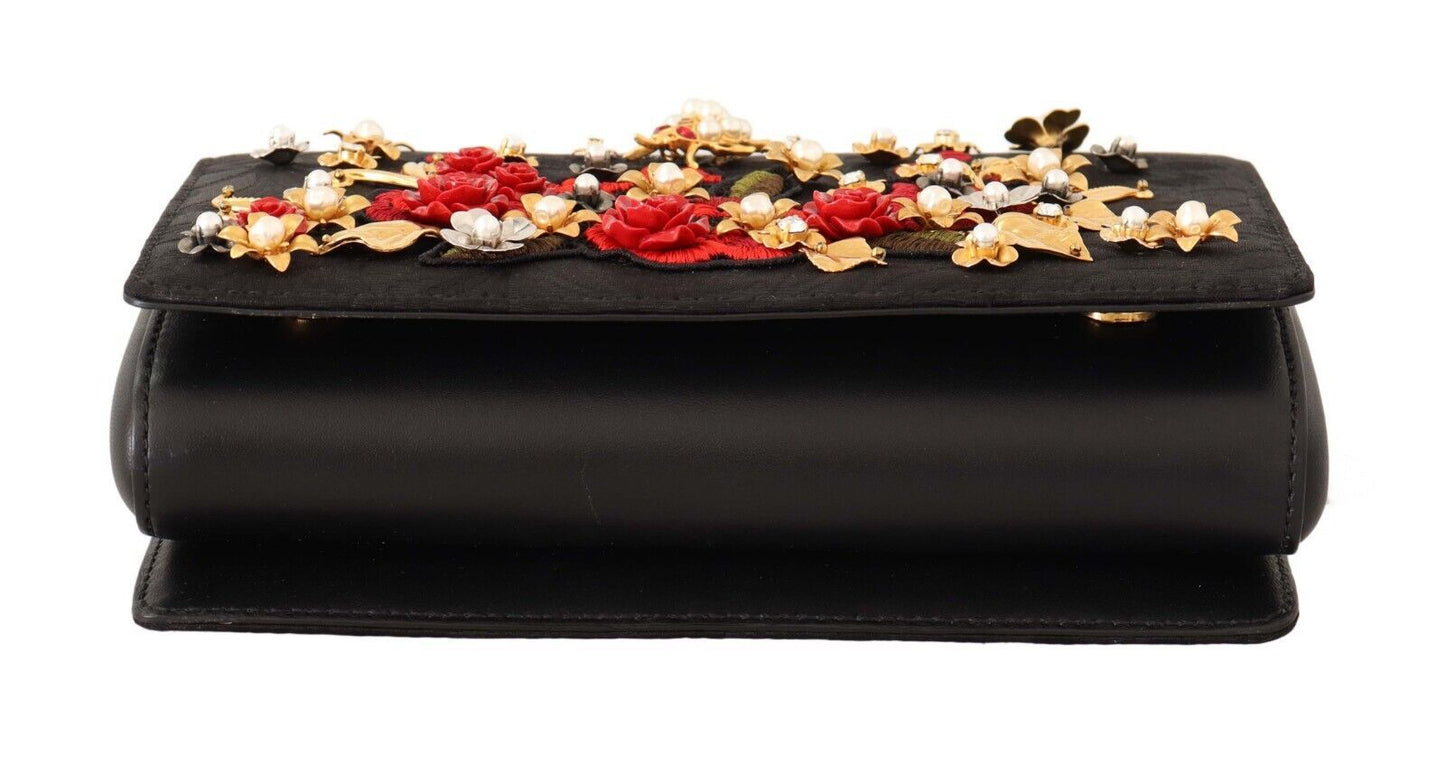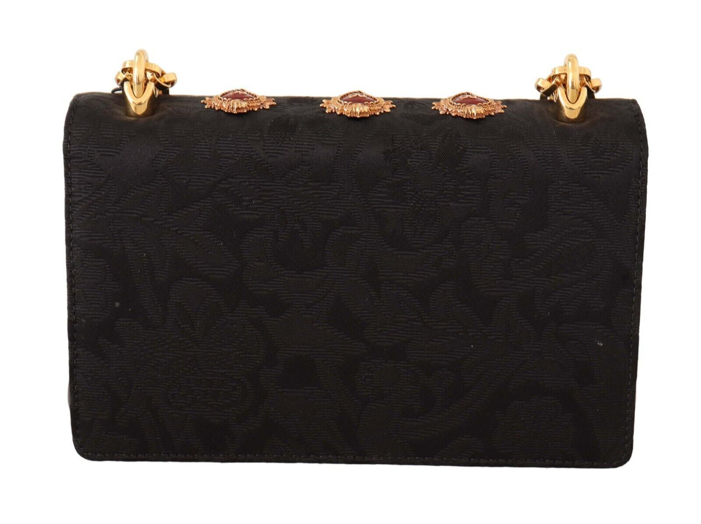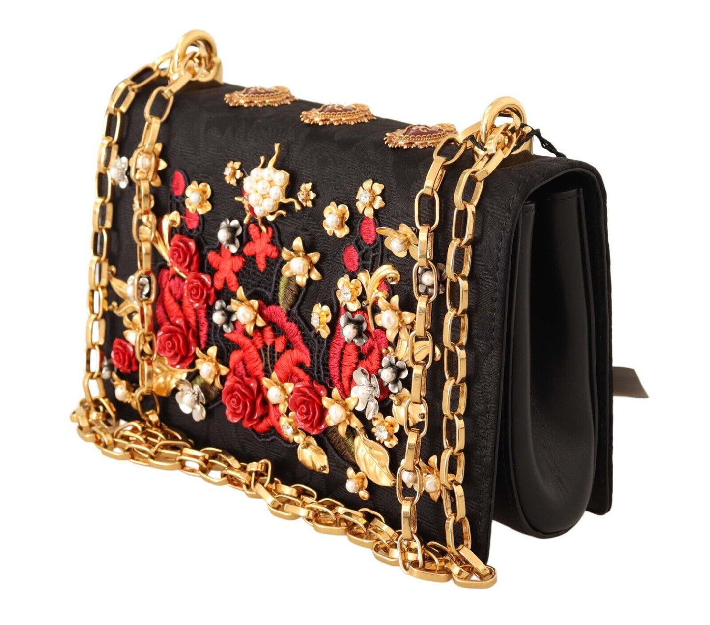 Exude elegance with this stunning black shoulder bag, crafted with meticulous attention to detail by the luxurious Dolce & Gabbana. The exquisite embellished brocade pattern is complemented by floral appliques and gold metal hardware, making it a standout piece. Perfect for any glamorous occasion, it features a magnetic snap-fastening front flap and a chic chain shoulder strap for versatile wear.