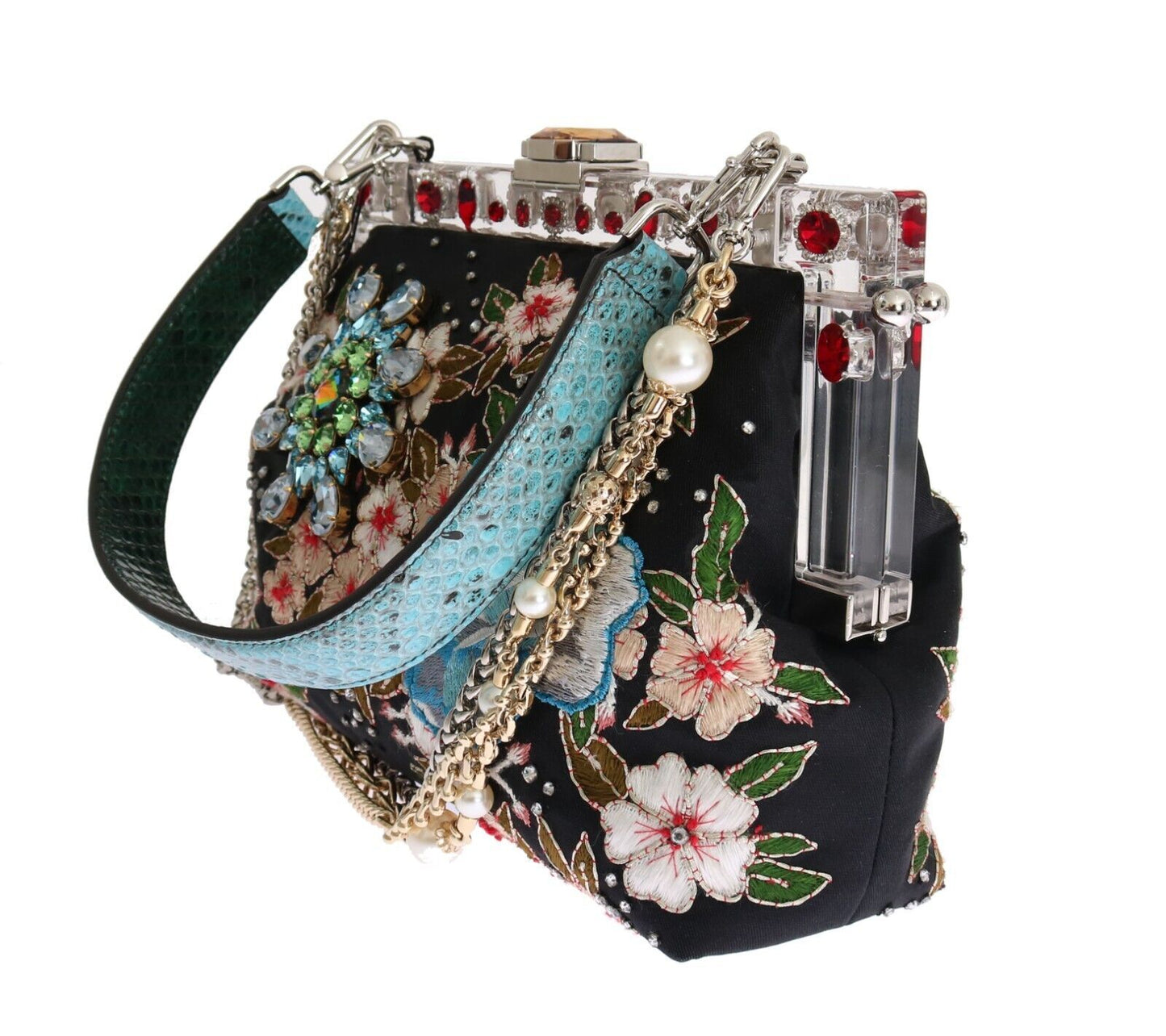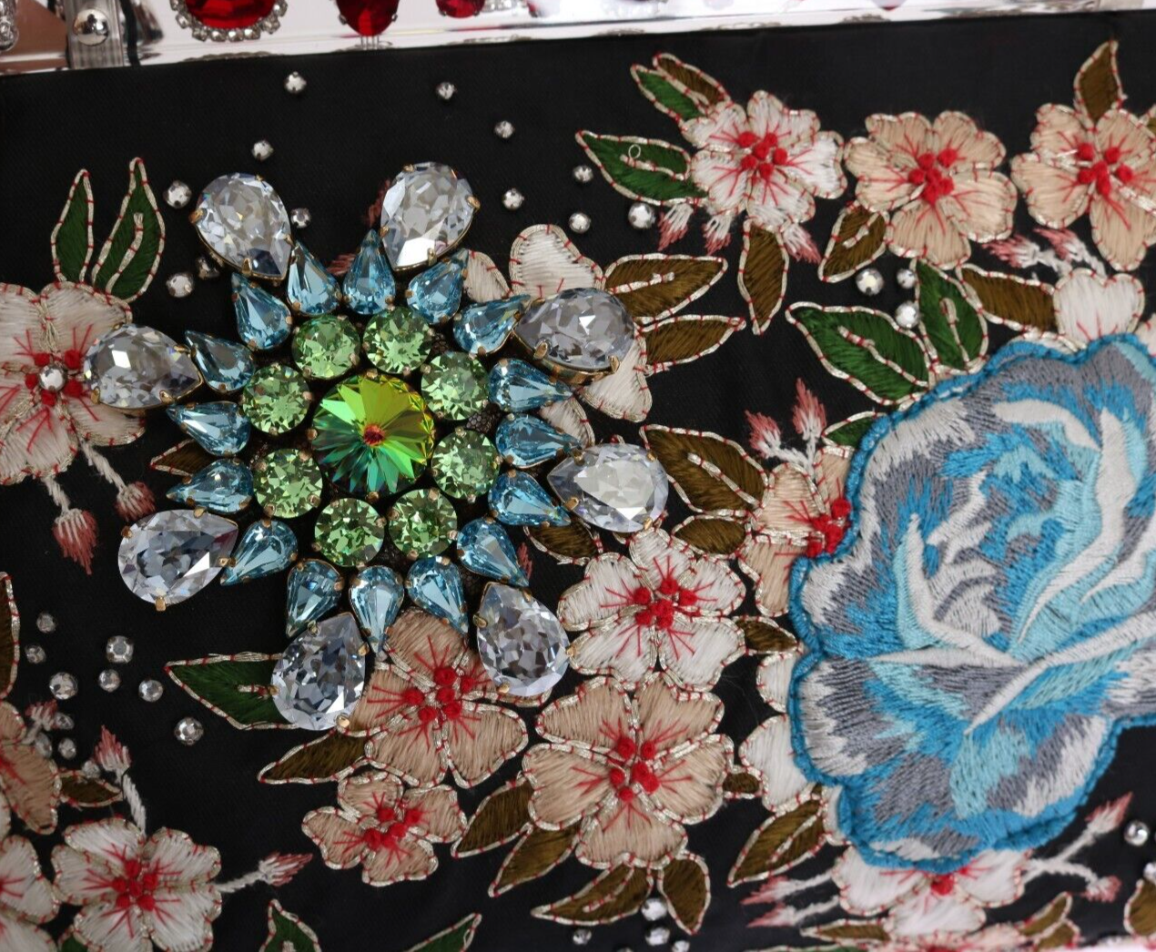 Exude sophistication at your next soiree with this exquisite VANDA evening clutch by Dolce & Gabbana. A seamless blend of luxury and style, this clutch is beautifully crafted in black silk, featuring an opulent mix of silver and gold metal accents, along with a stunning array of multicolor crystal floral embellishments and fine embroidery.