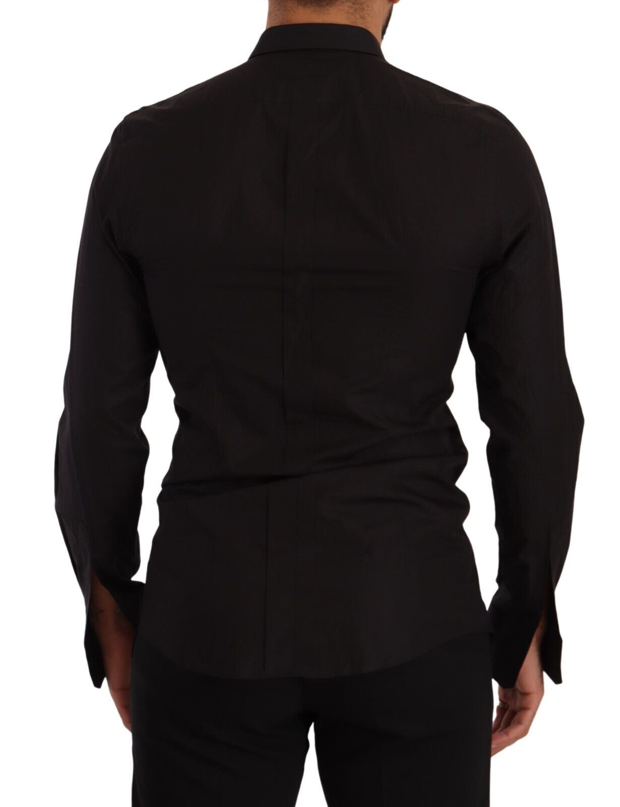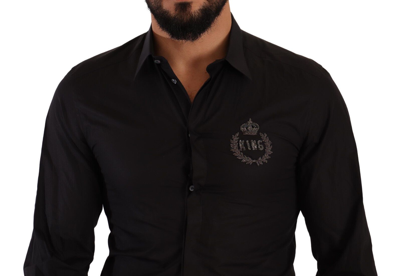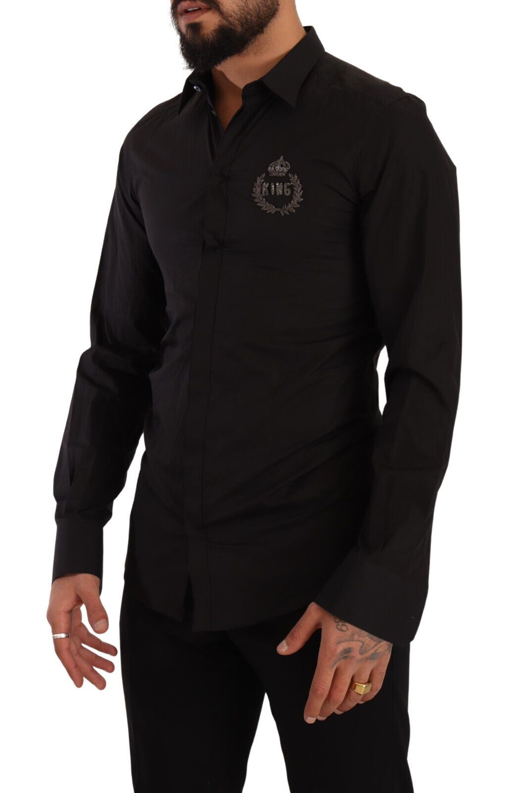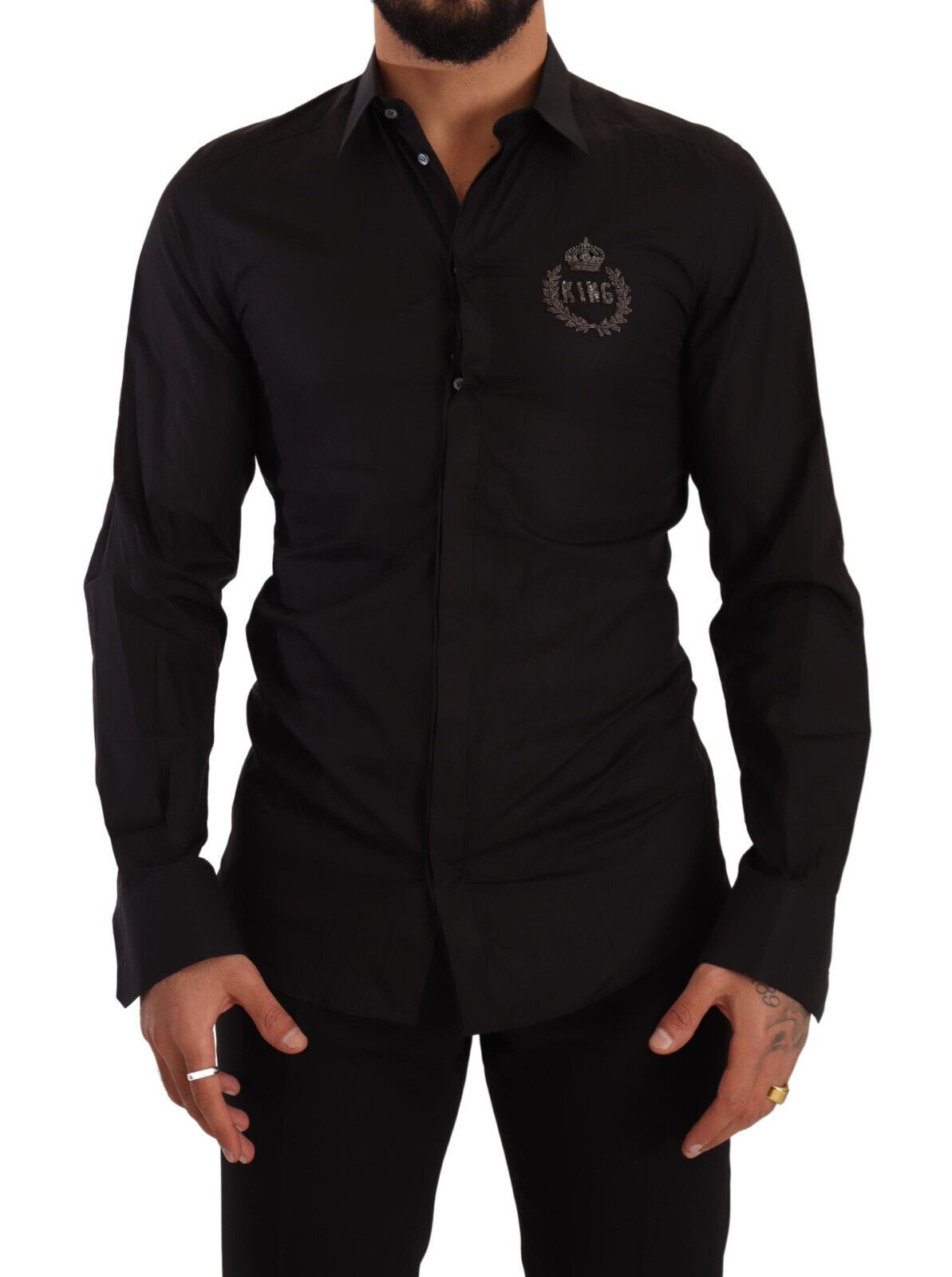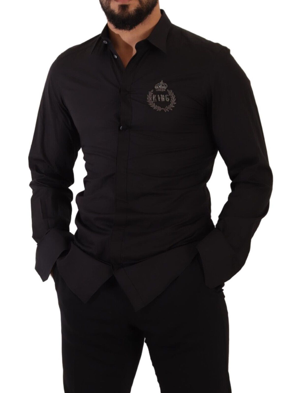 Exude sophistication with this absolutely stunning, 100% Authentic Dolce & Gabbana dress shirt. Crafted with the finest cotton, this slim fit shirt boasts a sleek black color, complemented by regal crown king embroidery on the chest. Its classic neck and front button closure enhance its timeless elegance, making it a perfect choice for the discerning gentleman.
