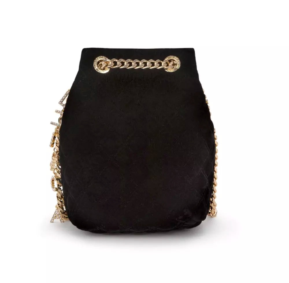 Discover elegance and sophistication with our Chic Velvet Mini Bucket Bag, perfect for adding a touch of luxury to any outfit. This stunning bag features a plush quilted velvet design, paired with a striking metal gourmette chain for a dash of glamour. Adorned with eye-catching metal and rhinestone charms, it will sparkle and catch the light with every move. The unique adjustable lock in a faceted cube shape ensures your belongings stay secure with style. Inside, the synthetic suede-effect lining provides a luxurious feel, while the yellow gold coloured metal accents offer the perfect finishing touch to this exquisite accessory.