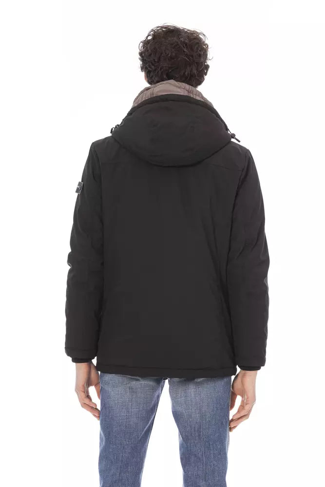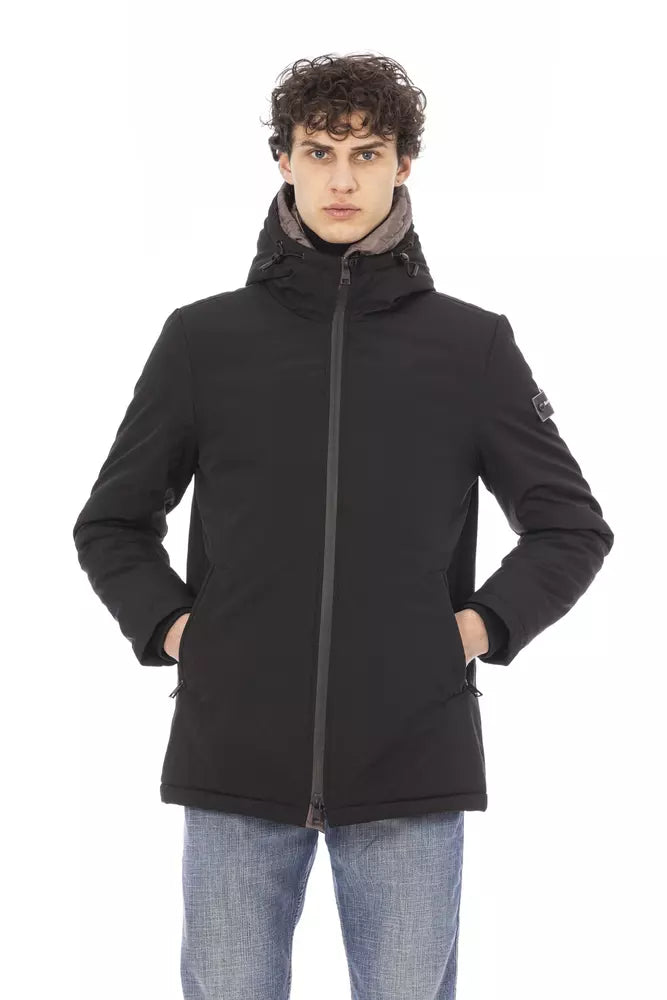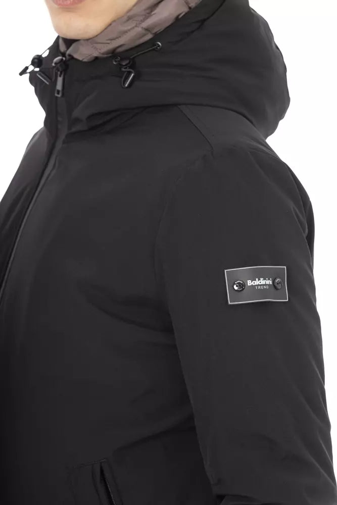 Step into the world of sophisticated style with this sleek black long jacket by Baldinini Trend. It features a subtle monogram pattern that exudes elegance, paired with external welt pockets for functionality and style. The internal double-breasted design adds a layer of classic charm, while the front closure includes a zipper with a distinctive puller, ensuring ease of wear without compromising on fashion. Perfect for contemporary men who appreciate a touch of luxury in their wardrobe.