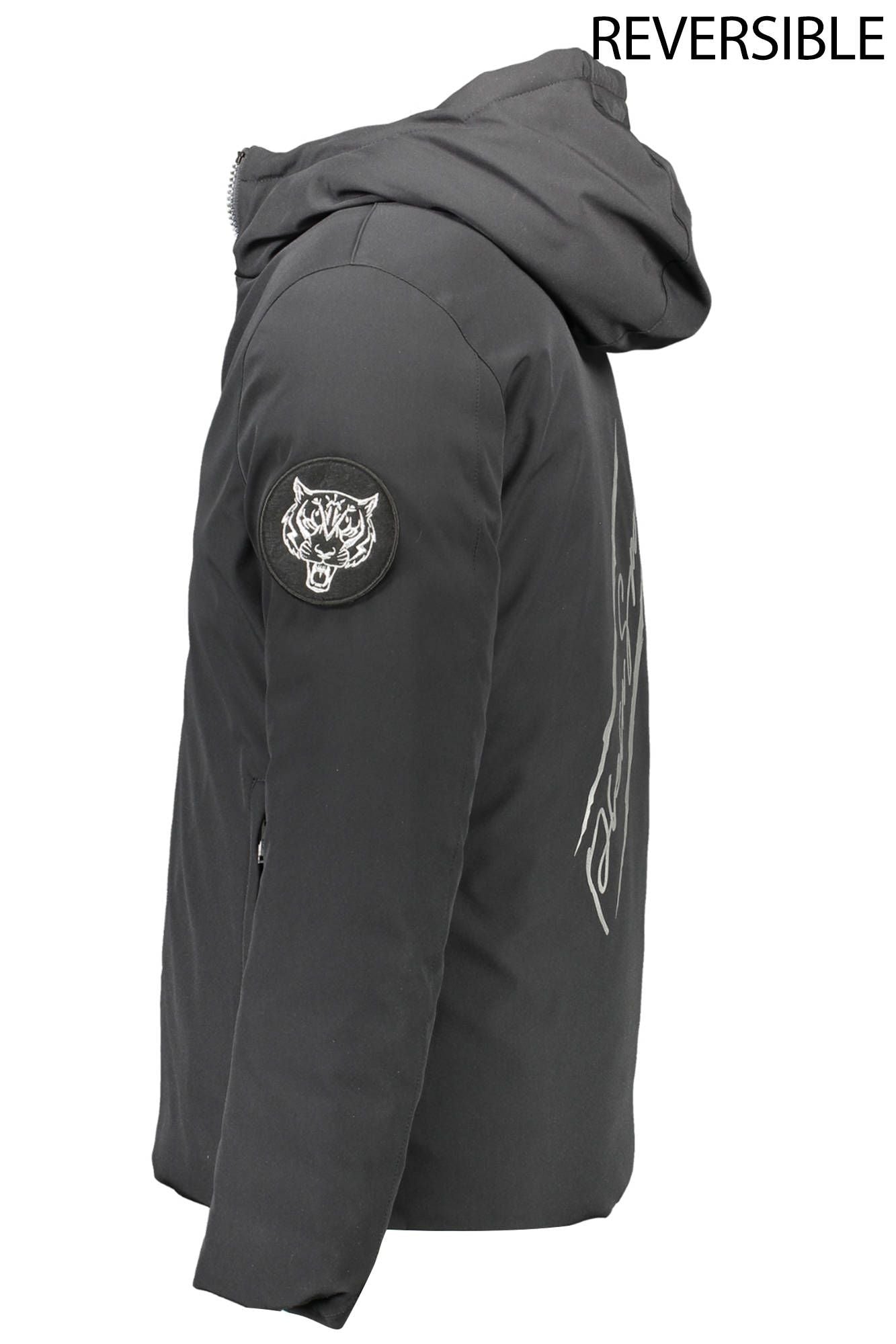 Discover the ultimate combination of style and flexibility with our reversible long-sleeved jacket. Ideal for the trendsetting individual, this piece features a practical hood, multiple pockets for essentials, and a secure zip closure. Adorned with striking prints, applications, and the distinctive Plein Sport logo, this jacket is a testament to your luxurious taste. Crafted from high-quality materials, it promises durability and comfort in any weather.