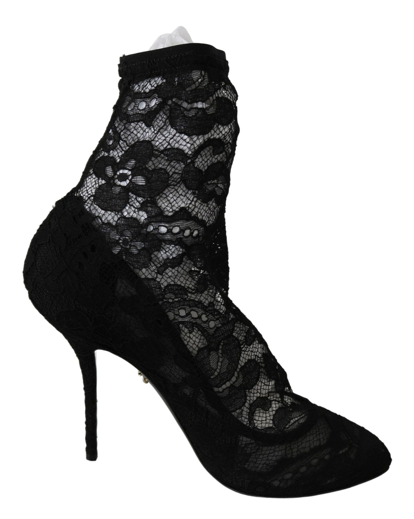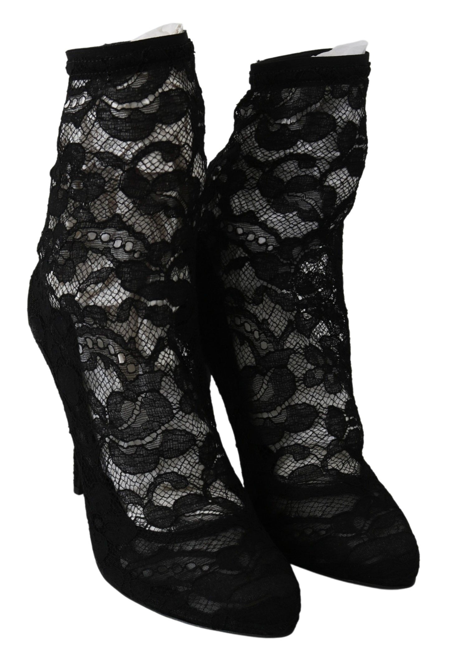 Step out in sophisticated style with these stunning high heel pumps from Dolce & Gabbana. Crafted with exquisite black nylon floral lace, these luxury boots offer both comfort and high-end quality, perfect for any elegant occasion. Made with love in Italy, these pumps feature a beautiful lace design and a refined leather sole, complete with subtle logo details for an unmistakable touch of class.