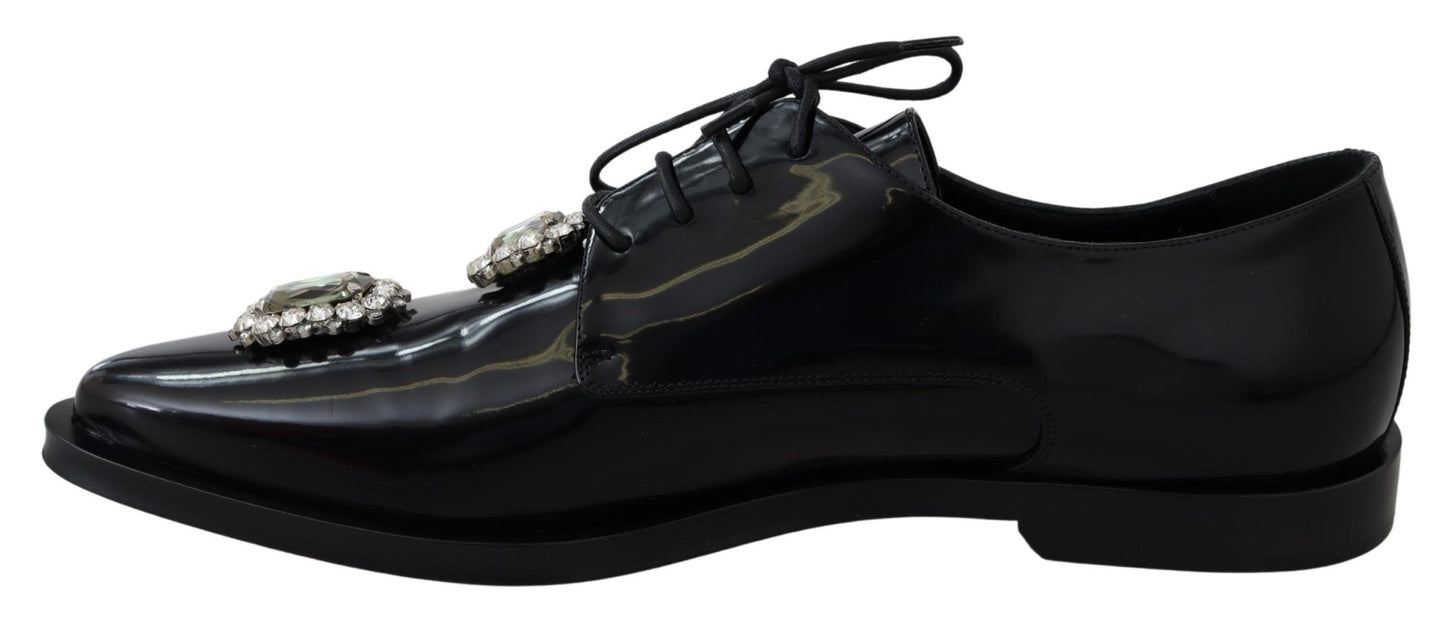 Step into luxury with these stunning Dolce & Gabbana Derby dress shoes. These black leather shoes are adorned with white and gray crystals that add a touch of elegance to any outfit. The gold embossed DG monogram on the low heel infuses these flats with the brand’s signature opulence. Made with high Italian craftsmanship, these shoes are as exquisite as they are comfortable, ensuring you stand out in any setting.