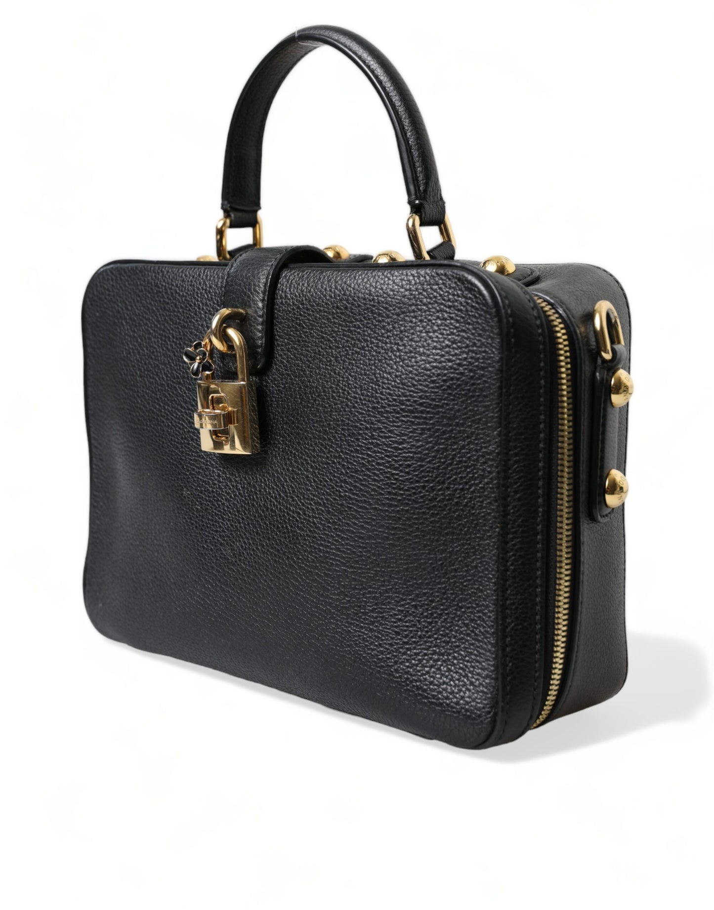 Gorgeous brand new with tags, 100% Authentic Dolce & Gabbana handbag. Crafted from black leather, it is enhanced with gold-tone hardware. The bag features a top handle and a delicate floral embellishment on the lid fastening. The fabric-lined interior is well sized and secured with a zip closure.