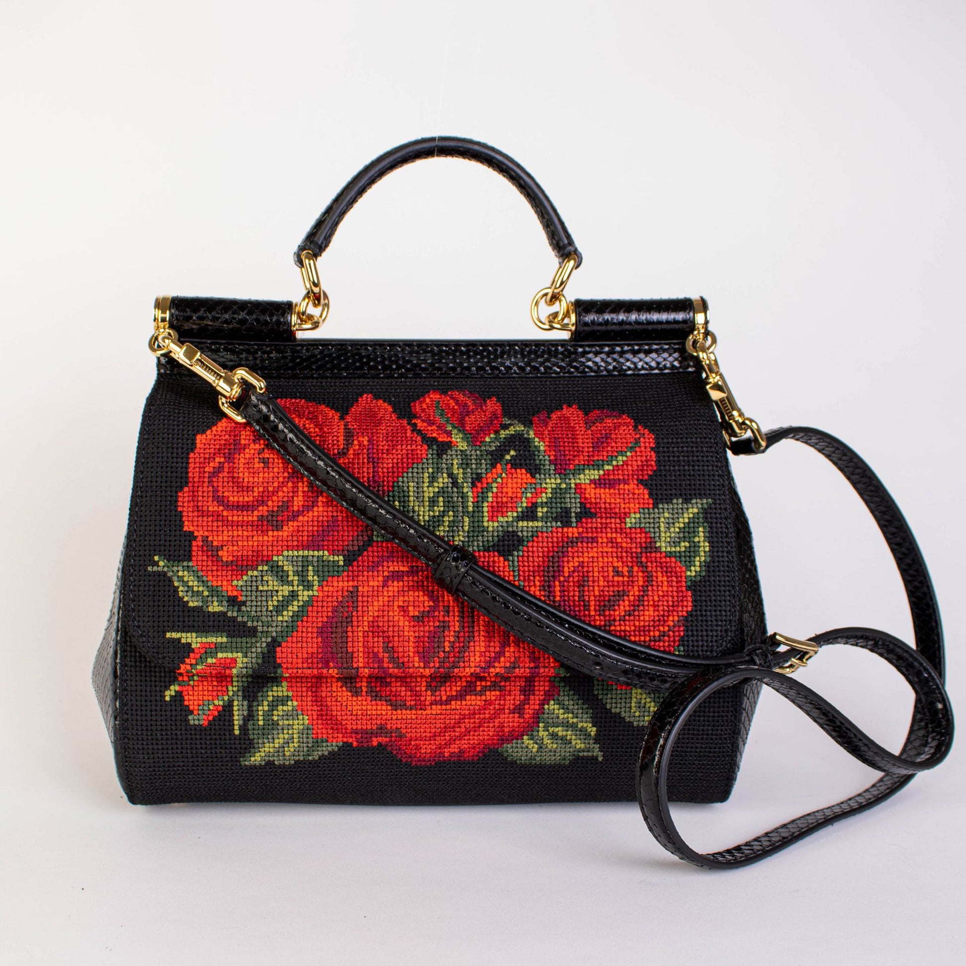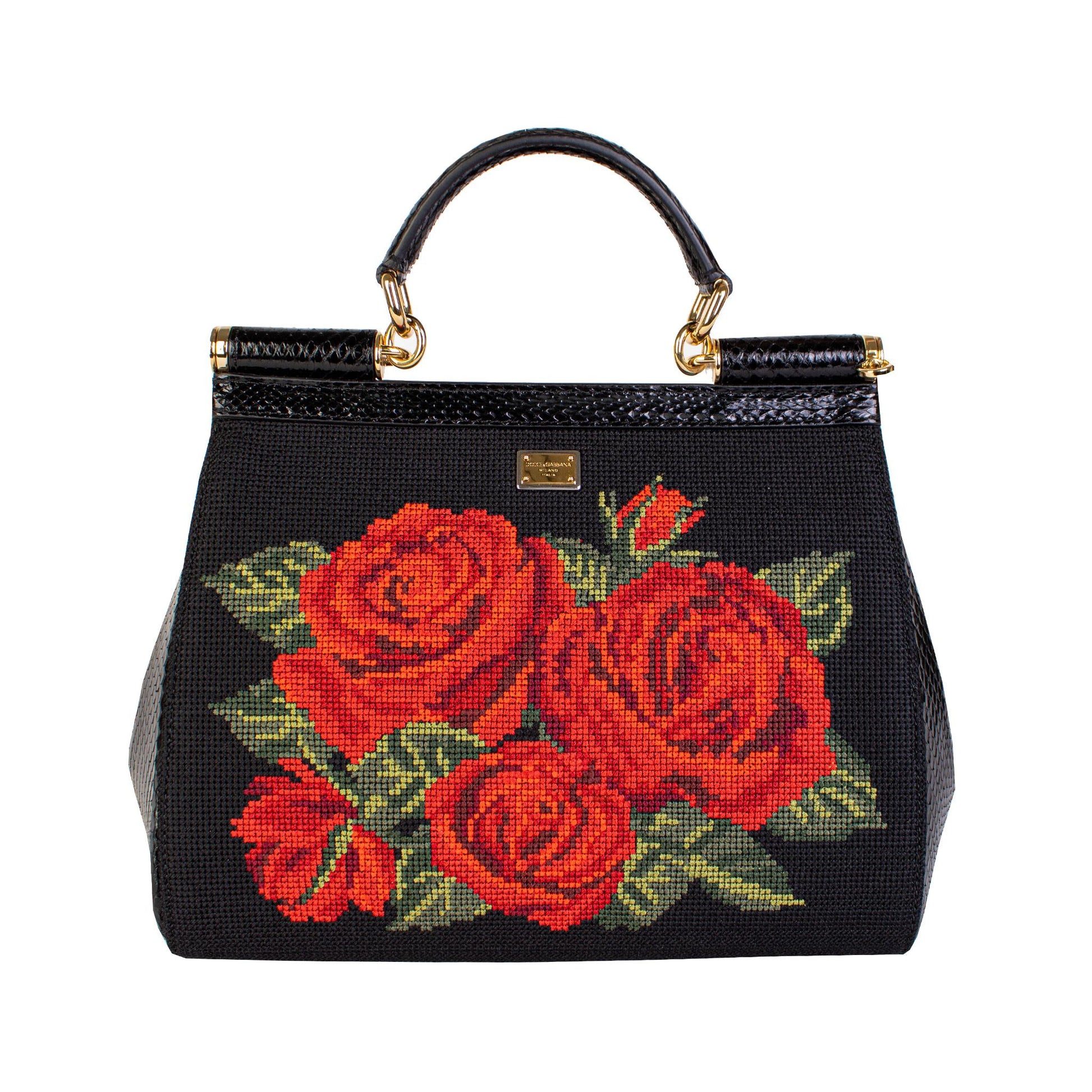 Indulge in the opulence of the Dolce & Gabbana Roses Cross Stitch Handbag, a stunning blend of high fashion and functional elegance. This exquisite bag is brand new with tags, showcasing luxurious cross-stitched roses that add a touch of romantic flair. Crafted from premium leather with crocodile leather accents on the sides, this handbag makes a definitive style statement. Its design features a removable strap for versatile carrying options, an internal zipped pocket to keep your essentials secure, and a chic closure with dual automatic, covered buttons. Every detail speaks of the exceptional Italian craftsmanship behind this accessory, making it a must-have for any fashion connoisseur.