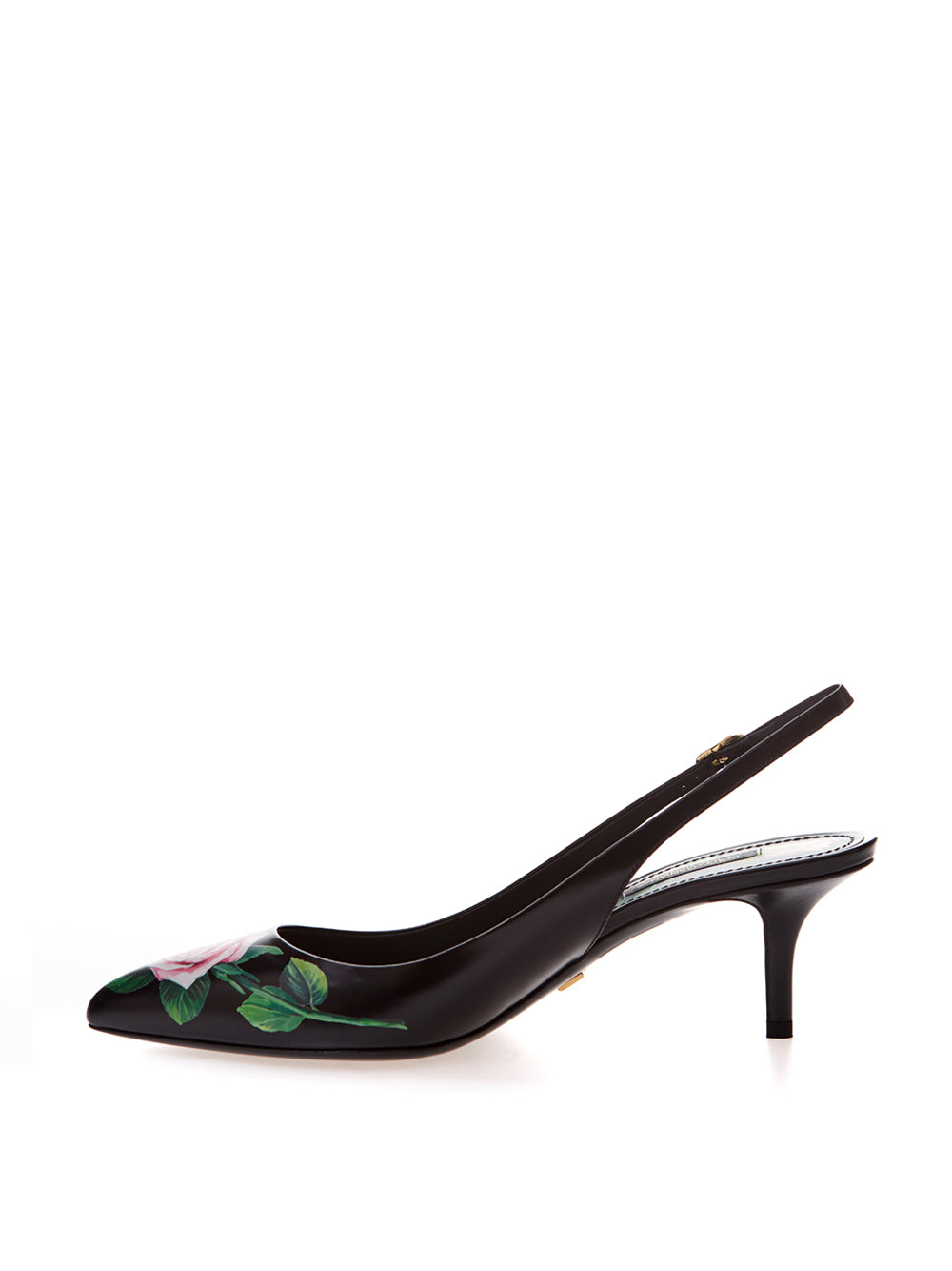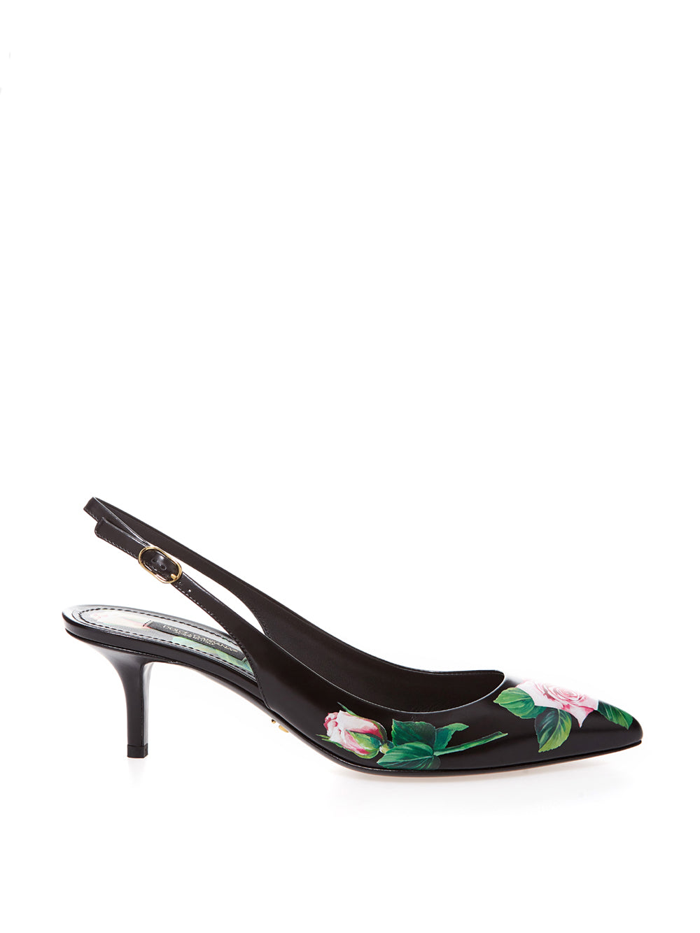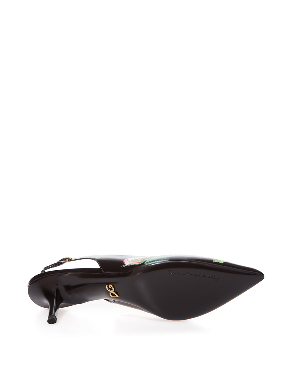 Step into luxury with these sophisticated and stunning Dolce & Gabbana black leather slingback heels. Accented with an enchanting floral print, they feature a chic buckle closure and a beautifully designed printed inner sole. Perfect for any glamorous occasion, these Italian-crafted heels offer both exceptional style and a comfortable regular fit.