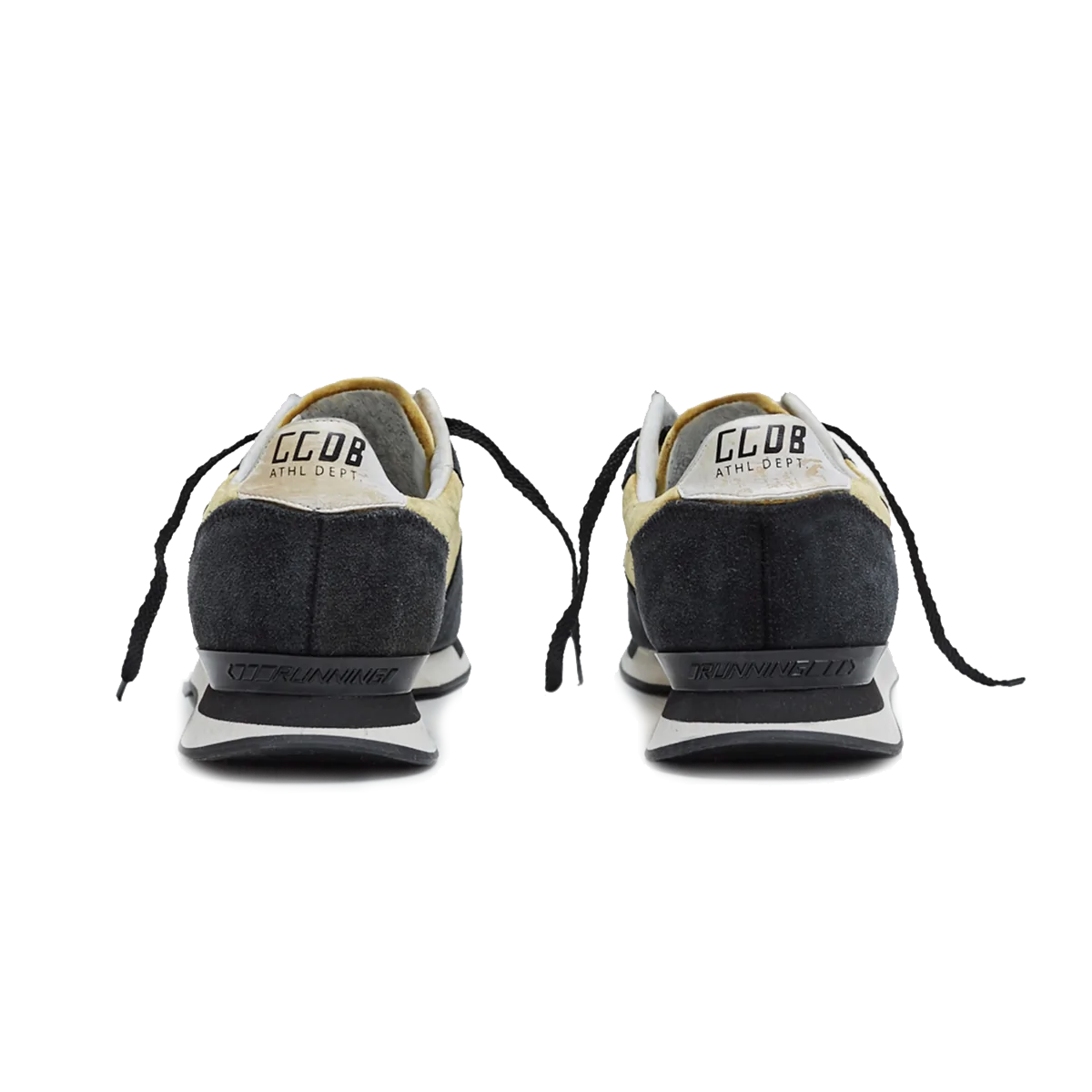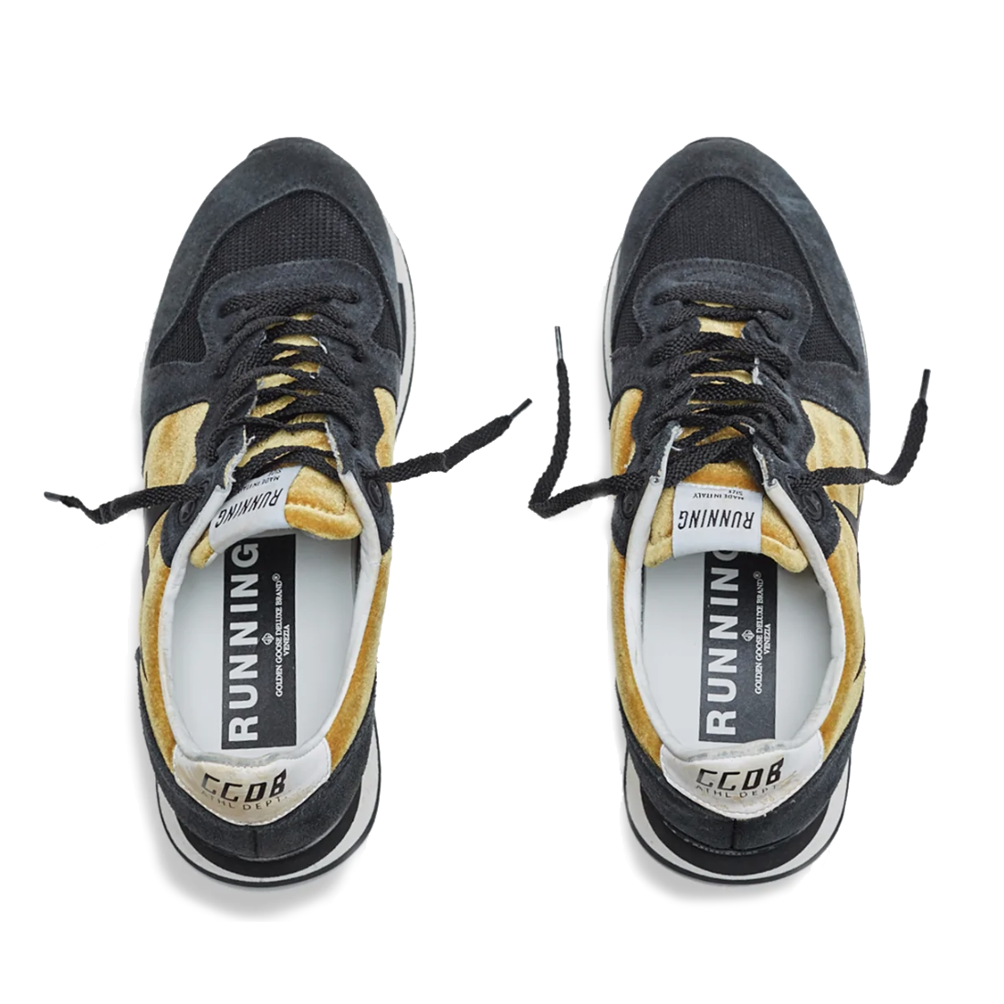 Step into luxury and style with these exceptional men’s sneakers, crafted from premium black suede calfskin and accented with eye-catching mustard-colored velvet sides. A white leather heel counter featuring a printed logo adds a distinct touch of elegance. Designed for both comfort and durability, they come with a robust rubber sole. These sneakers are a testament to impeccable Italian craftsmanship.