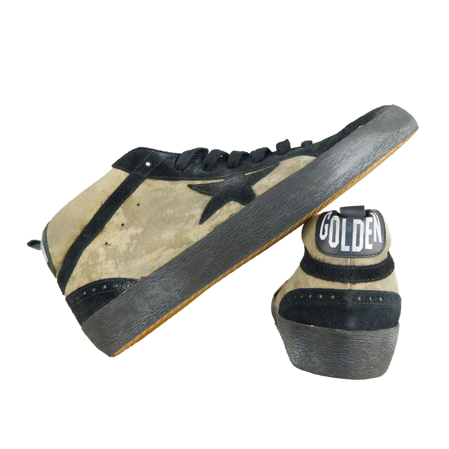 Step up your footwear game with these stylish men’s sneakers crafted from black and beige suede calfskin for a refined aesthetic. The iconic black leather star logo enunciates exclusivity, while the heel boasts a subtle yet sophisticated ‘Golden’ print, adding a touch of luxury. Durably designed with a robust black rubber sole, these made-in-Italy sneakers epitomize both comfort and high-fashion.