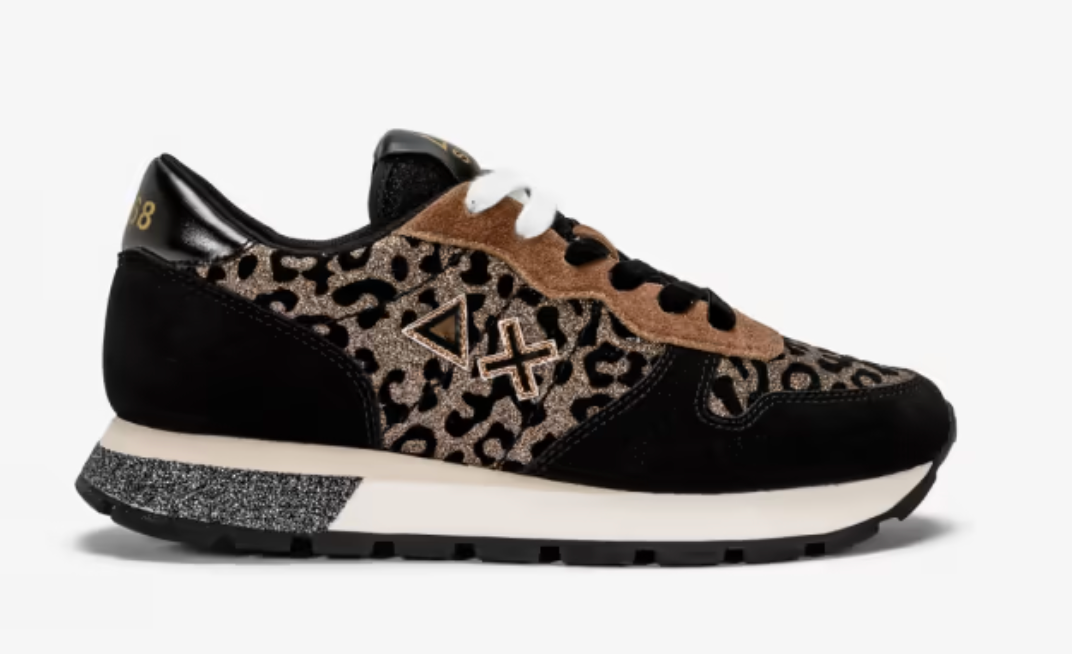 Step into a blend of comfort and style with these chic sneakers designed for the modern woman. These sneakers feature a sleek black color enhanced by dazzling animalier glittery details that capture the light and eyes of onlookers. Luxurious leather inserts add a touch of elegance, while the prominent logo on the side showcases your taste for refined design. Perfect for any casual or upscale casual ensemble.