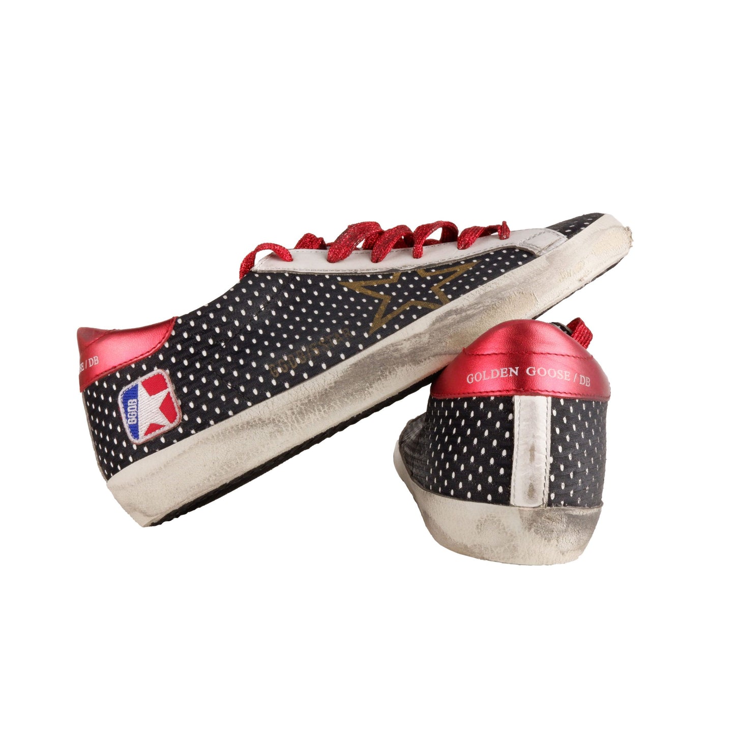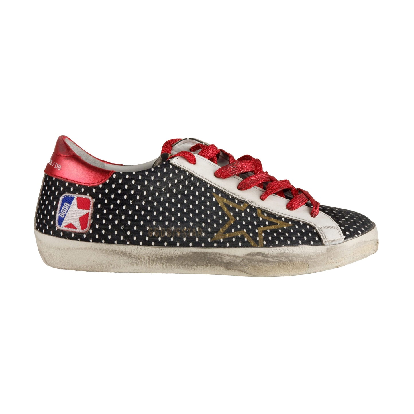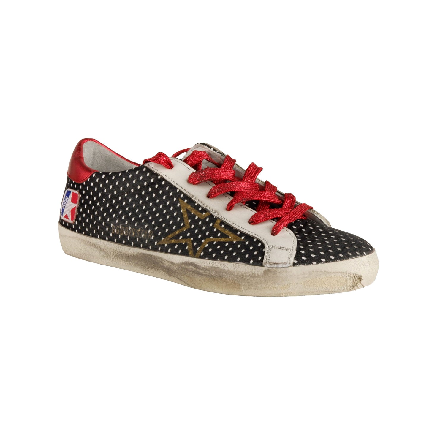 Step into unmistakable style and comfort with these high-end leather sneakers, expertly crafted and enveloped in sleek black mesh fabric. Featuring eye-catching red glitter laces that add a pop of sparkle with every step, teamed with a signature stitched star logo for that mark of exclusivity. A chic red patent leather at the back brings a bold contrast, while the durable rubber sole offers lasting wear. Indulge in Italian craftsmanship designed for the fashion-forward individual.