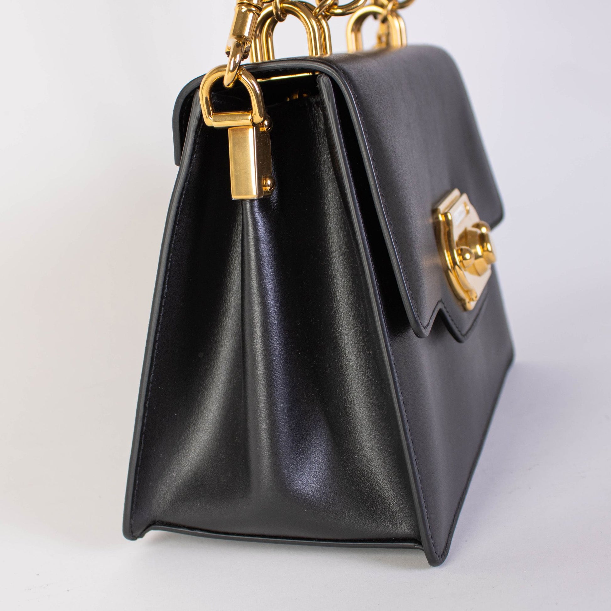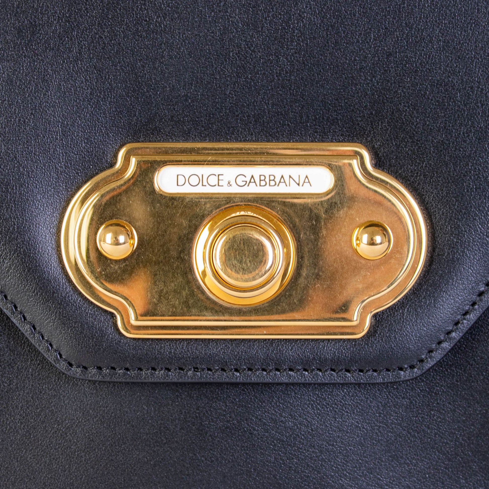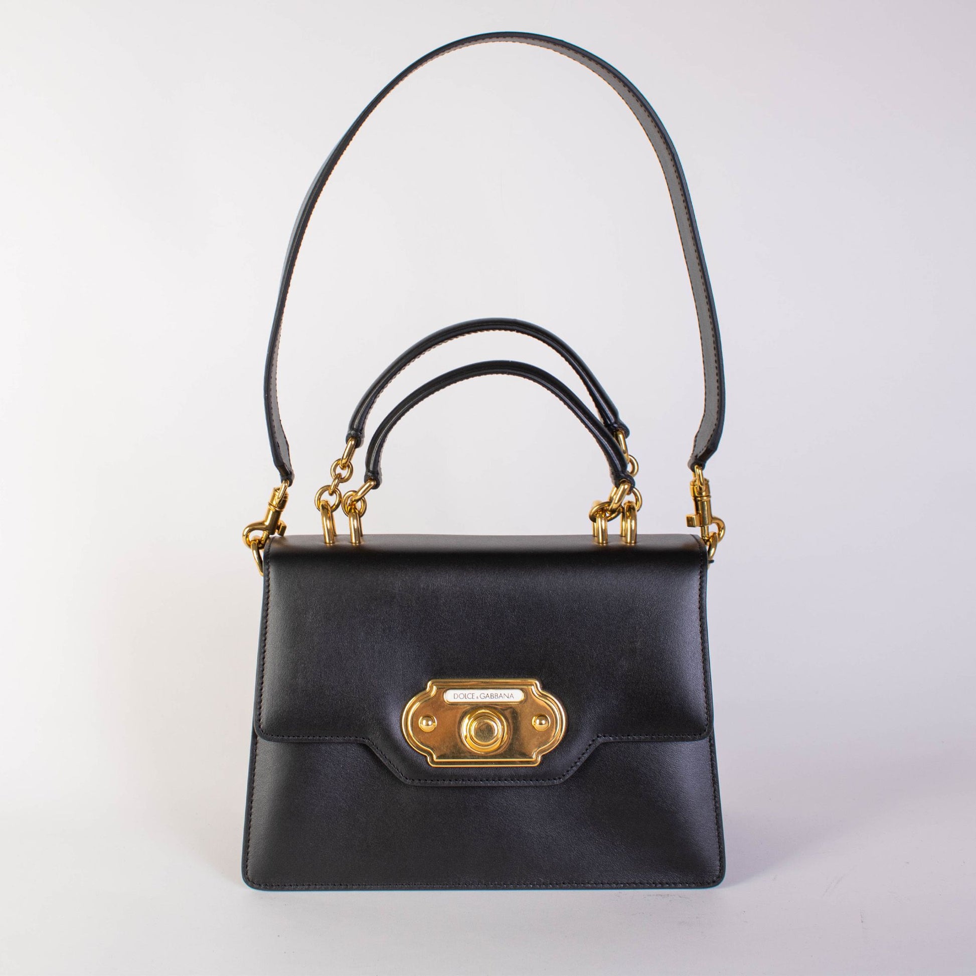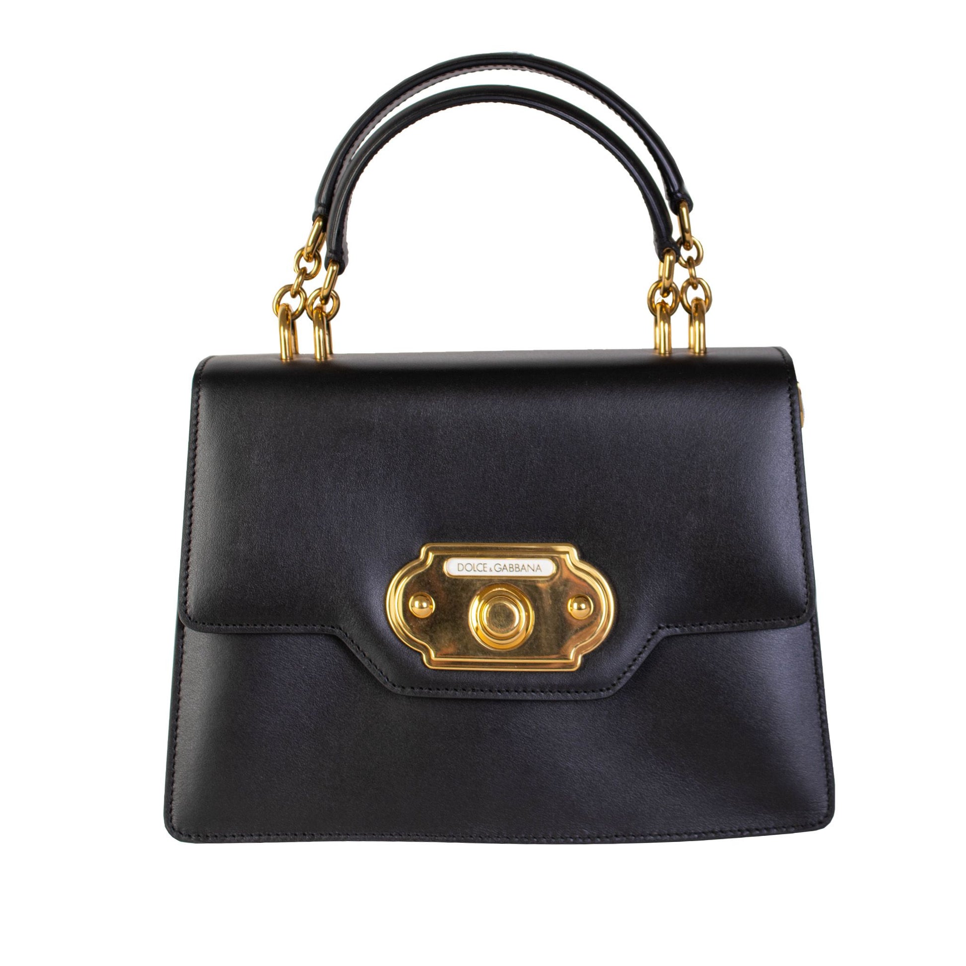 Step out in style with this exquisite, brand new Dolce & Gabbana black leather Welcome handbag. Known for luxury and elegance, this piece features a chic doorbell closure with an automatic button, ensuring both sophistication and security for your essentials. The interior boasts practical pockets, while the removable strap offers versatile carry options for every occasion.