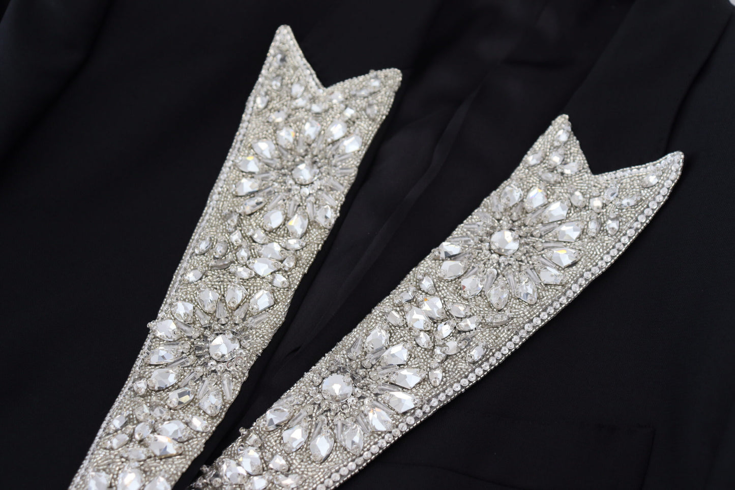 - Details: Two outside pockets, black silk inner lining, one open vent in the back