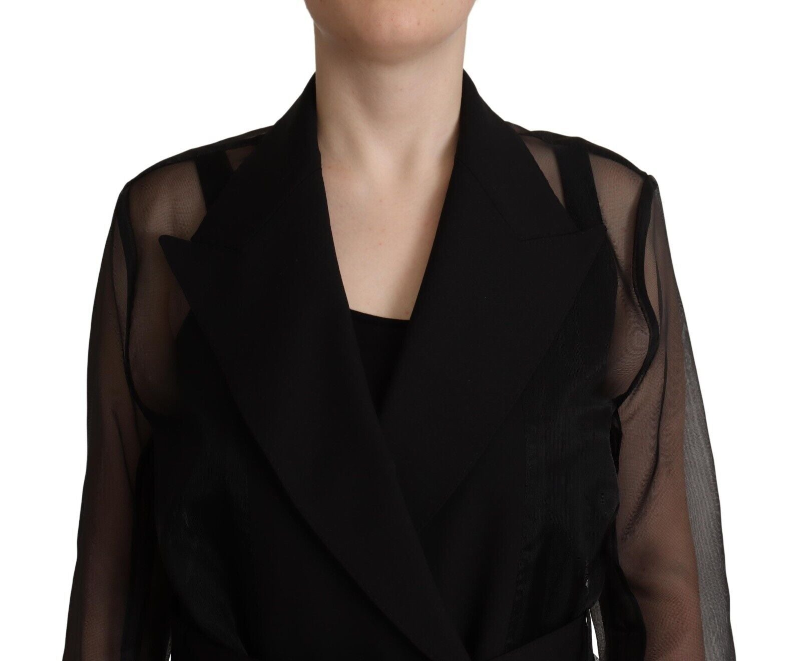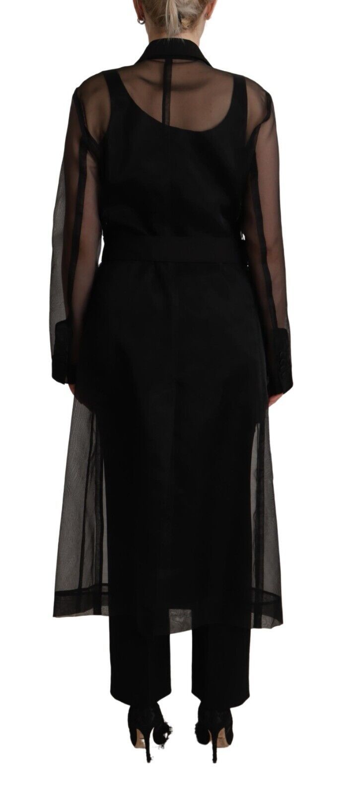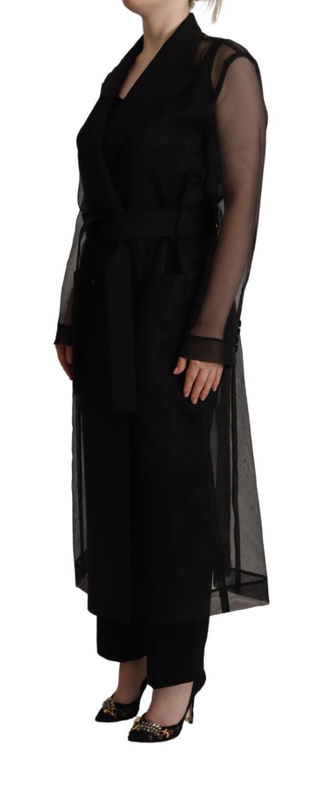 Step out in style with this sophisticated and modern trench coat jacket from Dolce & Gabbana. Crafted with utmost care in Italy, this stunning coat boasts a see-through design made from a luxurious nylon blend, with the highlight on its tasteful black hue that promises to elevate any outfit. Featuring long sleeves, along with classic button and belt closure, it’s the perfect blend of fashion-forward design and timeless elegance.