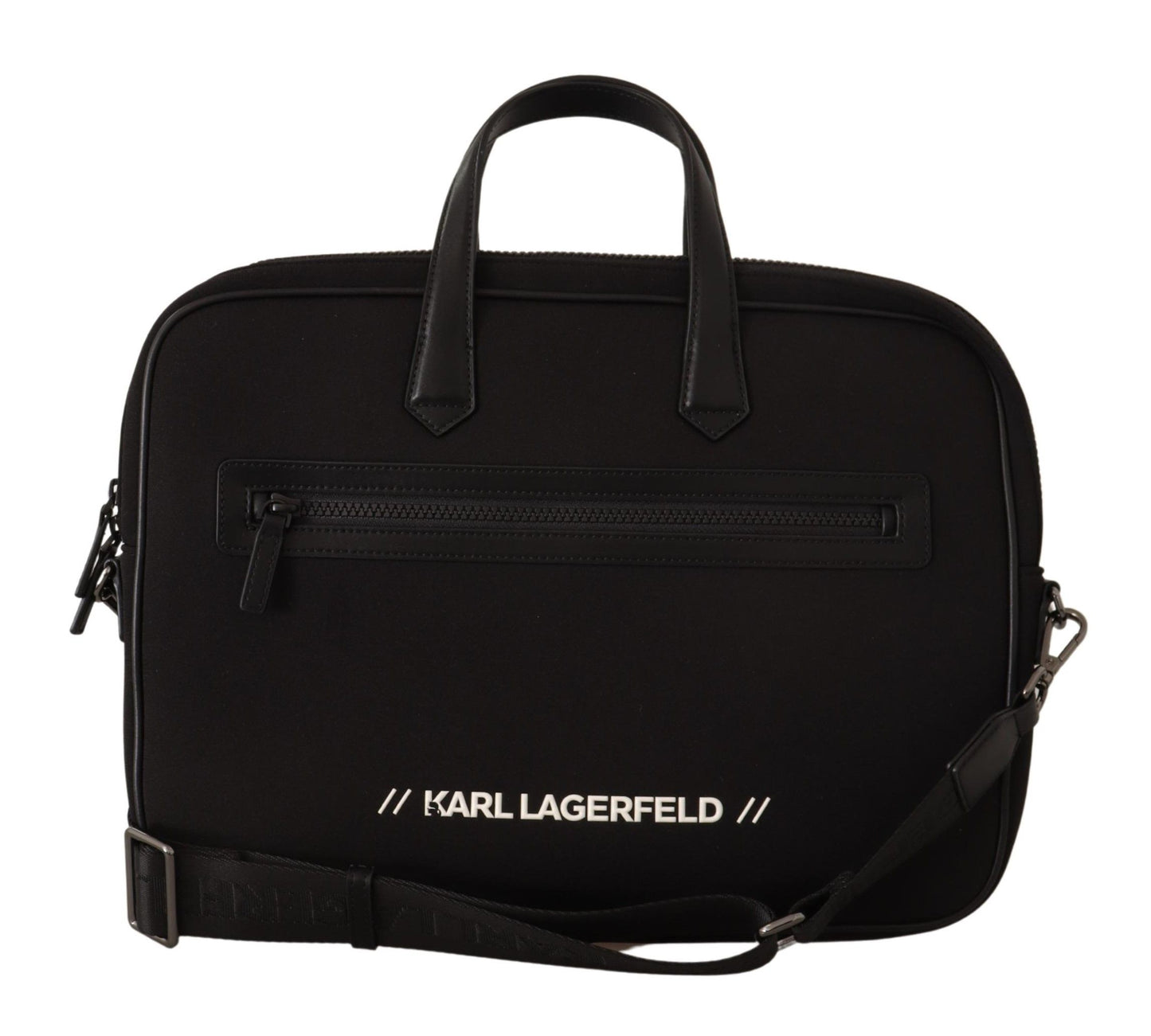 Elevate your accessory collection with this stunning, brand new laptop crossbody bag by Karl Lagerfeld. Designed for the modern professional, this bag combines functionality with high fashion. It exhibits a sleek black nylon construction that ensures durability while maintaining an air of elegance. A spacious design with two main compartments alongside the secure zip and snap closure keeps your tech safe and organized on the go. Personalize your carrying style with the removable and adjustable shoulder strap that offers versatile shoulder or crossbody wear. Sport the iconic Karl logo as a statement of luxury and style.