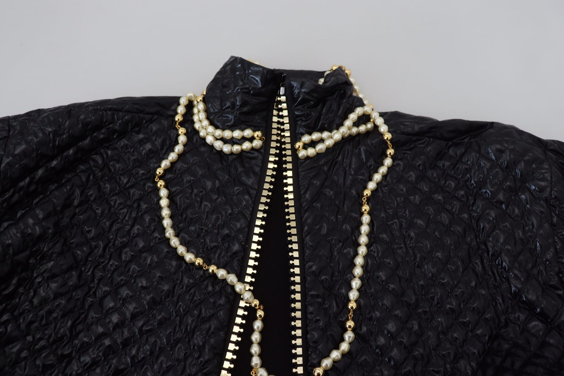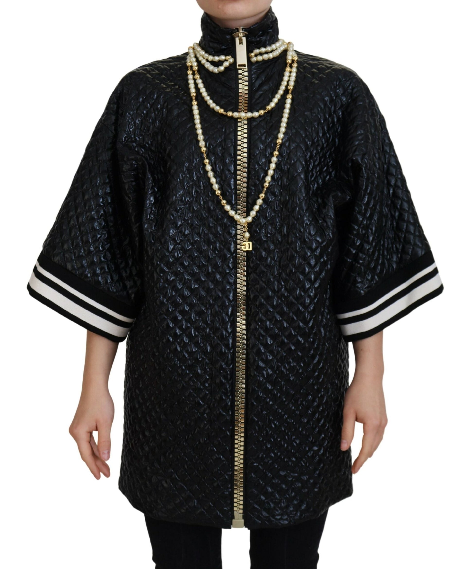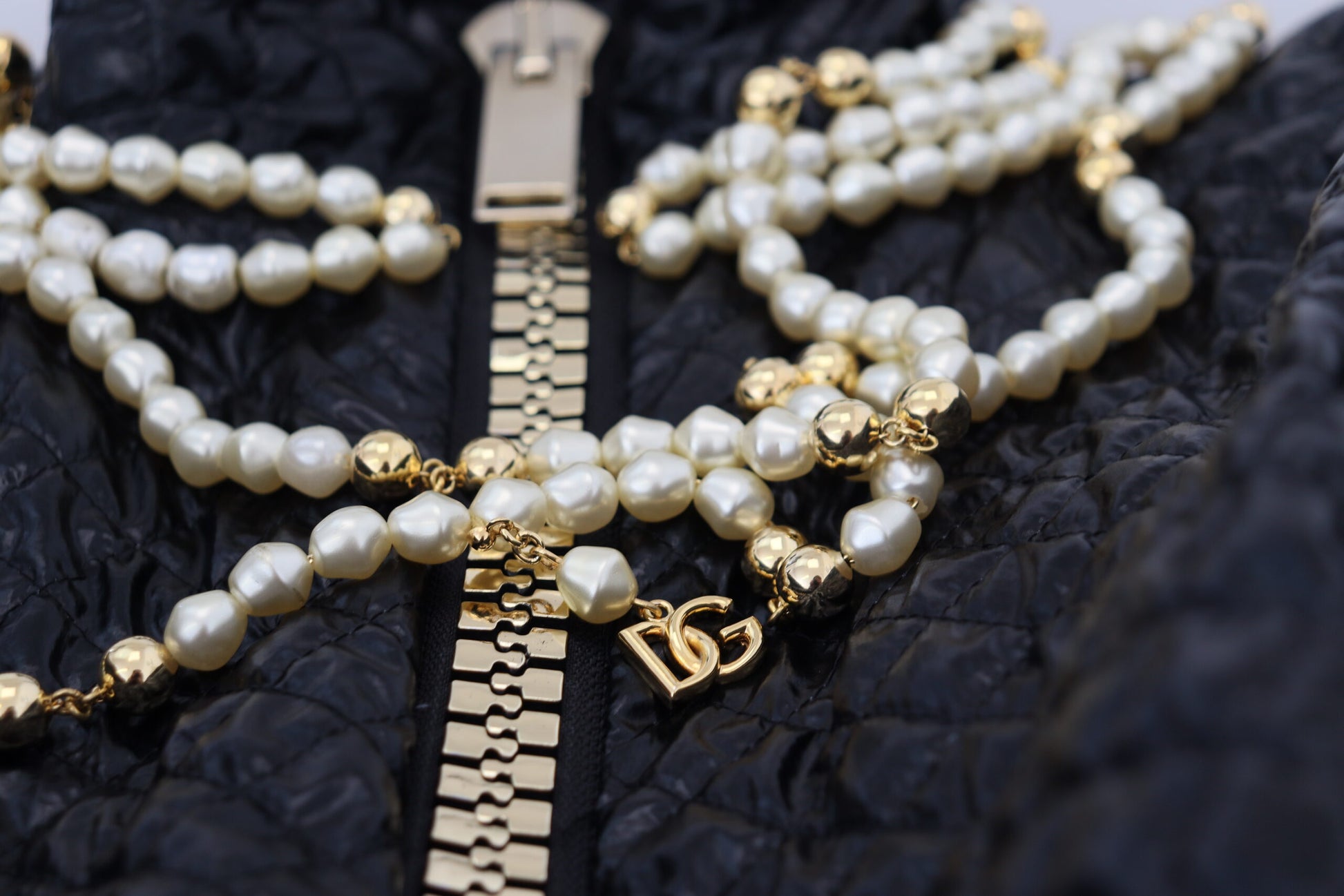 Adorn your wardrobe with the essence of luxury and elegance with this gorgeous full zip sweater, brand new with tags from the high-fashion house of Dolce & Gabbana. Crafted with fine soft nylon, this sweater boasts a chic black color complemented by exquisite pearl embellishments, adding a touch of sophistication to your attire. Exquisitely made in Italy, this sweater features the iconic logo that represents the pinnacle of style and craftsmanship.