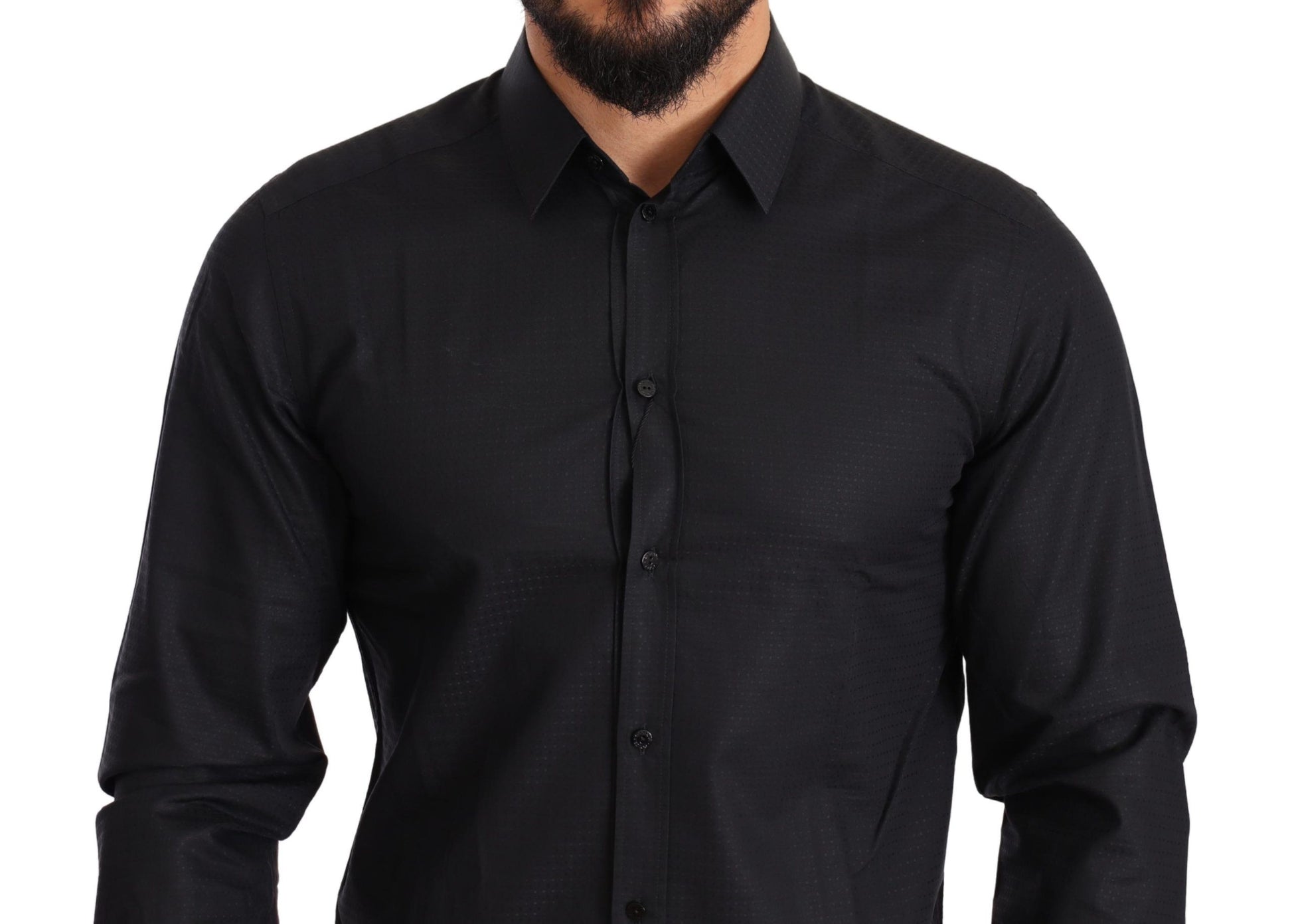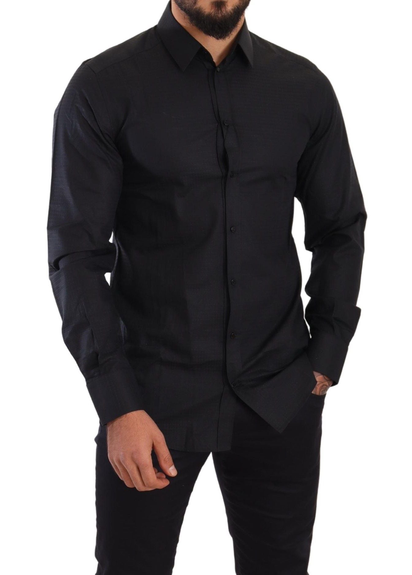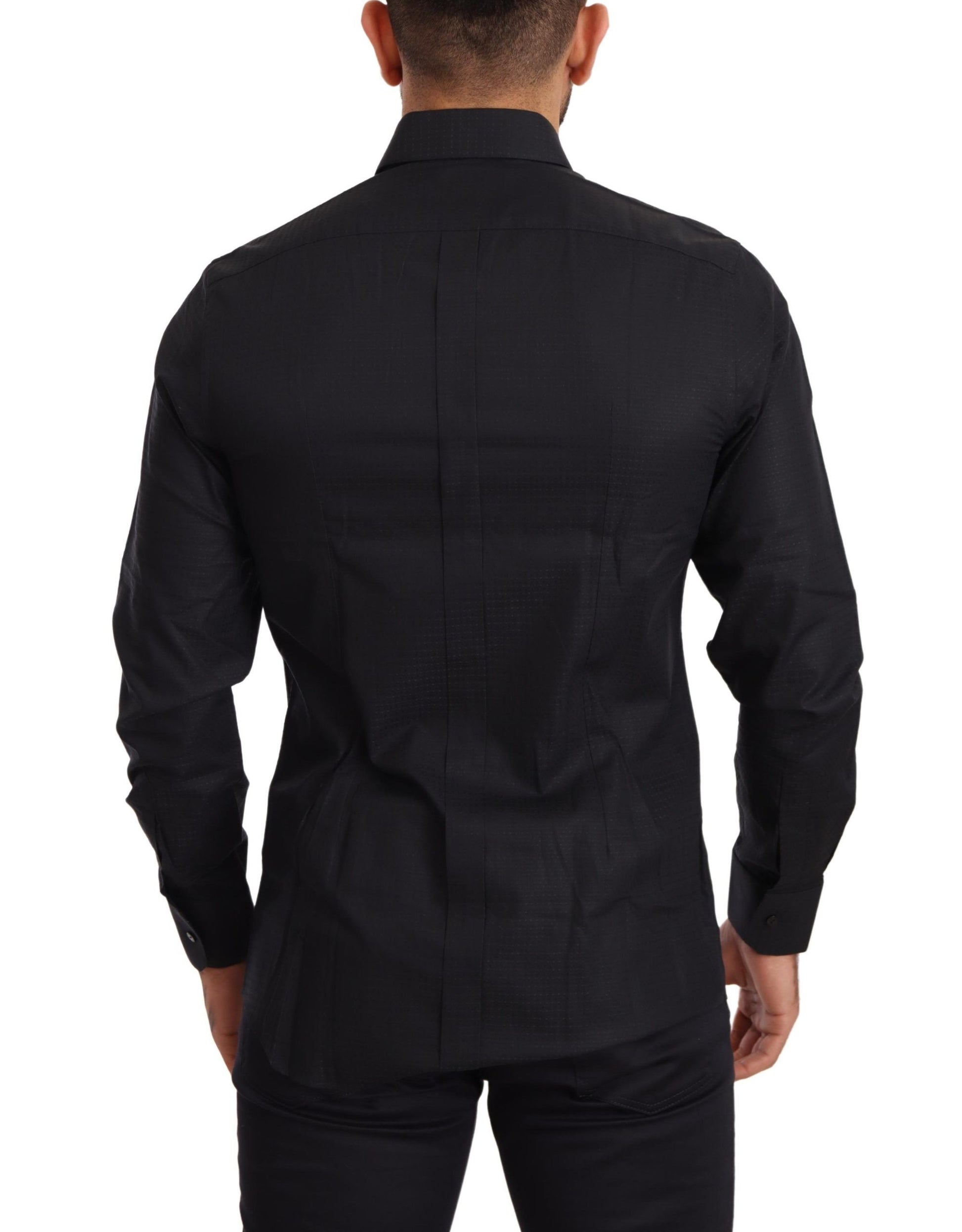 Discover the epitome of luxury Italian tailoring with this stunning black dress shirt from Dolce & Gabbana. Perfectly crafted from the finest 100% cotton, this shirt exemplifies sophistication with a sleek slim fit and classic neck. Adorned with discreet logo details and a sharp front button closure, it’s the epitome of high fashion made in Italy – ideal for discerning gentlemen who appreciate the blend of traditional craftsmanship and modern style.