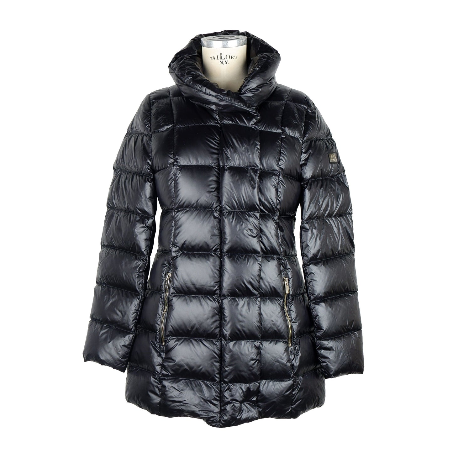 Stay warm and stylish with this chic high collar down jacket, perfect for the modern woman on the go. Crafted from high-quality polyamide and filled with real down padding, this jacket combines comfort with sophistication. Featuring a sleek black hue, it comes with a secure zip and button closure, as well as two handy side pockets for your essentials.