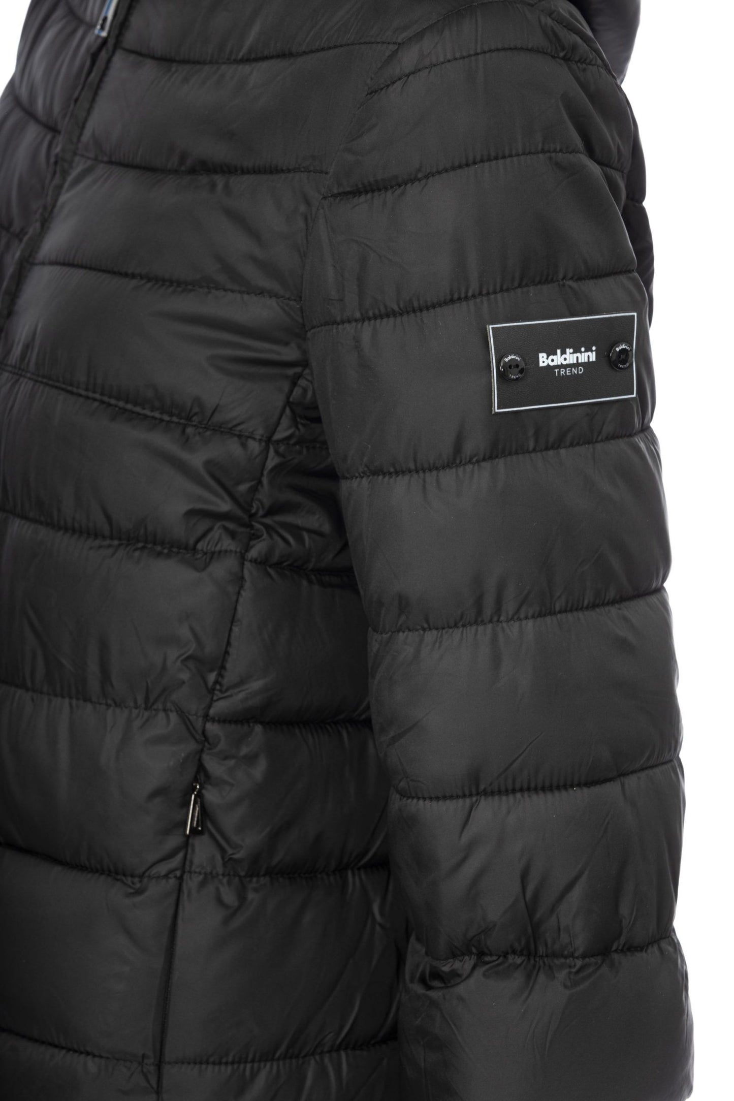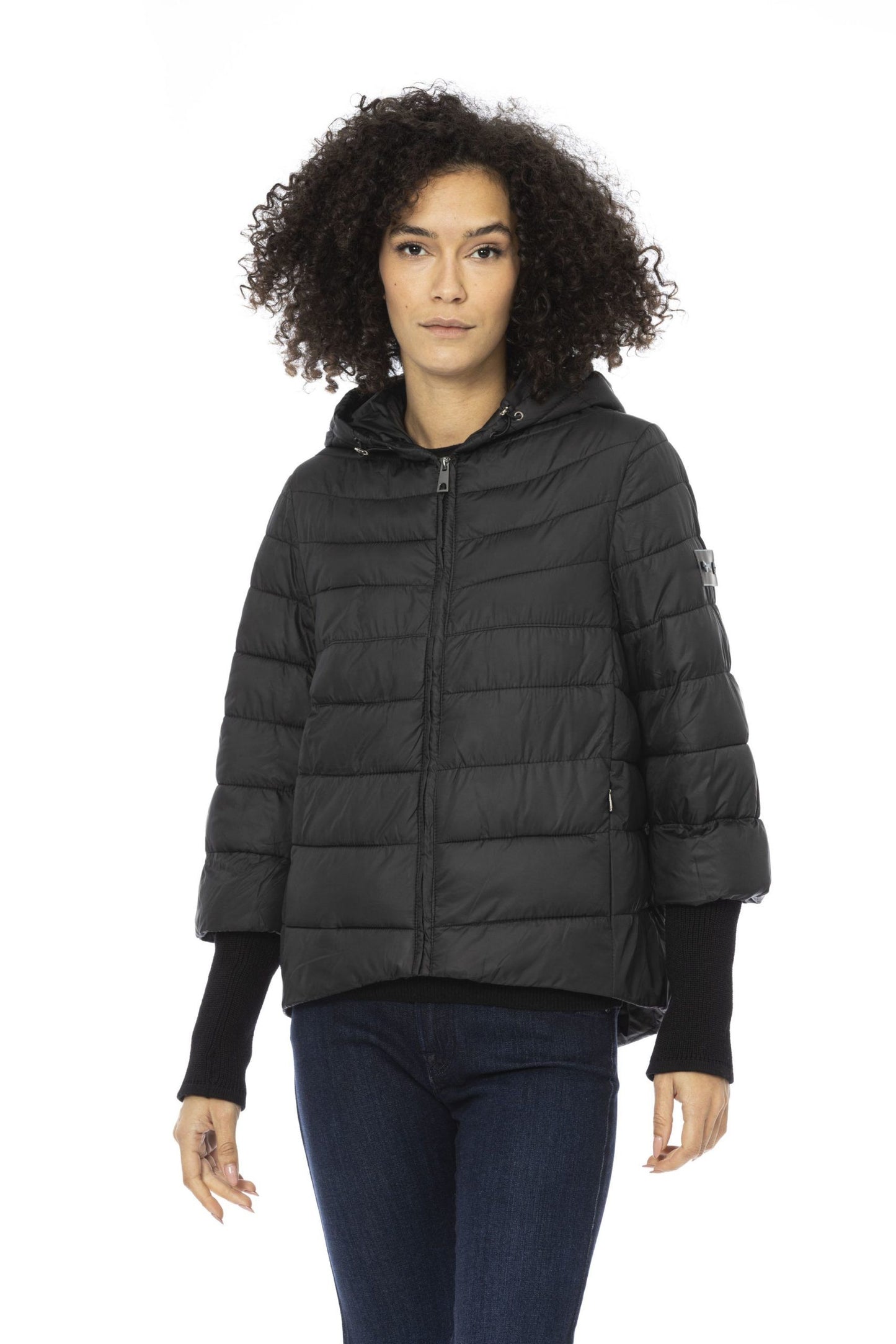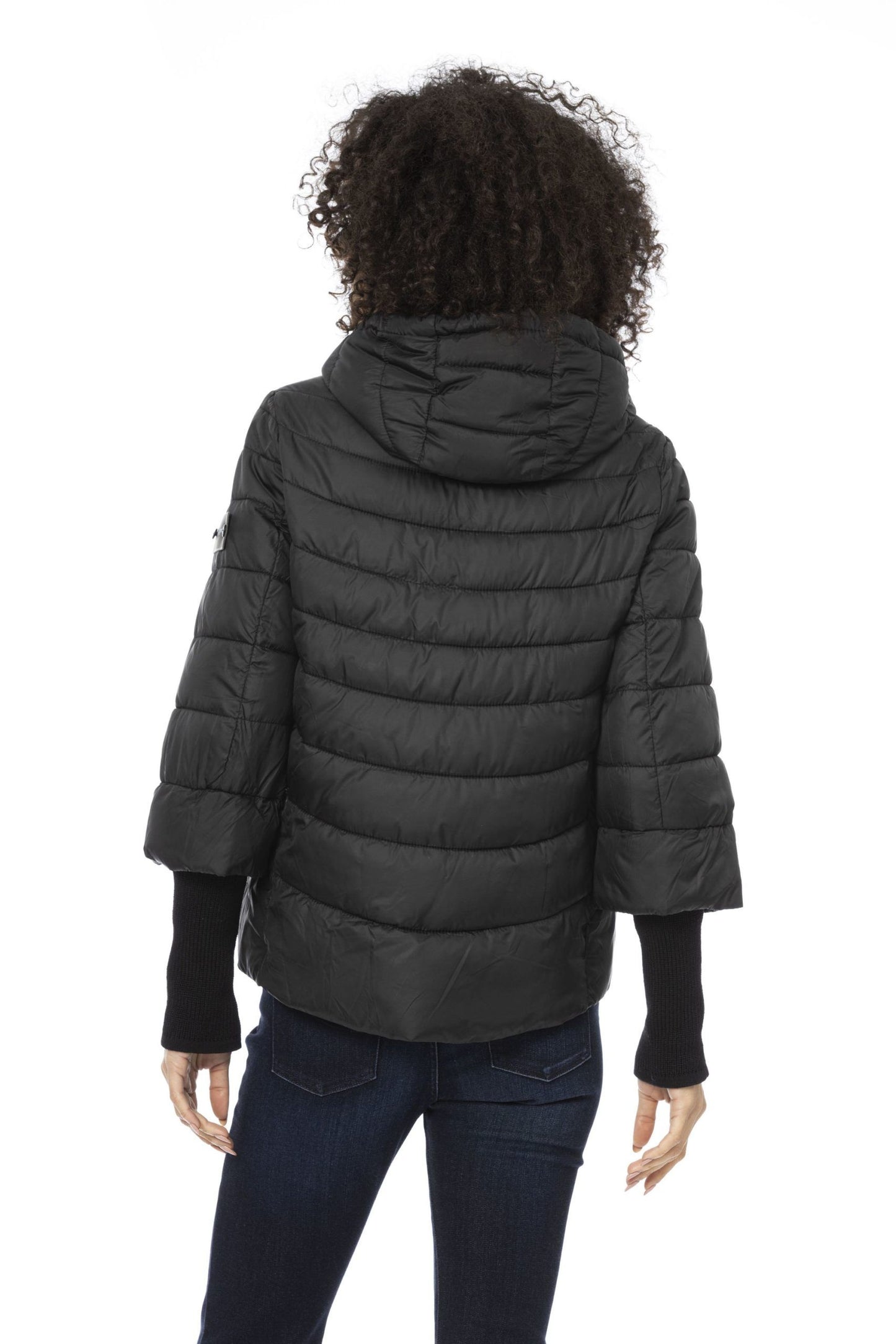 Embrace the elegance and warmth of this chic long down jacket, perfect for those who seek sophistication in their winter wear. Featuring a sleek black polyester shell, this coat boasts external welt pockets for a touch of class, along with an adjustable hood to shield you against the chill. The piece is artfully accented with a Baldinini monogram in metal, exuding luxury. Its practical front closure ensures ease of wear, complete with a custom zip puller for a distinctive touch.