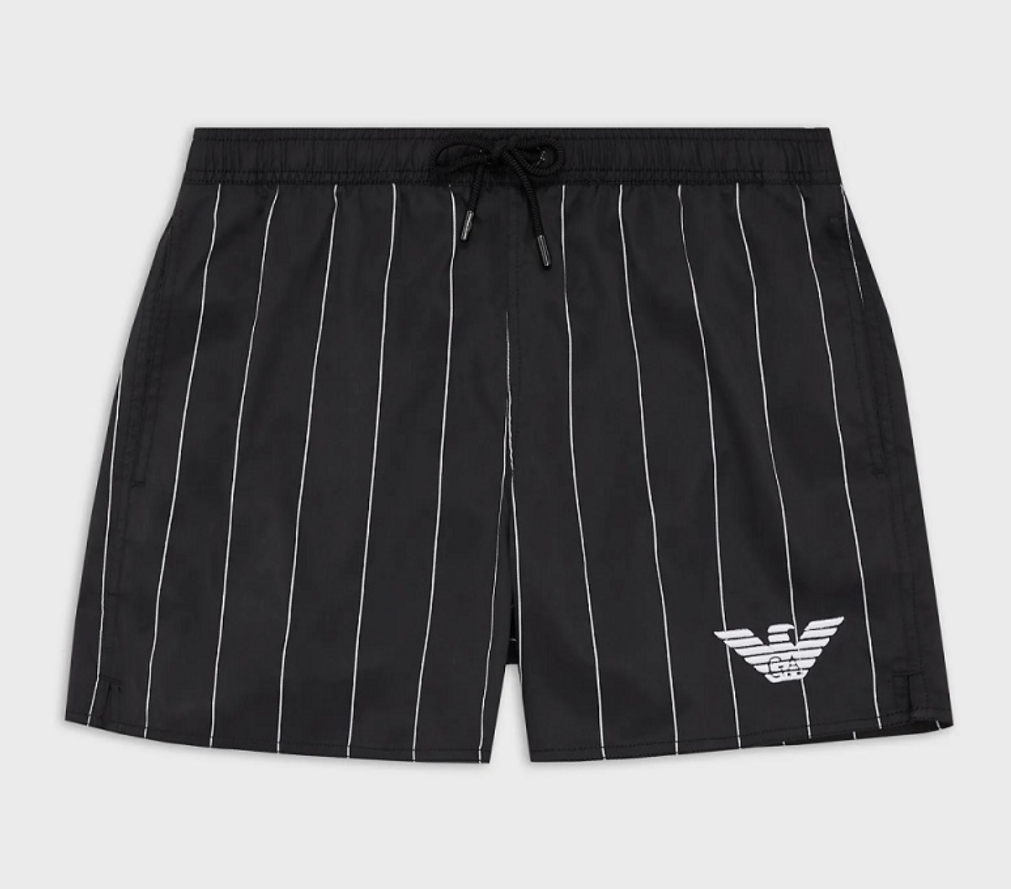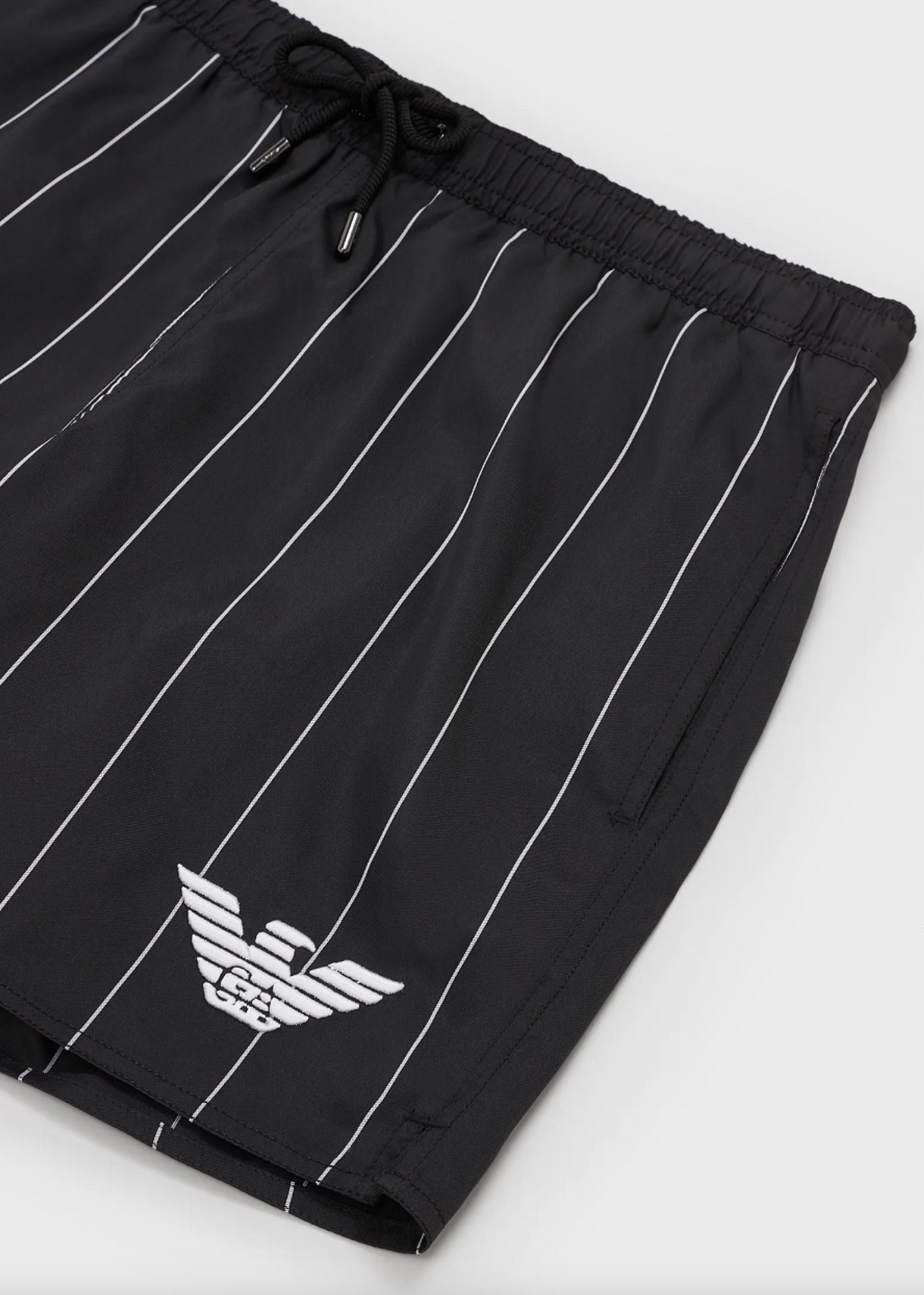 Elevate your beachwear with these stylish striped beach shorts, featuring a tastefully embroidered logo on the lower hem. Expertly crafted from durable material, they are perfect for your next seaside escape or poolside lounging. Functional side pockets add convenience to this sleek design.