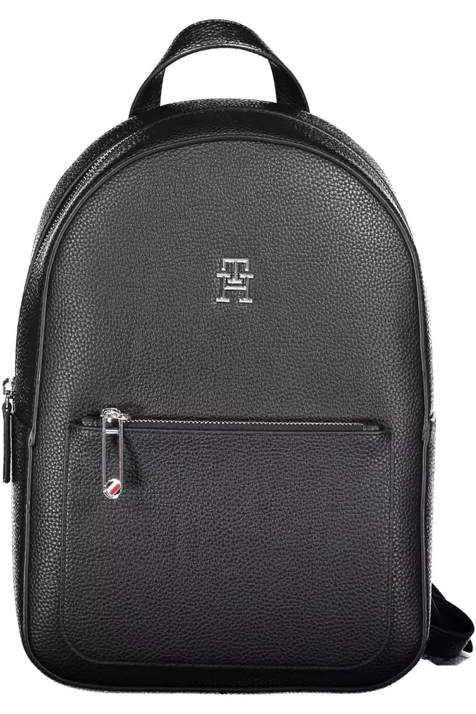 Step out in style with the Tommy Hilfiger black backpack, perfect for the fashion-forward individual on the move. Crafted from durable polyethylene, this chic backpack features a convenient top handle, adjustable shoulder straps for personalized comfort, an external pocket for easy access, and a secure internal document pocket. With its classic zip closure and the iconic Tommy Hilfiger logo, it combines practicality with high-end fashion allure.