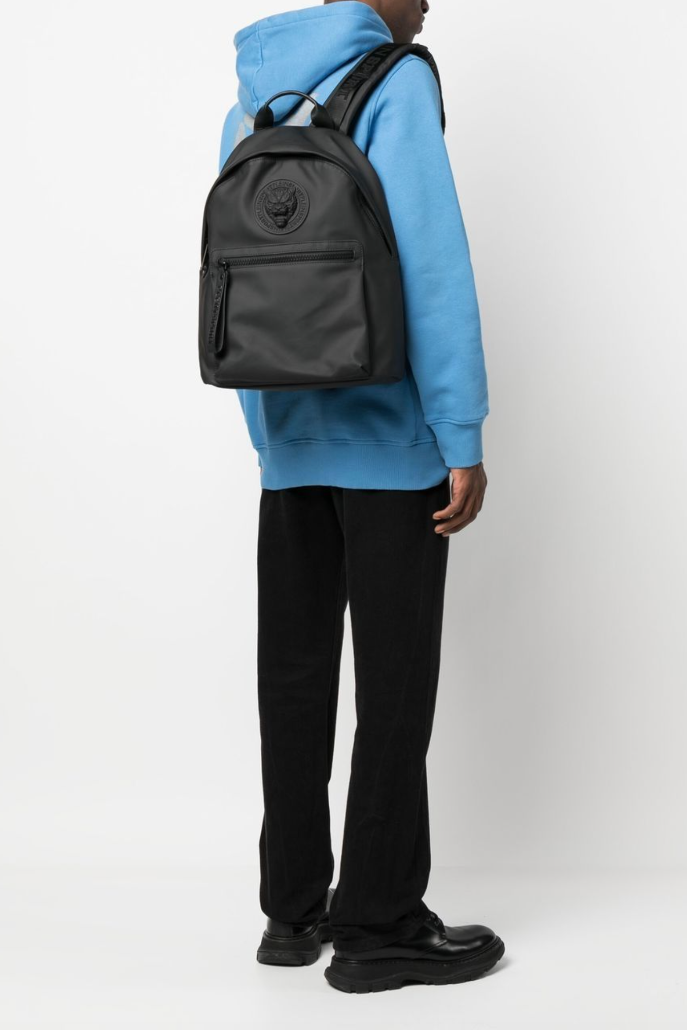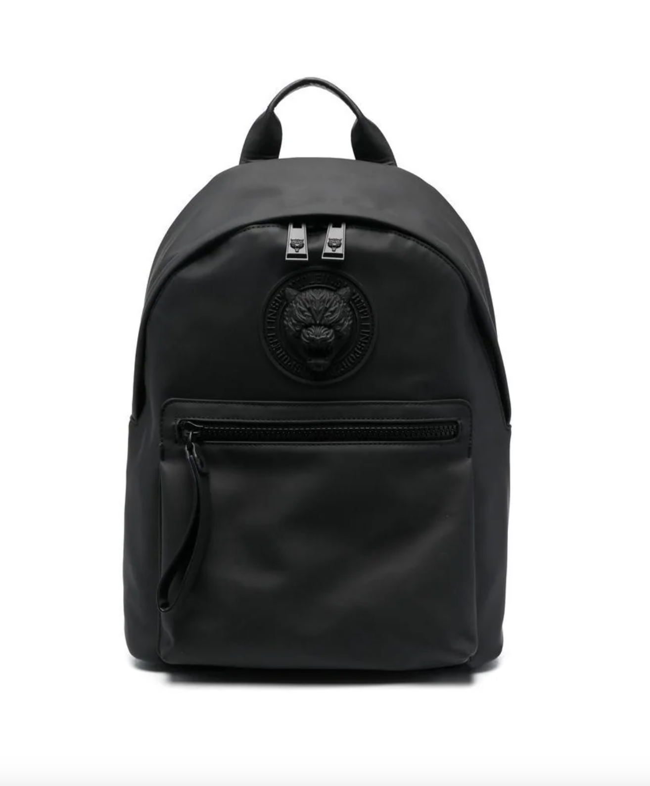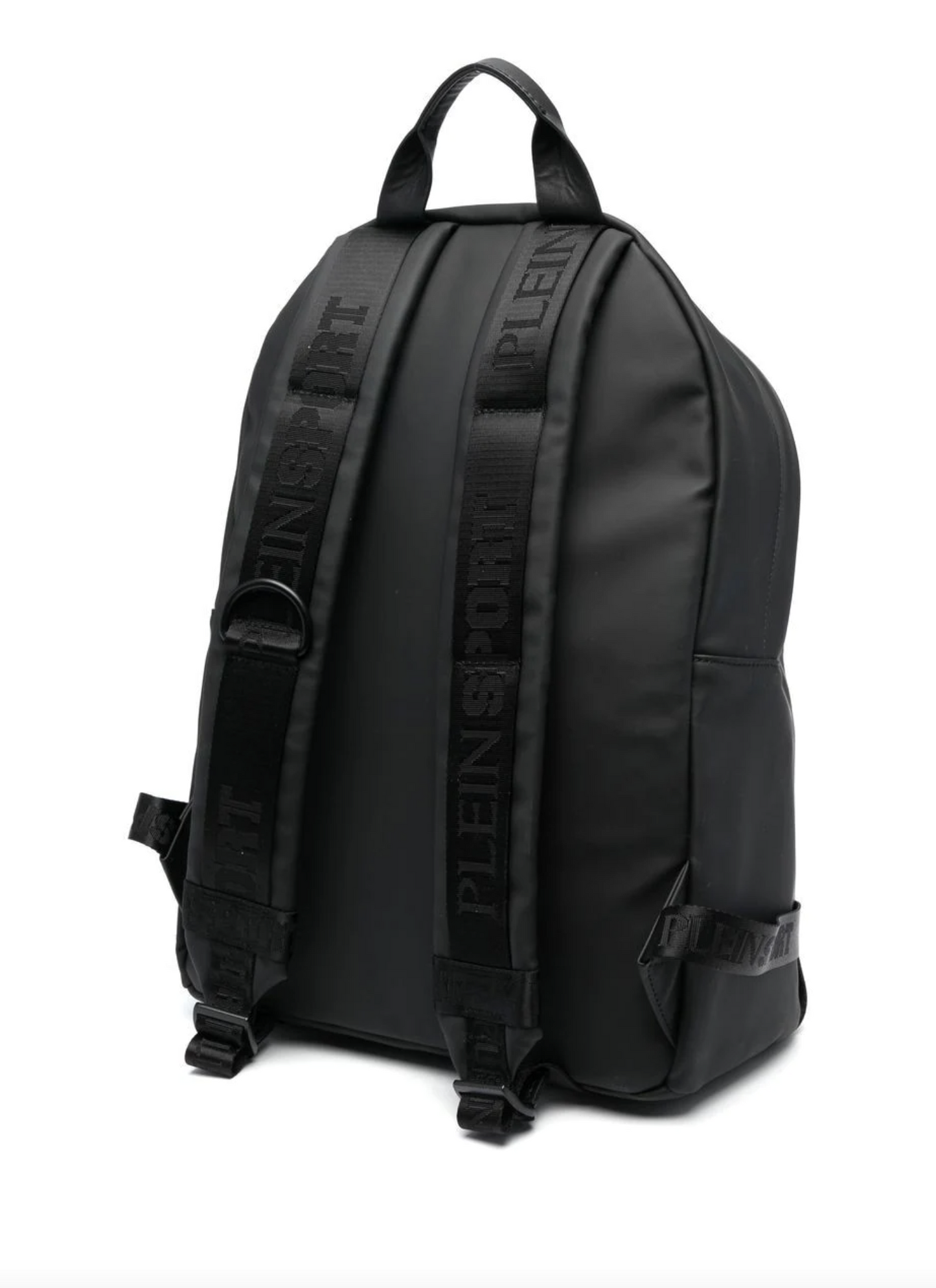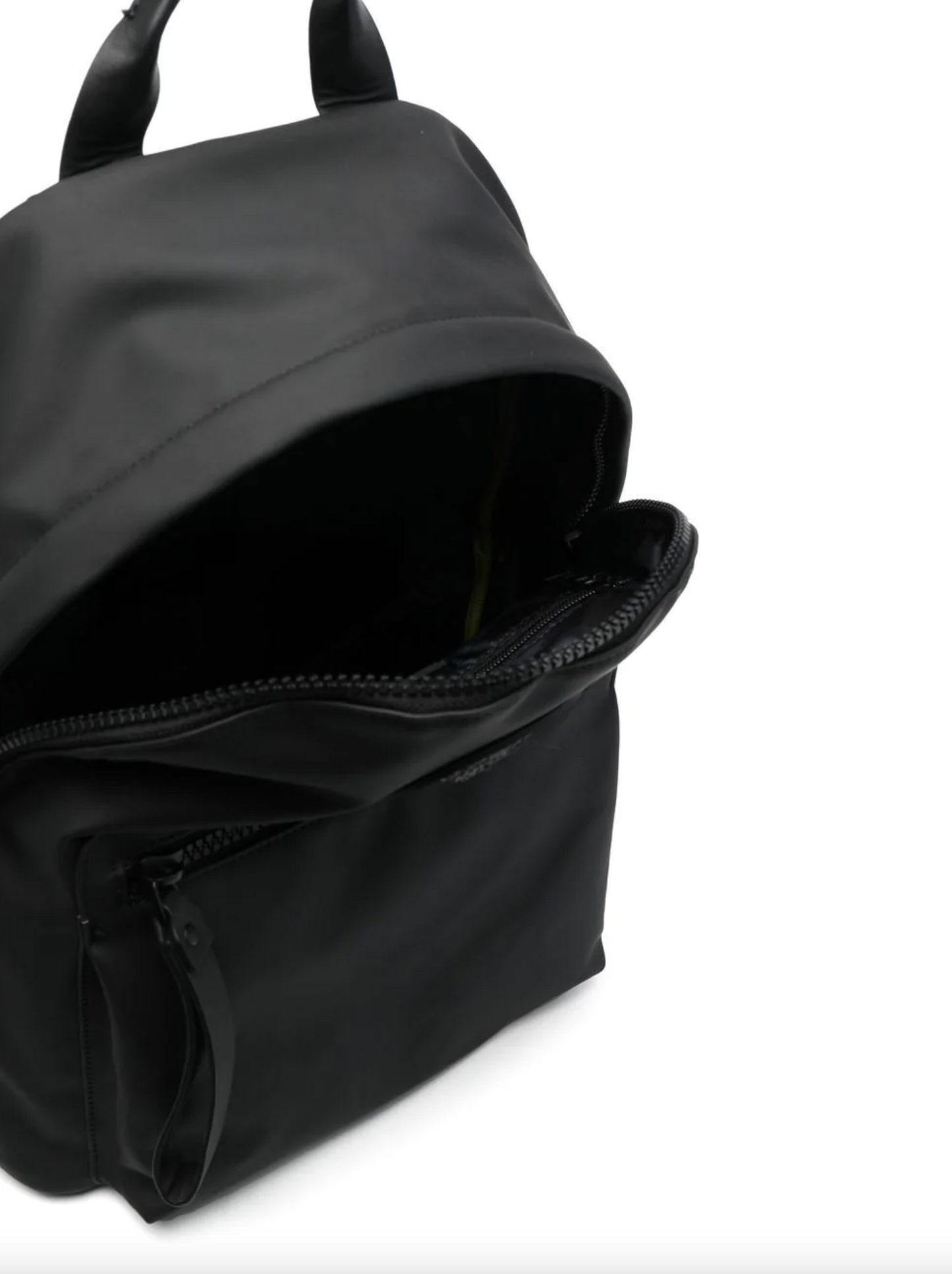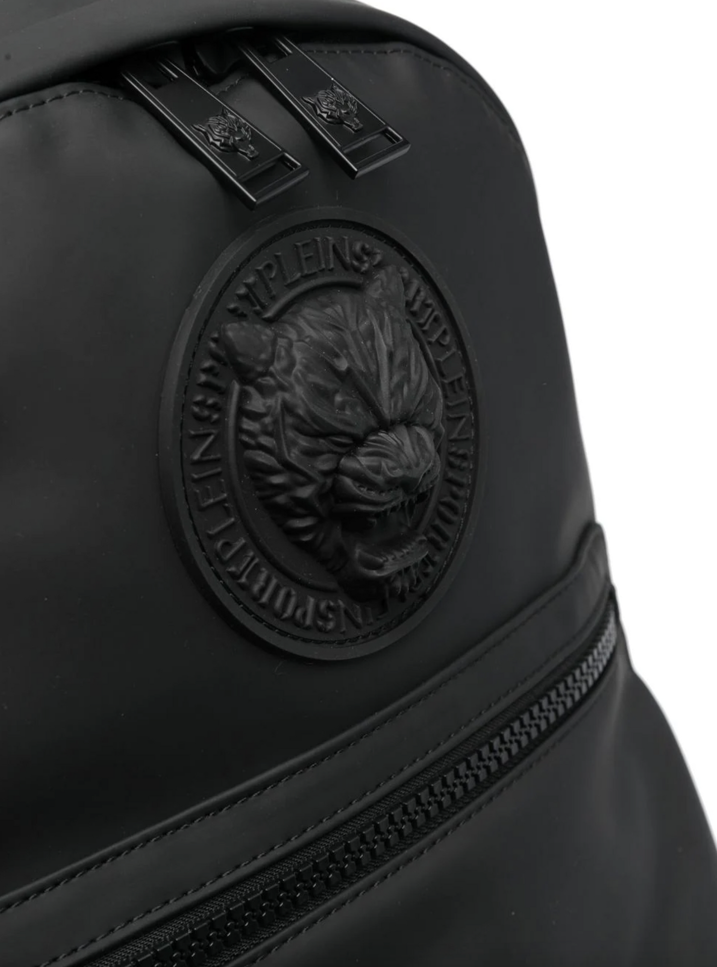 Elevate your travel essentials with this sleek black backpack, which boasts a stand-out relief logo and a practical front zip pocket for easy access to your necessities. Crafted from durable polyurethane material, it promises both style and longevity.