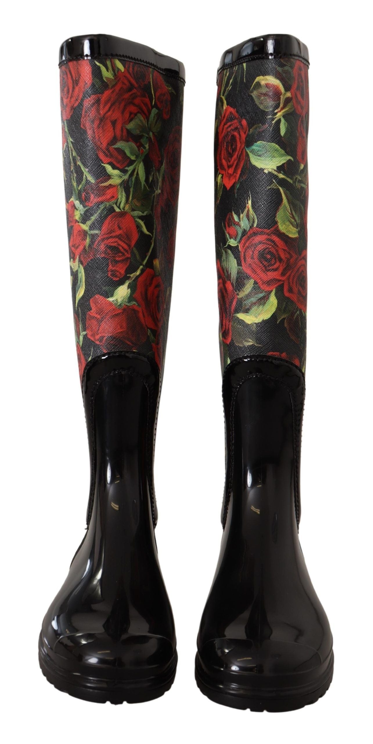 Step into elegance, even on the rainiest days, with our stunning selection of chic all-weather footwear. These gorgeous new rain boots by Dolce & Gabbana are adorned with a vibrant red roses pattern set against a sleek black background, offering an exquisite blend of fashion and function. Crafted in Italy, they feature a durable rubber sole and the esteemed logo details, ensuring that every step you take is in luxurious comfort and style.