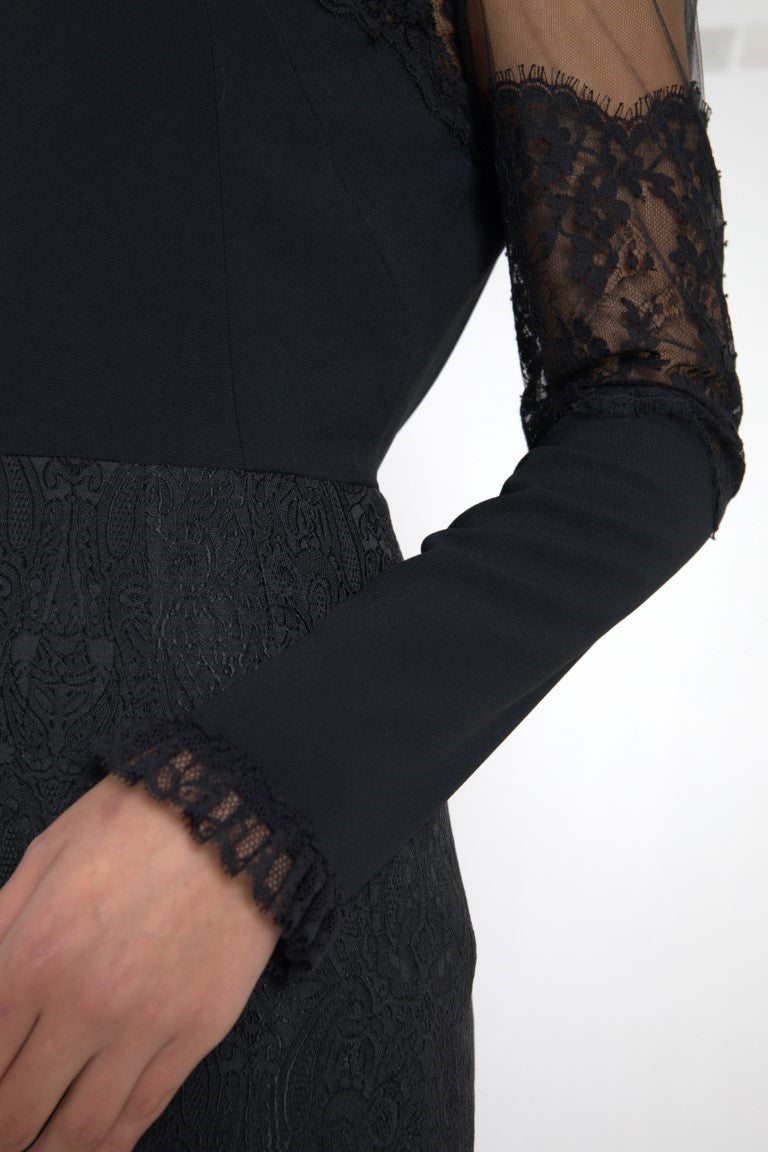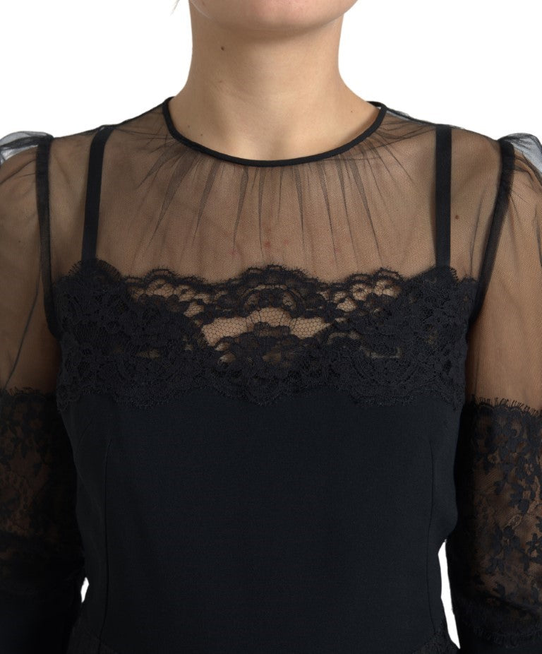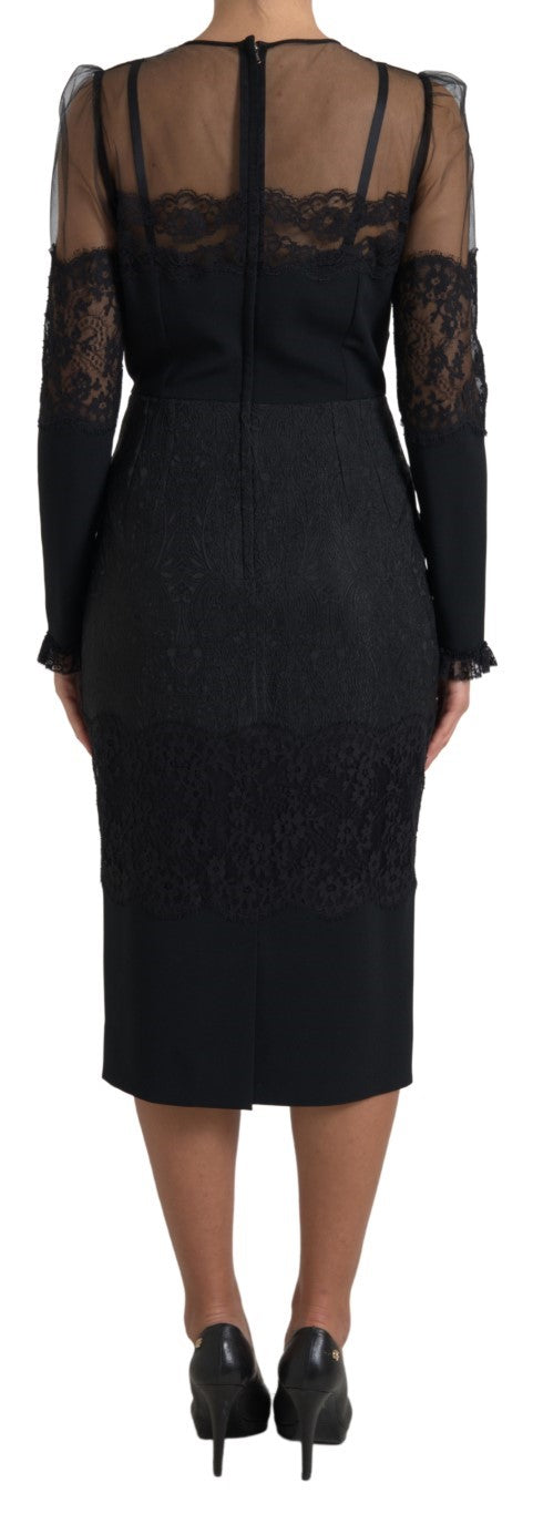 Gorgeous brand new with tags, 100% Authentic DOLCE & GABBANA lace midi dress. Crafted from black nylon blend, features a round neck, a hook & eye fastening, an invisible back zip fastening, long sleeves, ruffled sleeves, a sheer chest panel and a fitted waist.