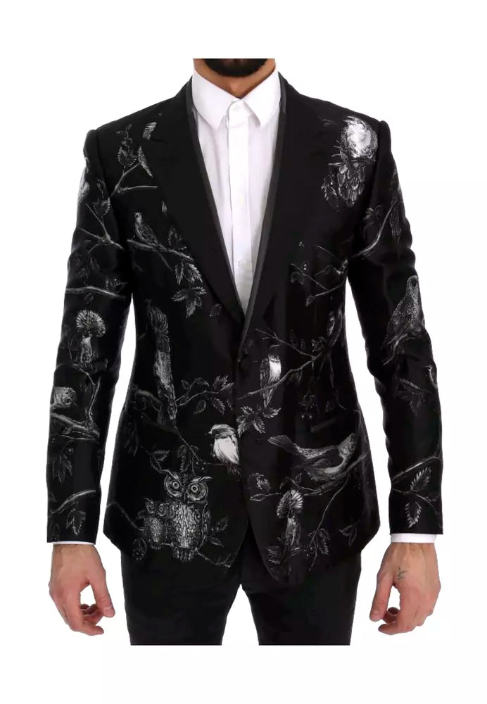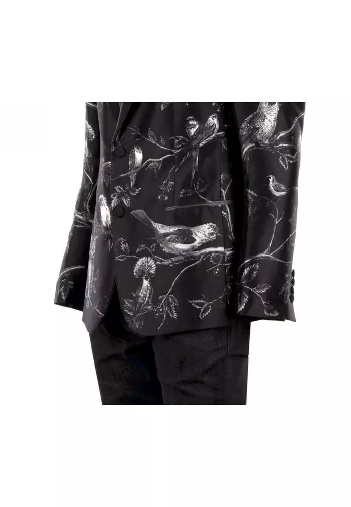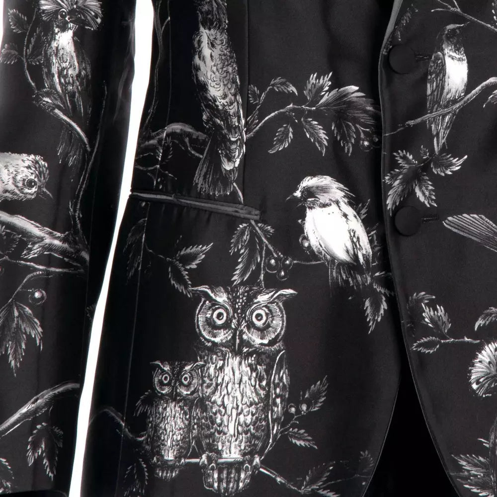 Step into luxury with the classic two-button black silk jacket from the esteemed SICILIA line. Adorned with a unique bird-themed print that covers the entire outer surface, this jacket exudes sophistication. Expertly tailored with convenient external side pockets and three internal pockets, this piece is the epitome of both function and style. Crafted with finesse in Italy, it is a testament to impeccable craftsmanship.