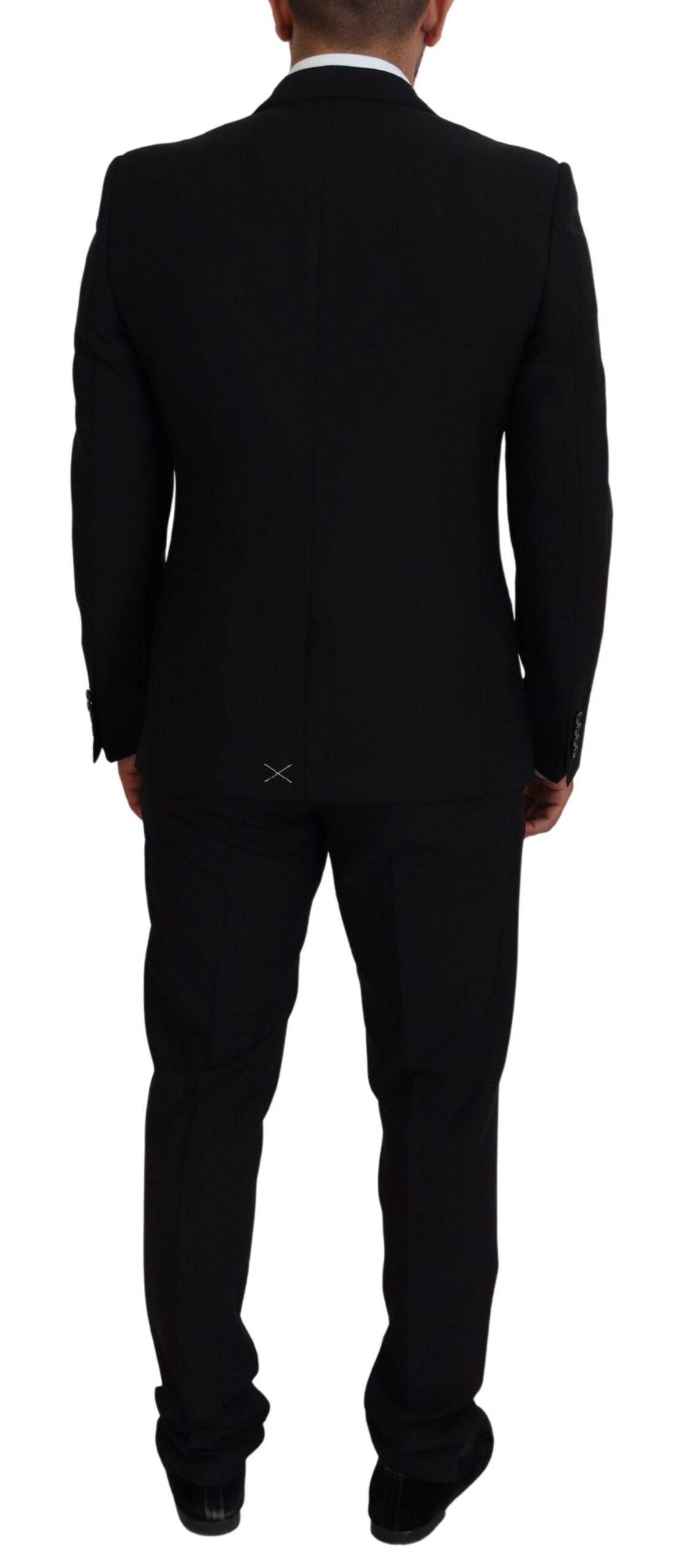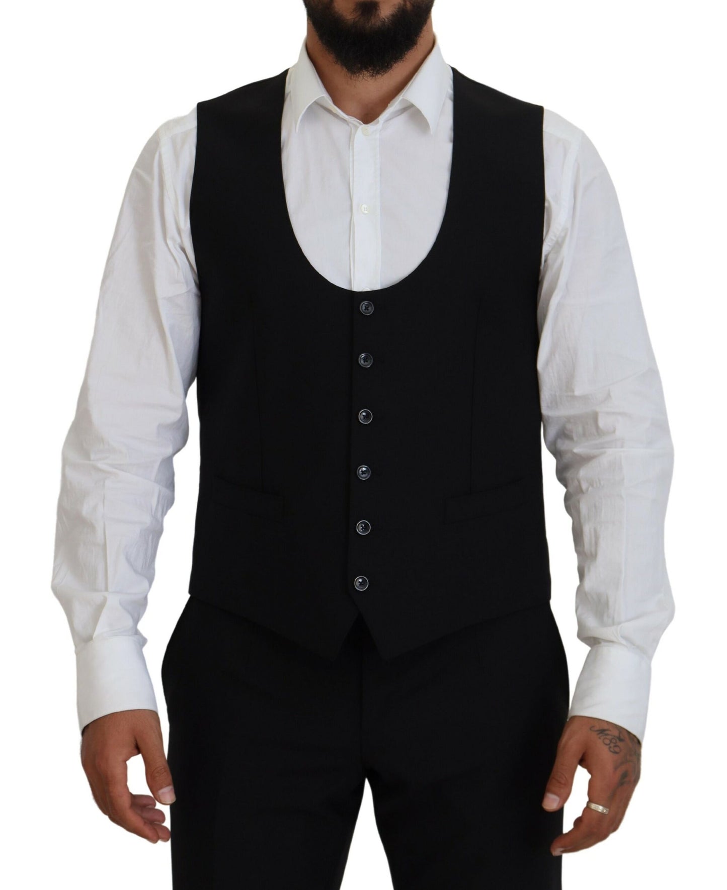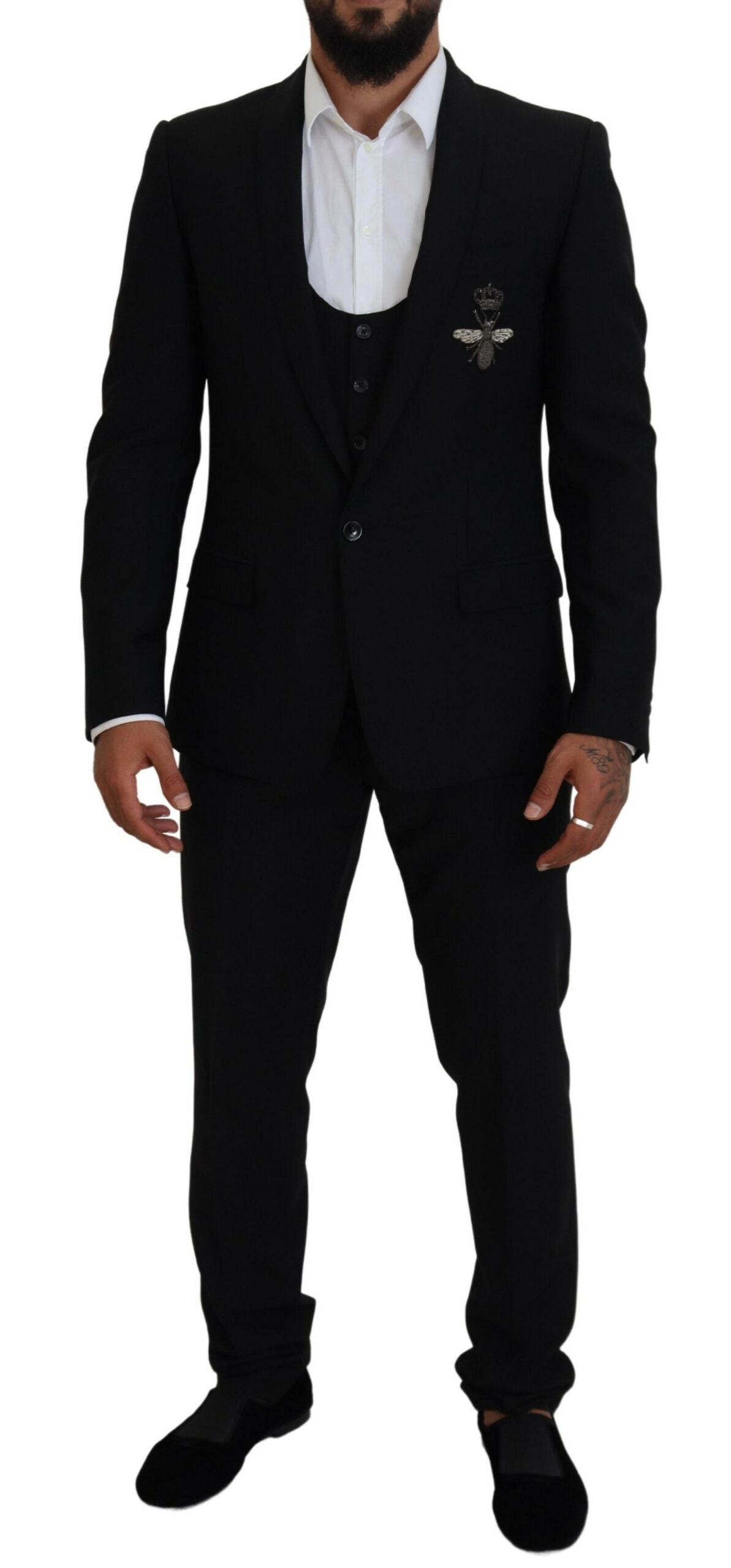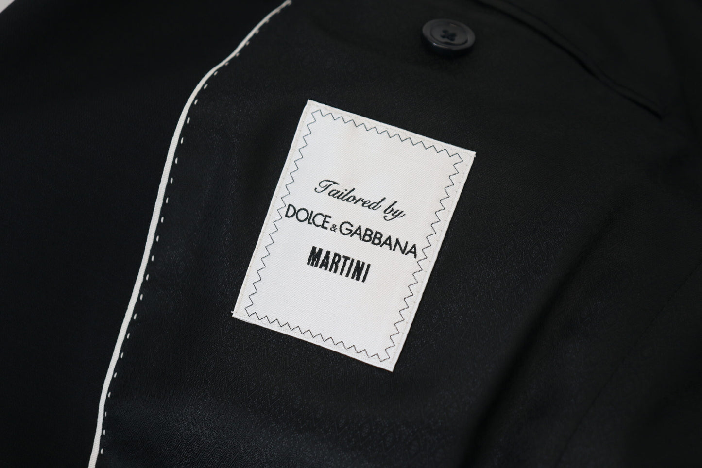 Step into the world of luxury with this Dolce & Gabbana MARTINI 3-piece suit, a symbol of sophistication and style. Tailored for the discerning gentleman, the suit features a sleek black hue and a slim fit cut enhancing the silhouette. The single-breasted blazer boasts a shawl lapel, button cuffs, and convenient flap pockets, paired with matching trousers with an impeccable mid-rise fit and a waistband ready for belt accessorizing. The waistcoat adds an extra layer of finesse, ensuring you stand out at any formal event or business gathering. Crafted from the finest 100% Virgin Wool with a premium lining, this suit offers comfort without compromising on elegance. Proudly made in Italy, it reflects the exquisite craftsmanship and attention to detail that is synonymous with the brand.