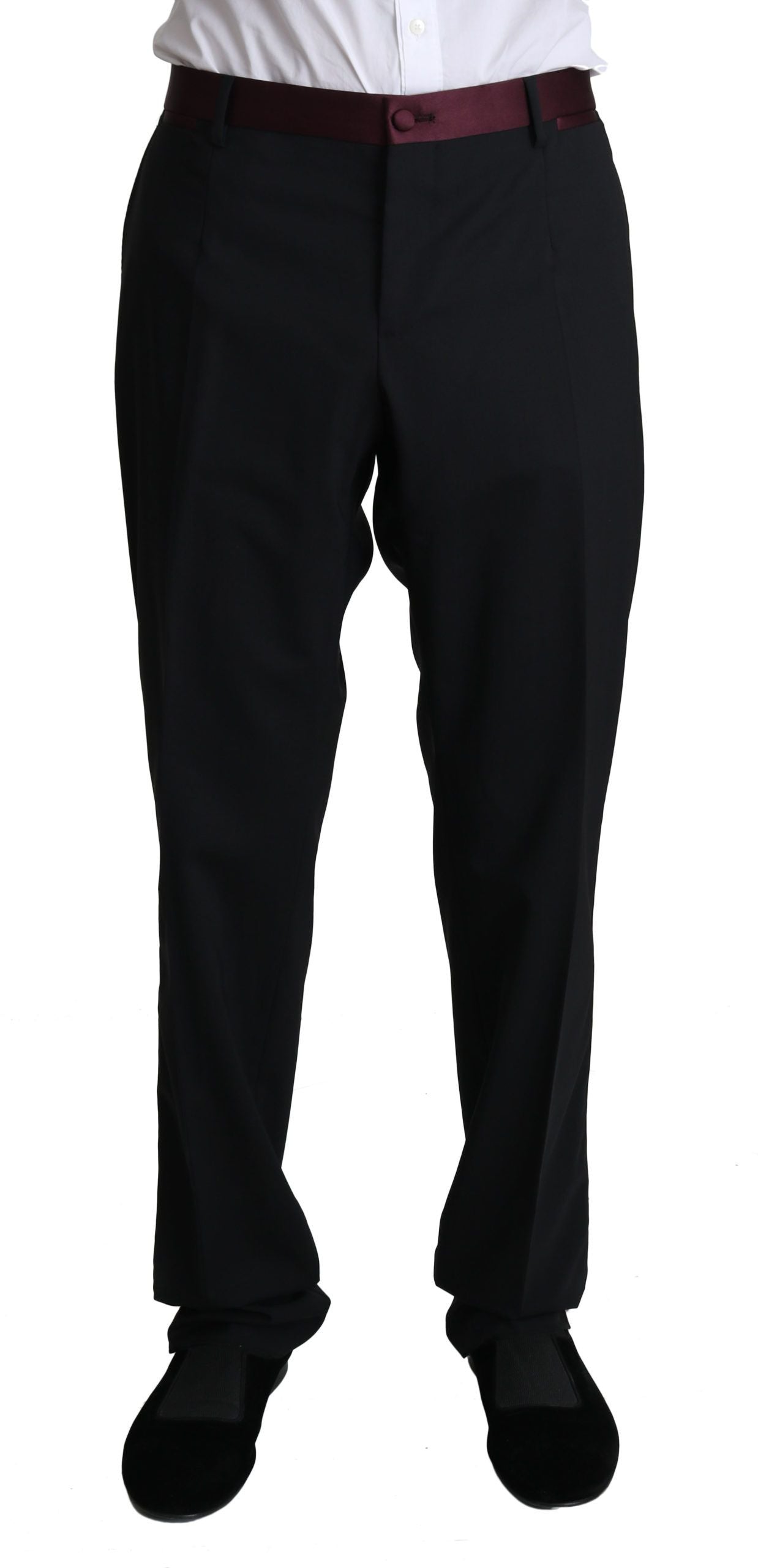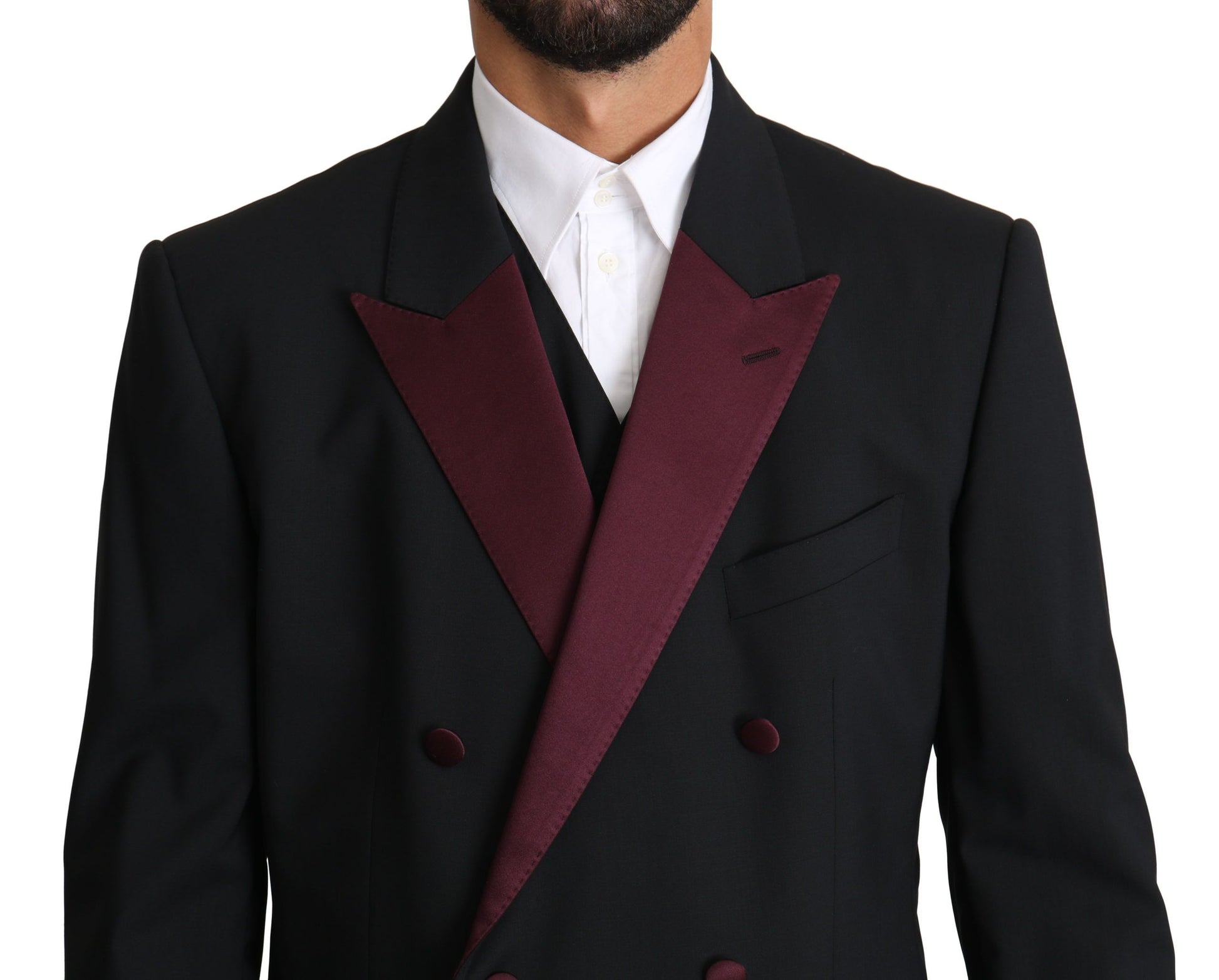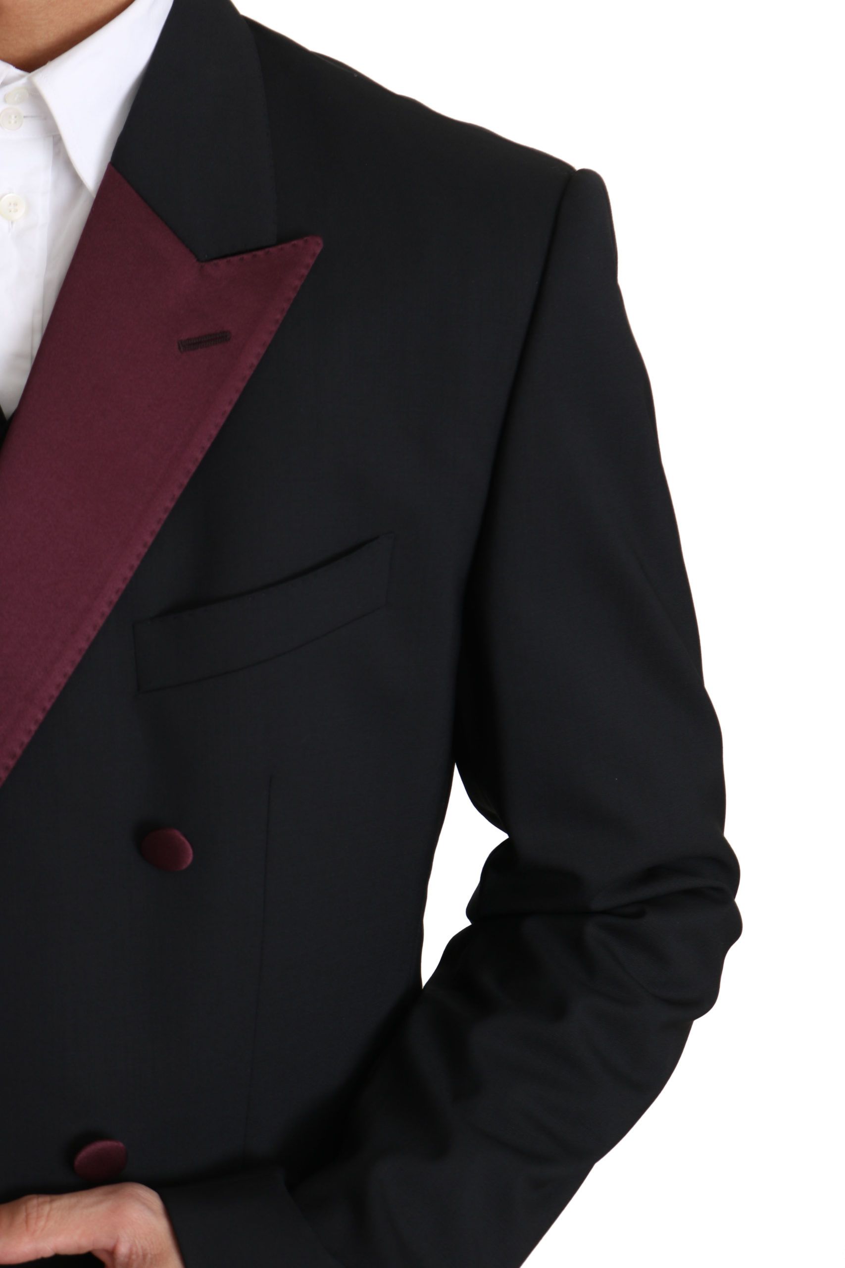 Discover the epitome of sophistication with this Dolce & Gabbana three-piece Martini suit. Crafted from a luxurious blend of virgin wool, silk, and elastane, this black suit features a double-breasted blazer, a smart vest, and tailored pants, all adorned with bordeaux detailing. The suit champions Italian tailoring with its regular fit, meticulous craftsmanship, and exclusive design elements, including two inside pockets, a back vent for comfort, and a fully adjustable vest. Perfect for making a distinguished impression at any formal event.