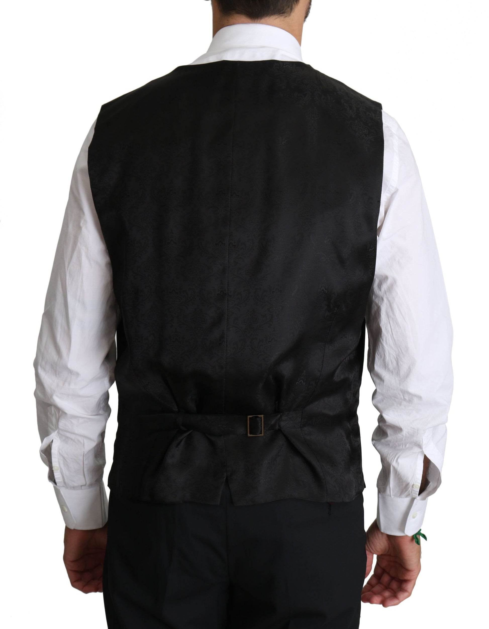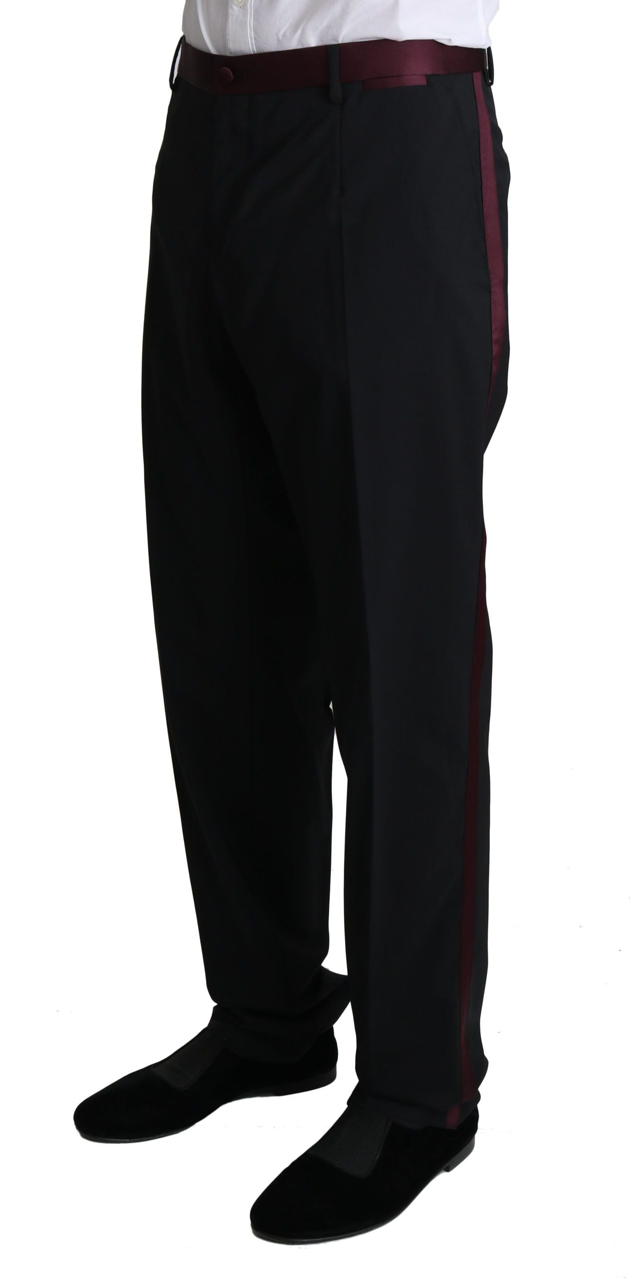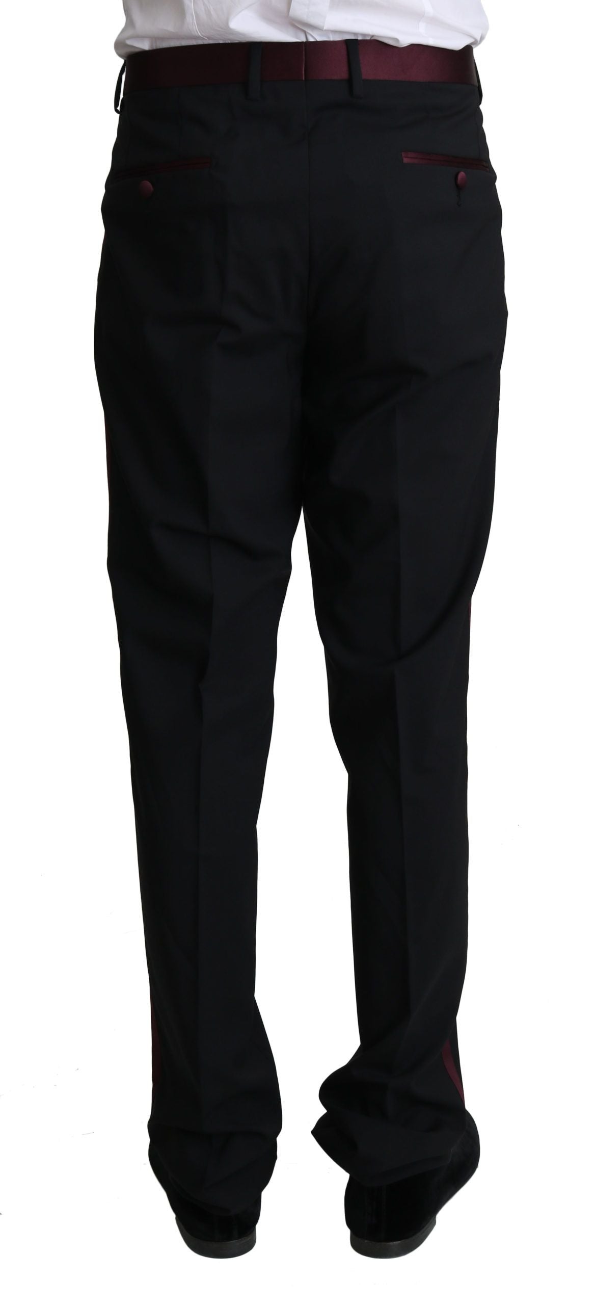Discover the epitome of sophistication with this Dolce & Gabbana three-piece Martini suit. Crafted from a luxurious blend of virgin wool, silk, and elastane, this black suit features a double-breasted blazer, a smart vest, and tailored pants, all adorned with bordeaux detailing. The suit champions Italian tailoring with its regular fit, meticulous craftsmanship, and exclusive design elements, including two inside pockets, a back vent for comfort, and a fully adjustable vest. Perfect for making a distinguished impression at any formal event.