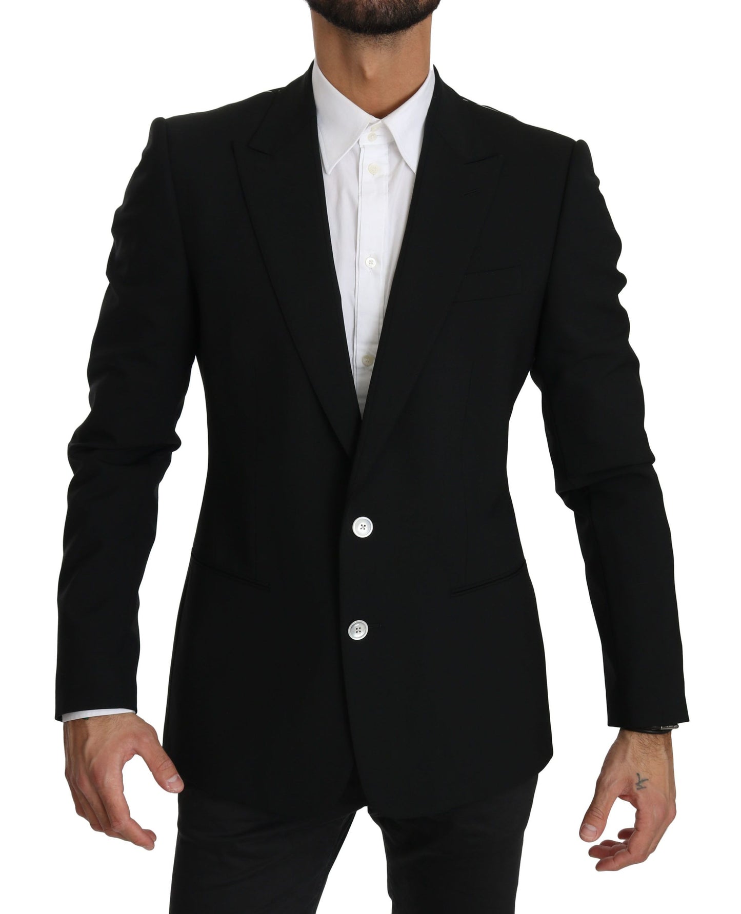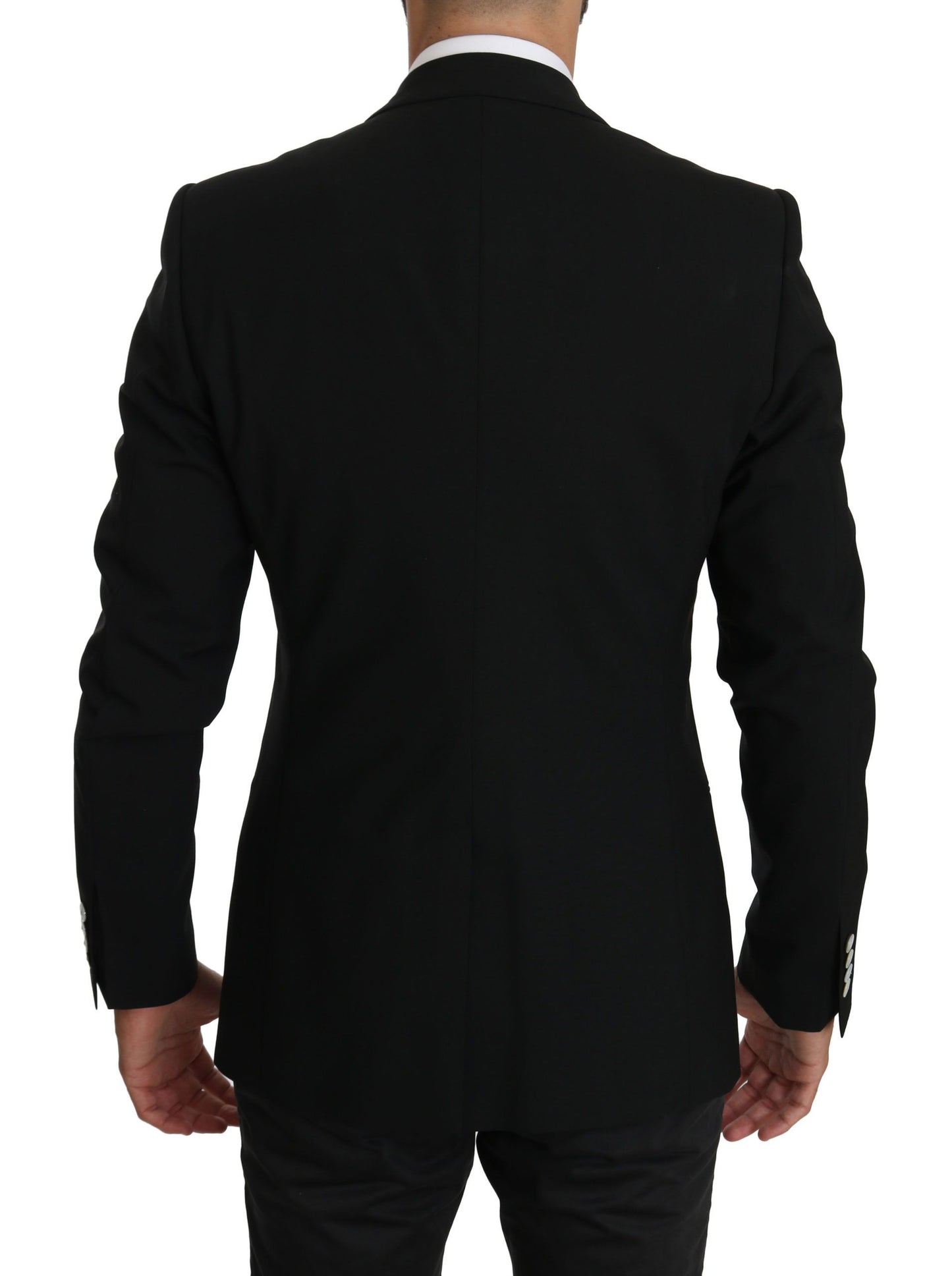 Step out in sophisticated style with this luxurious Dolce & Gabbana single-breasted blazer. Crafted from a premium blend of 95% virgin wool and 5% elastane, this slim fit jacket ensures both comfort and elegance. Perfectly tailored to elevate any formal attire, it features a sleek black color, front button closure, multiple pockets for functionality, and exquisite logo details as a testament to its authentic Italian craftsmanship.