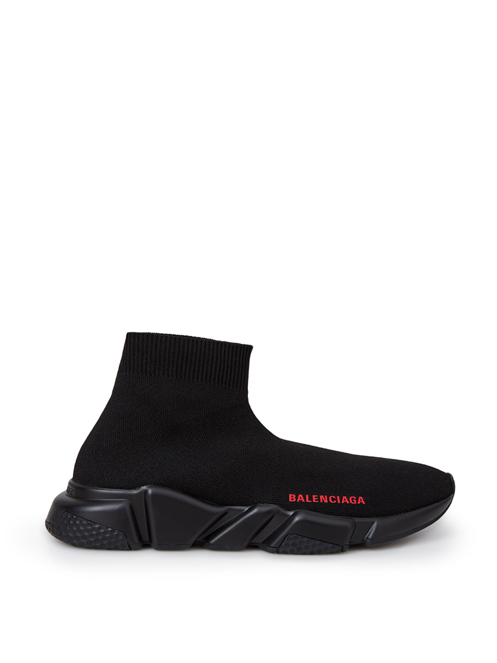 Step into luxury with our pristine, 100% Authentic Balenciaga Black Speed Sneakers. Designed for those who value elegance and comfort, these sneakers feature a stretch tech fabric upper with a chic, form-hugging fit. The sleek black design is accentuated by the iconic logo, subtly embroidered at the side. Perfect for pairing with any ensemble, these kicks will propel your style to the next level.