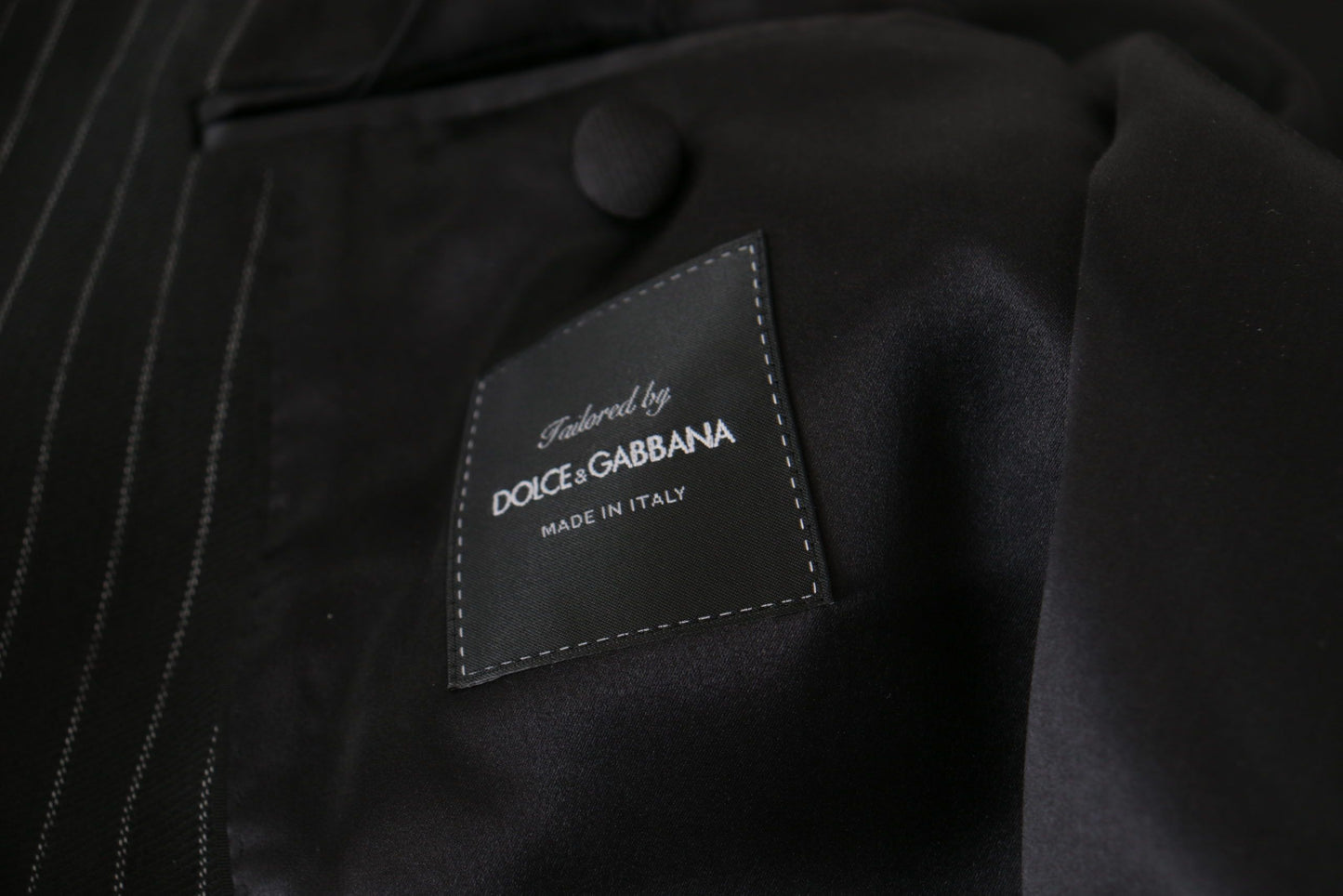Indulge in the essence of sophistication with this absolutely stunning black striped two-piece suit from Dolce & Gabbana. Tailored to perfection, the suit boasts a double-breasted blazer featuring peak lapels, button cuffs, along with a chest pocket and side flap pockets for a classic touch. The slim-fit design ensures a sharp silhouette, while the trousers complete the attire with a mid-rise cut, button and zip fly, alongside side and back pockets for functionality. Crafted in Italy, this suit exemplifies exclusive high craftsmanship with a luxurious blend of fabrics that offer both comfort and style.