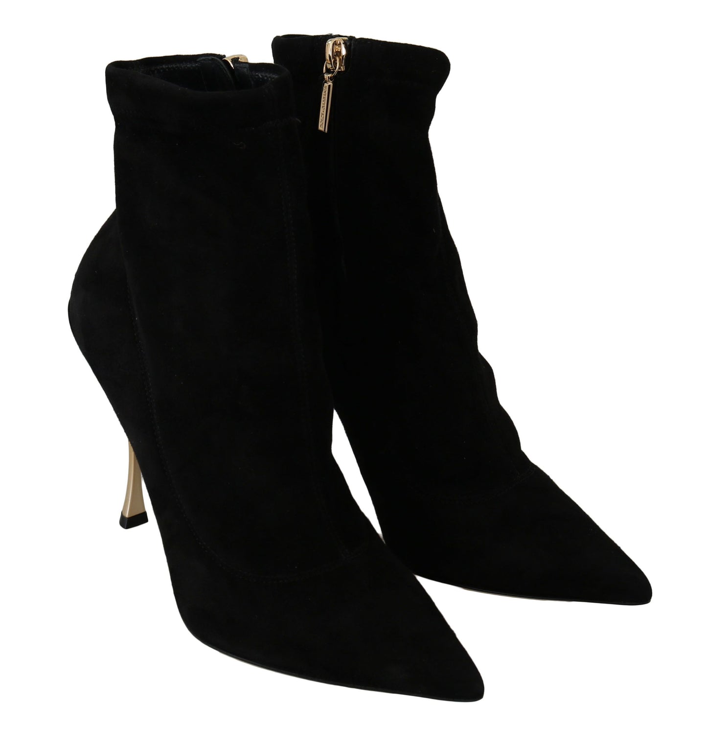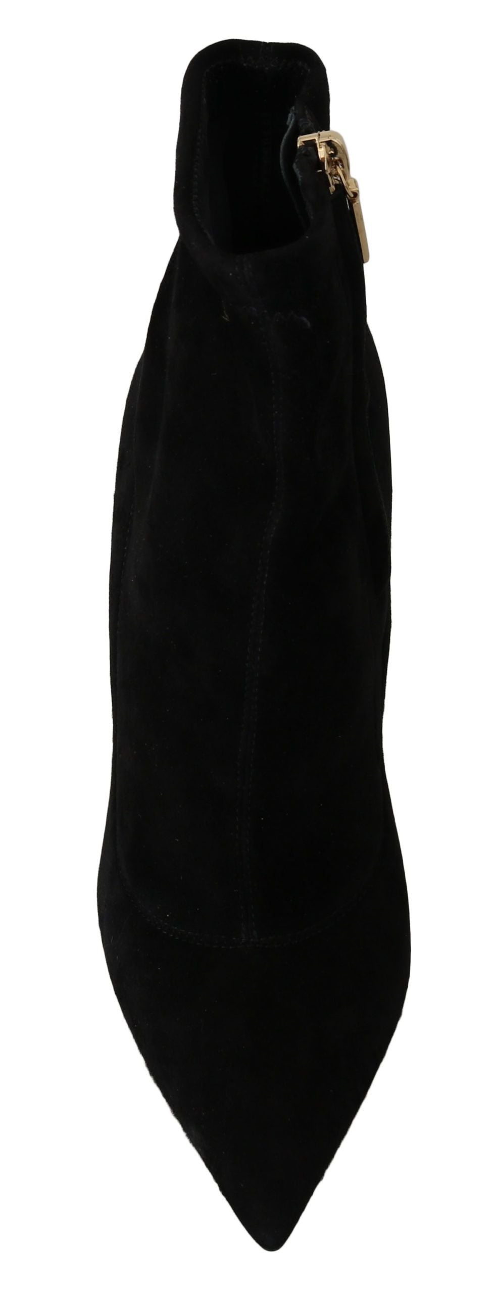 Step into luxury with these exquisite ankle boots by Dolce & Gabbana. Crafted from premium 100% suede in a timeless black, these pointed toe boots feature glamorous gold skinny heels that add a touch of opulence to any outfit. A sleek side zipper ensures a snug fit, while the iconic logo detail adds an air of exclusivity. Handmade in Italy, these boots are a testament to high-end craftsmanship.