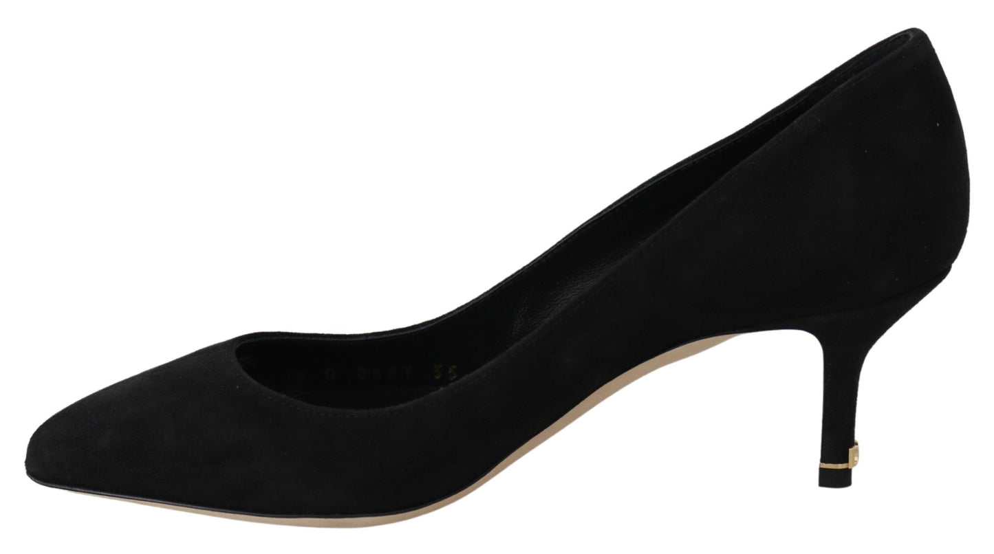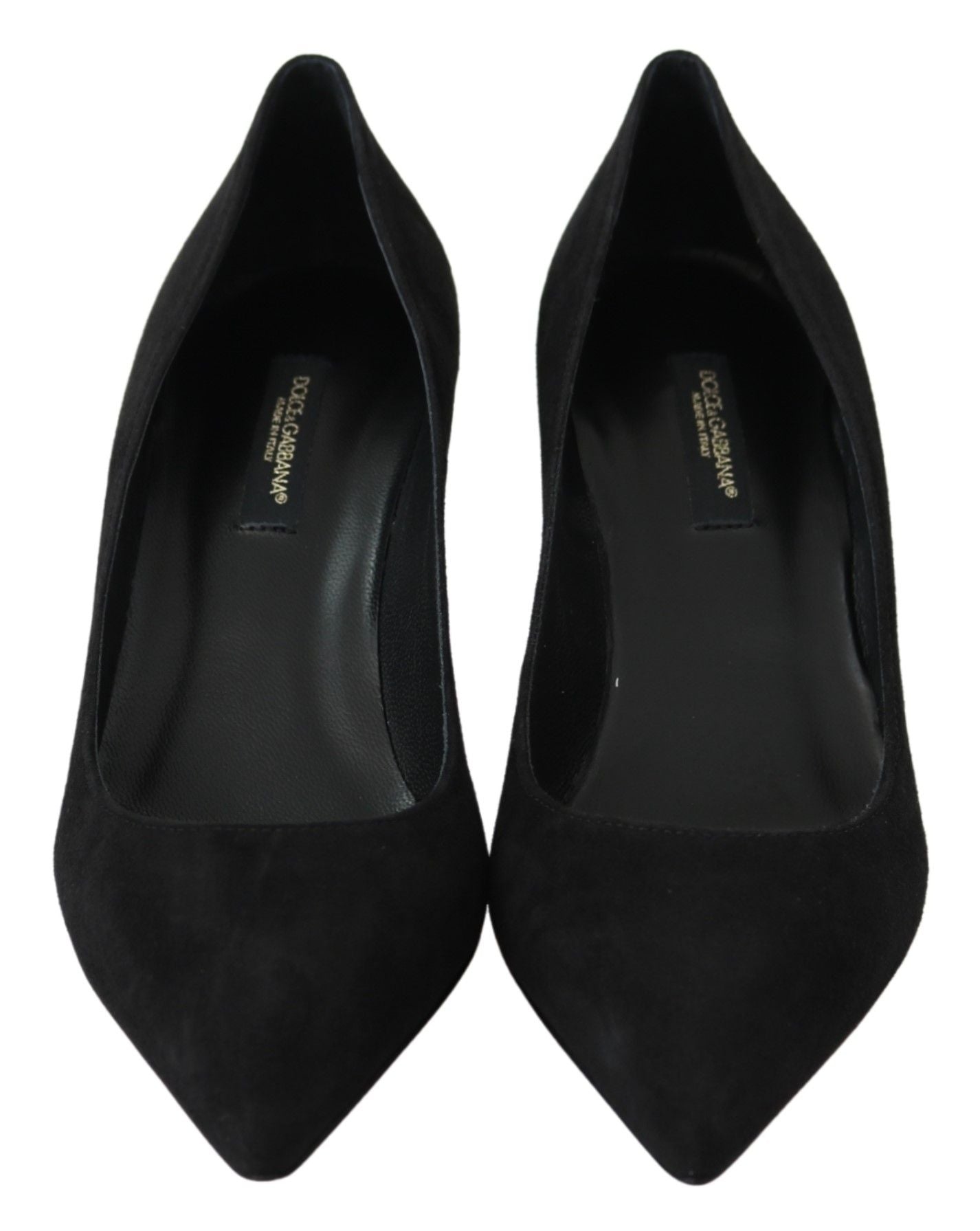 Indulge in the epitome of luxury with these Dolce & Gabbana classic heels pumps, crafted from exquisite 100% Suede Capra goatskin. Featured in an elegant black, these shoes boast a sophisticated gold logo on the heel, seamlessly blending prestige with style. Perfect for a chic, timeless look that exudes Italian craftsmanship.