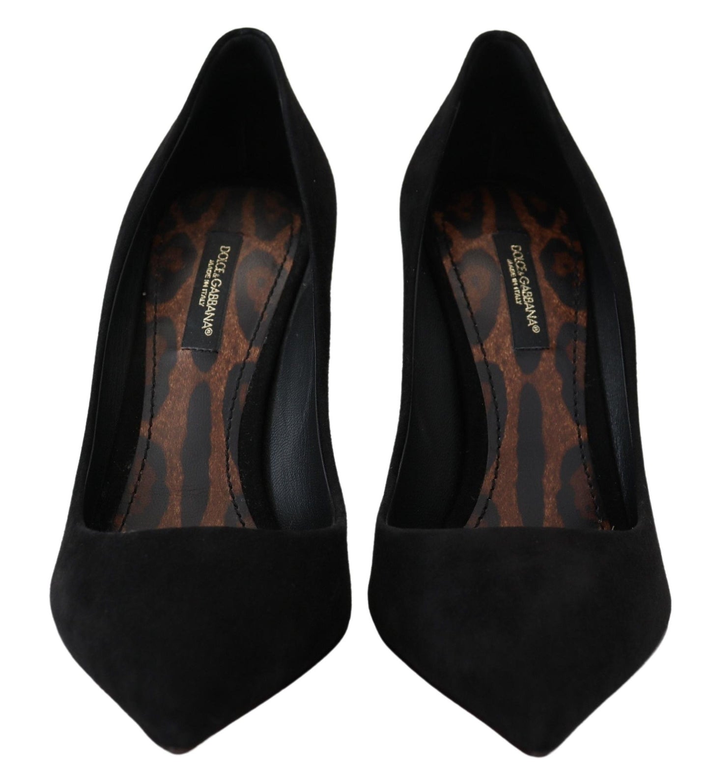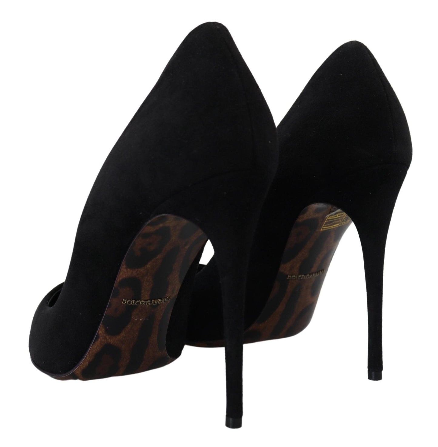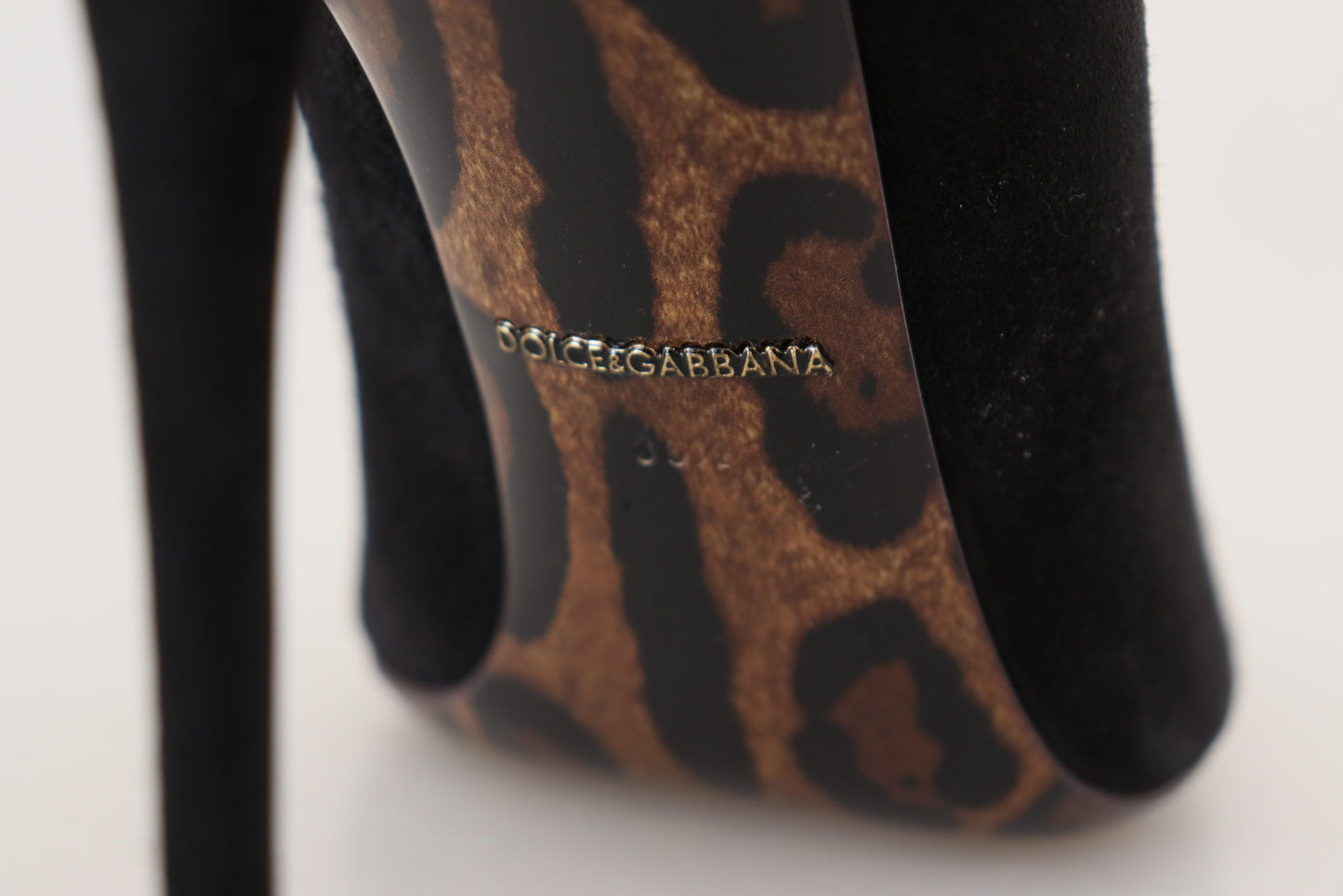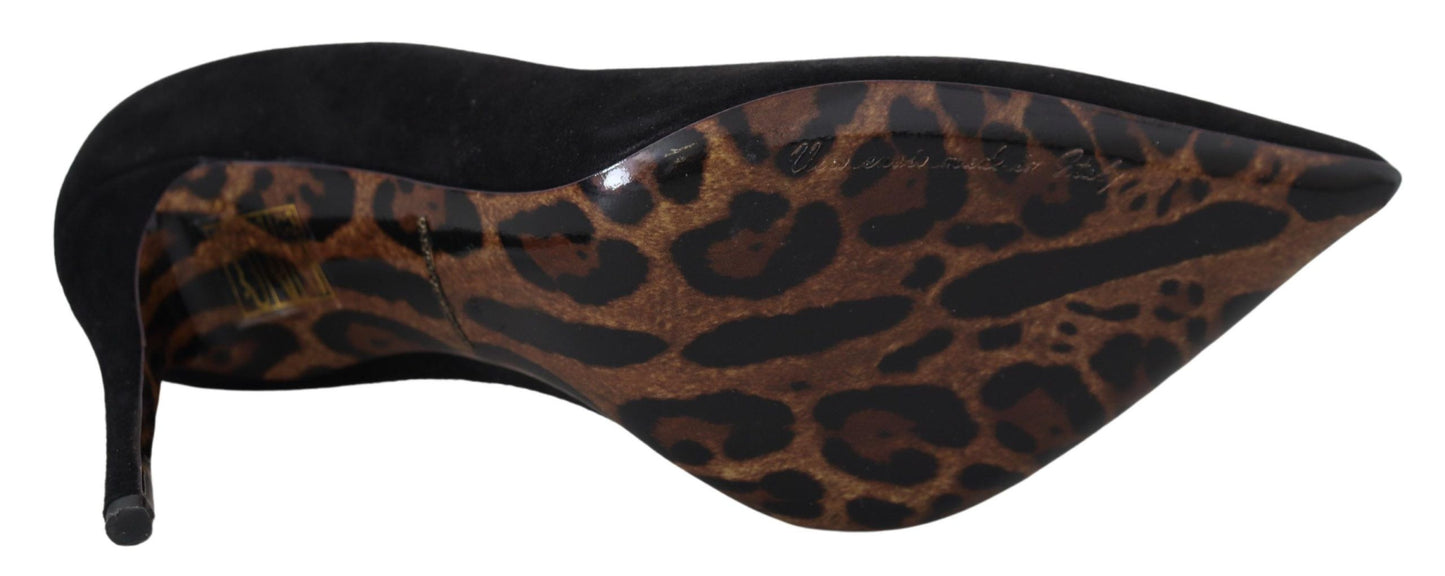 Indulge in the epitome of sophistication with these exquisite stiletto heels from Dolce & Gabbana. Gorgeous and brand new with tags, these pumps are fashioned from luxurious 100% suede leather, offering a chic addition to any ensemble. Designed to elevate your style, the shoes feature a classic black hue complemented by a striking brown leopard print on both the inner and outer sole for an unexpected twist. A leather bottom sole and subtle logo details carve out an exclusive look. Expert craftsmanship from Italy ensures each step you take is in pure elegance.