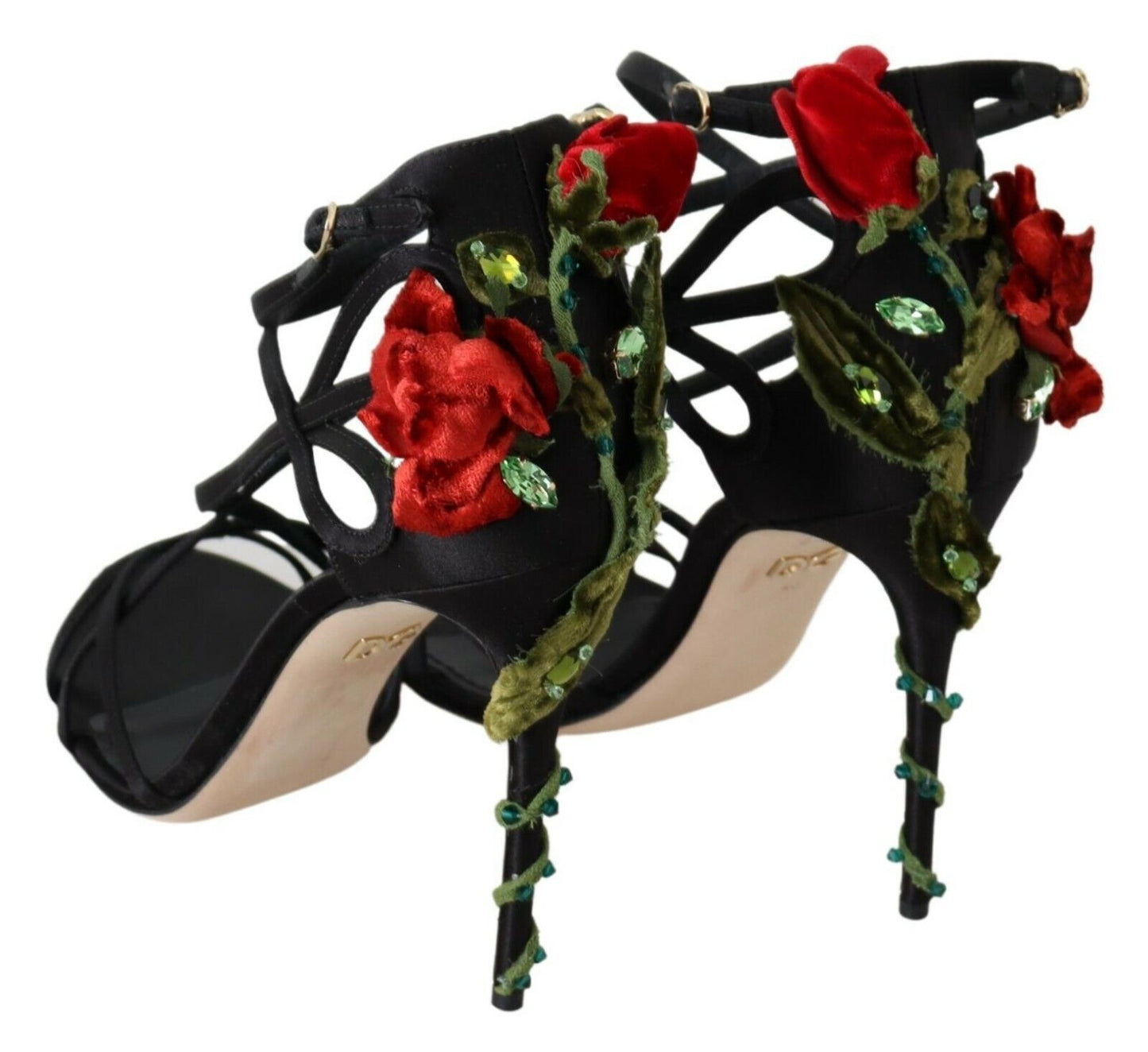 Indulge in the opulence of these striking Dolce & Gabbana high heel sandals. Expertly crafted in Italy, these stunning black suede sandals boast a myriad of exquisite details, from dazzling crystal embellishments to delicate floral appliqués. The open-toe, strappy design exudes an aura of glamour, while the high heels add a statuesque elegance to any ensemble. A branded embossed insole ensures comfort without compromising style, making these beauties a perfect choice for any luxury fashion connoisseur.