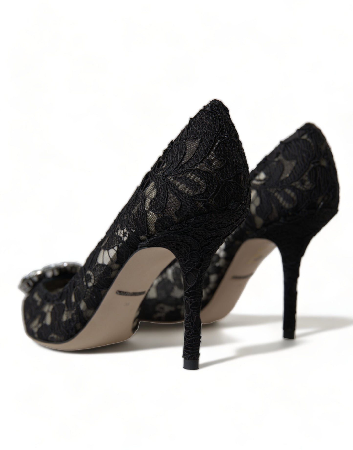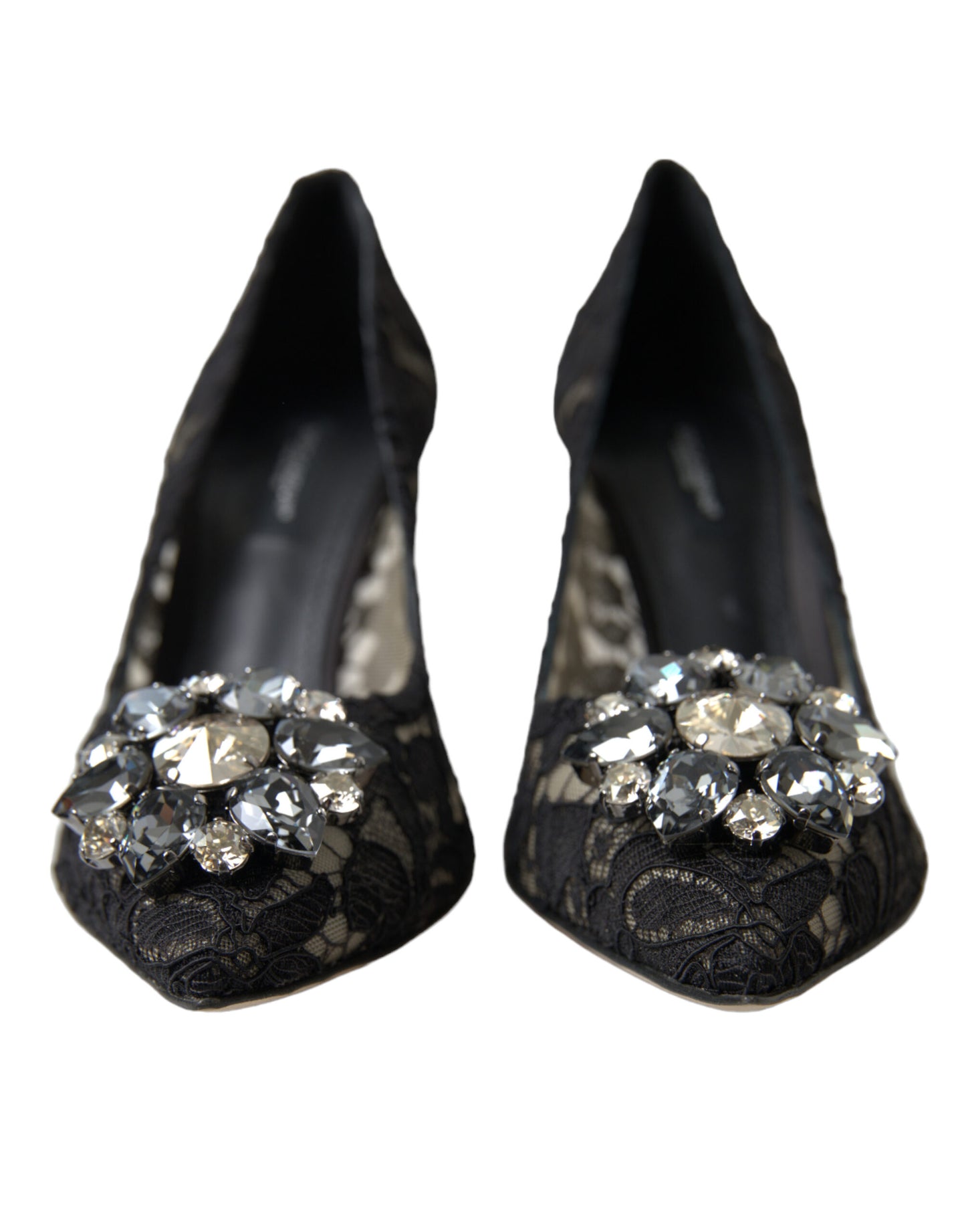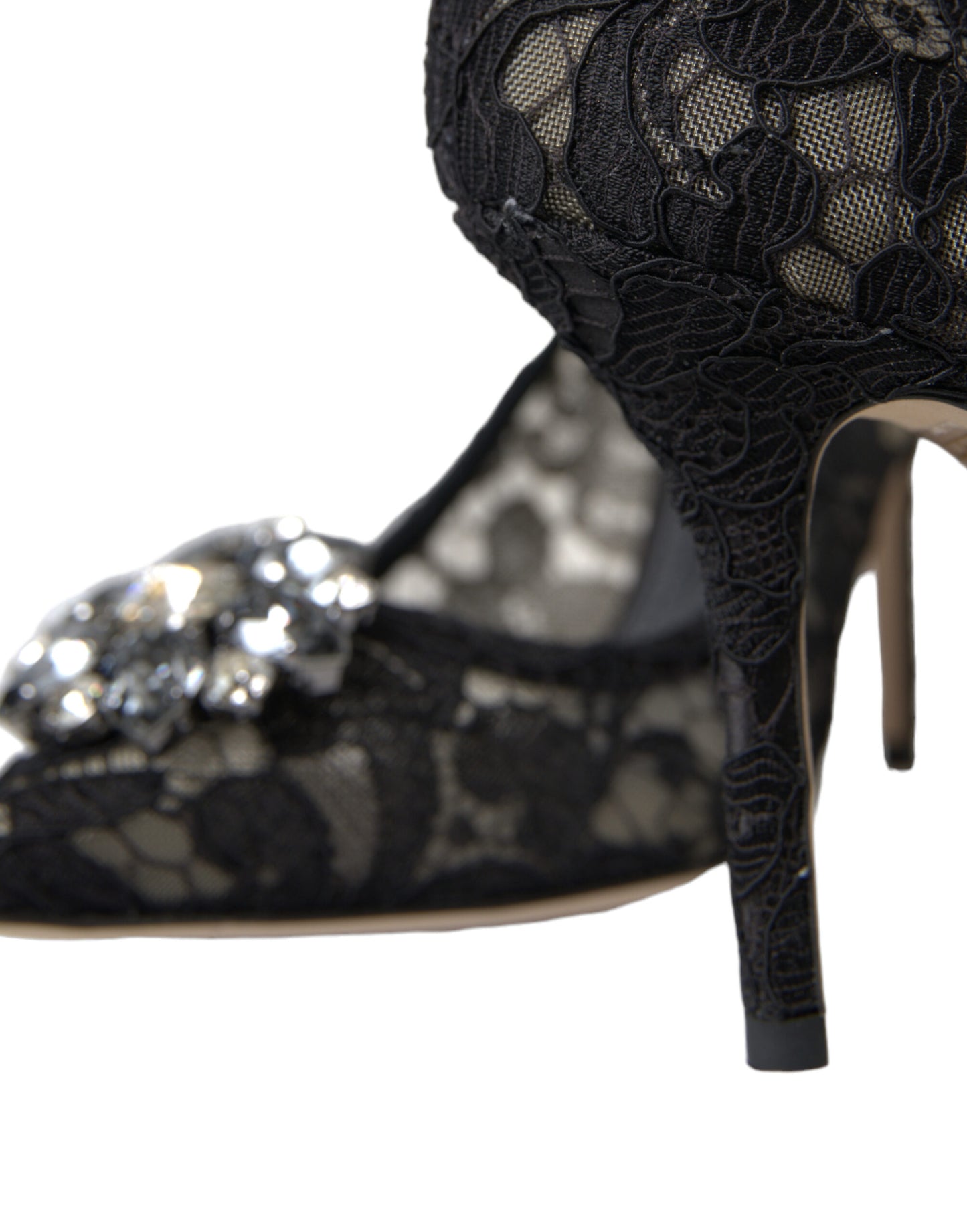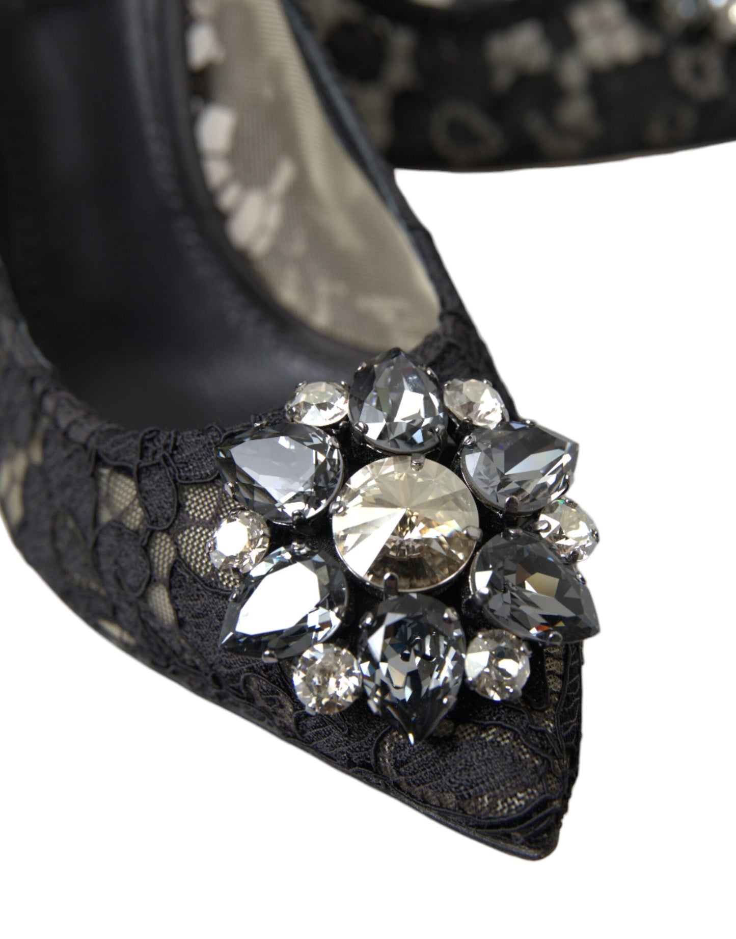 Elevate your evening wear with these exquisite Taormina lace heels from Dolce & Gabbana. Adorned with sparkling white and gray crystals, this pair from the Rainbow Collection promises to add a touch of glamour to your steps. Crafted with precision in Italy, these pumps feature a luxurious composition and a sleek black hue, matched with a leather bottom sole for durability and comfort. The logo detail subtly showcases the authenticity and craftsmanship of Dolce & Gabbana.