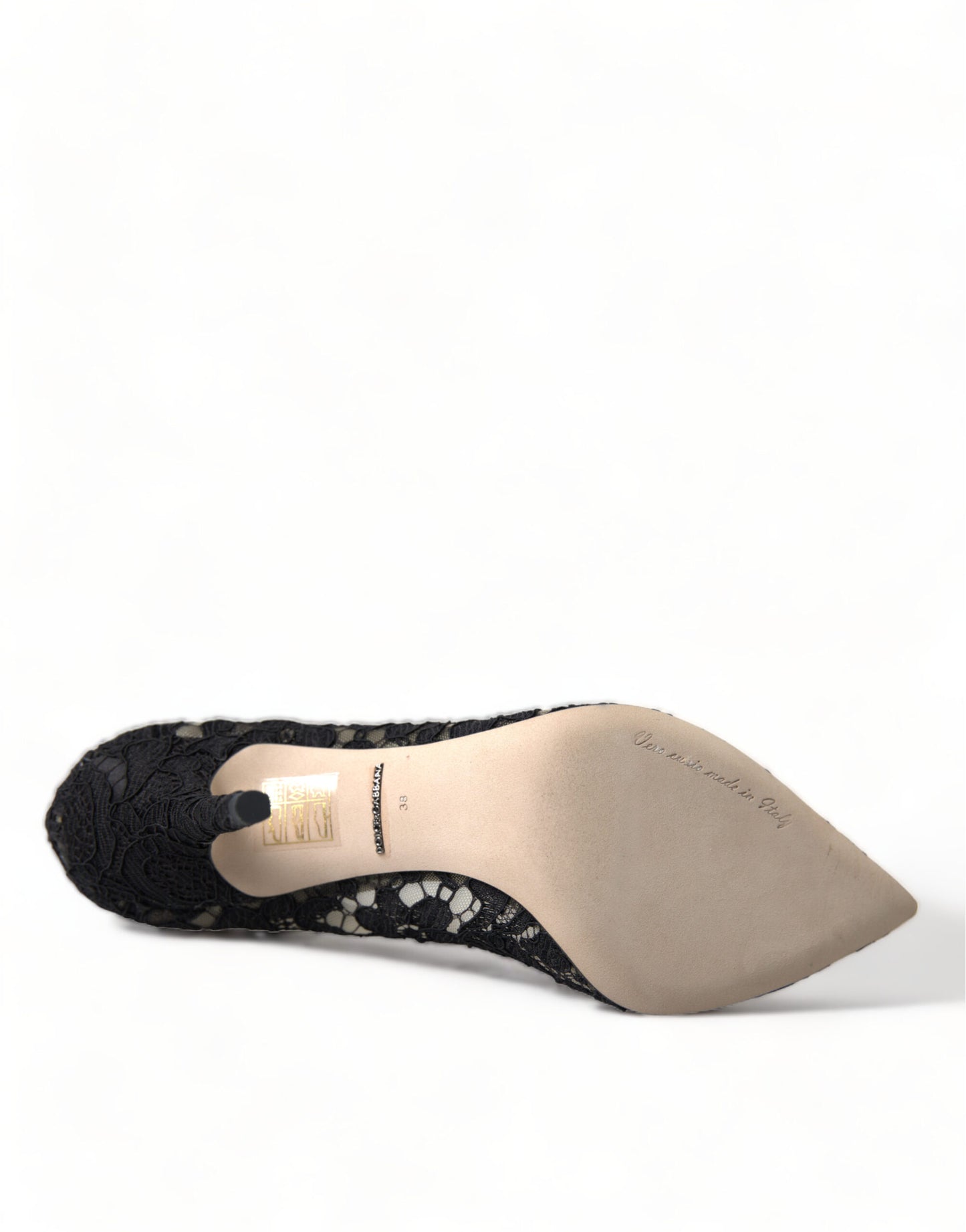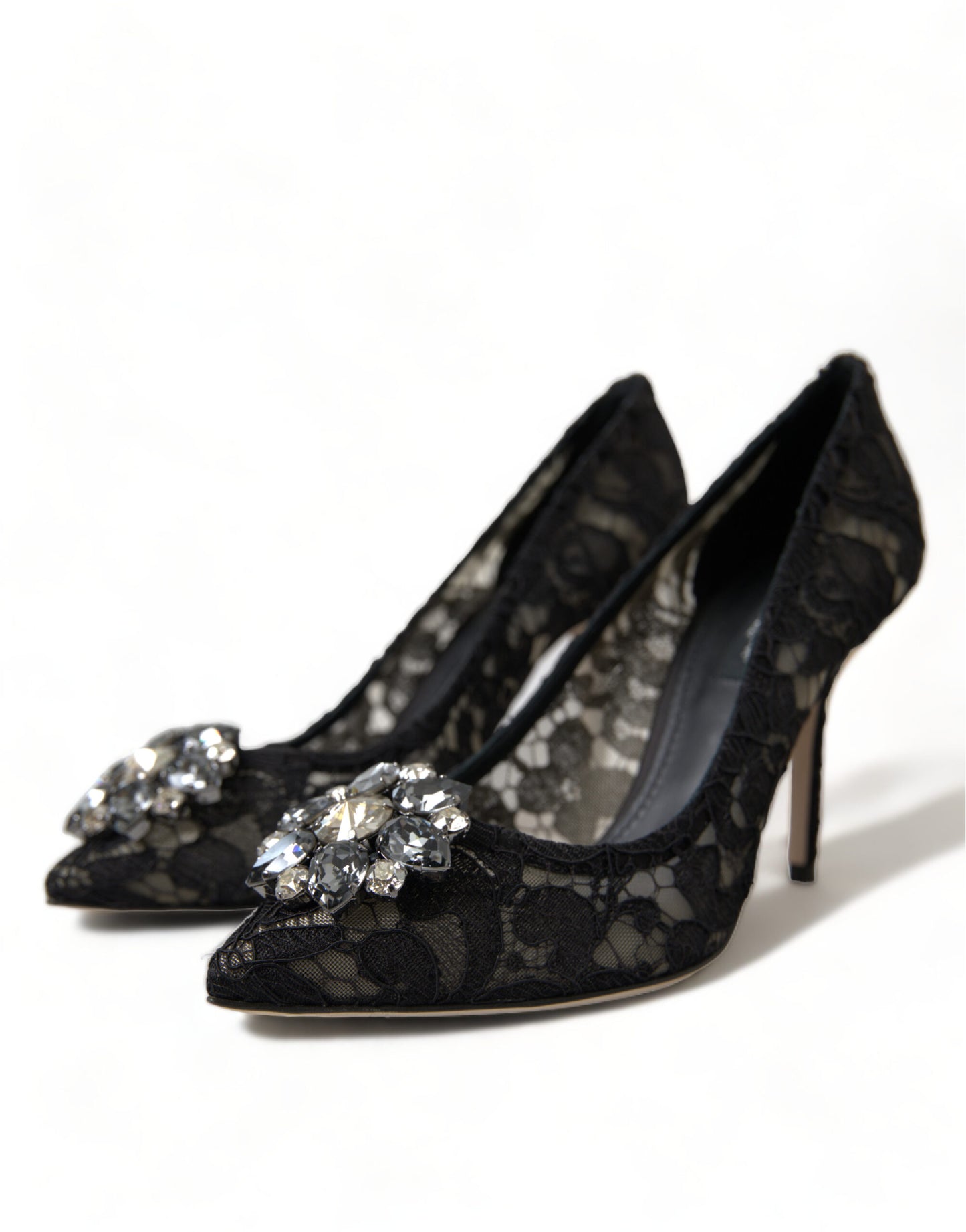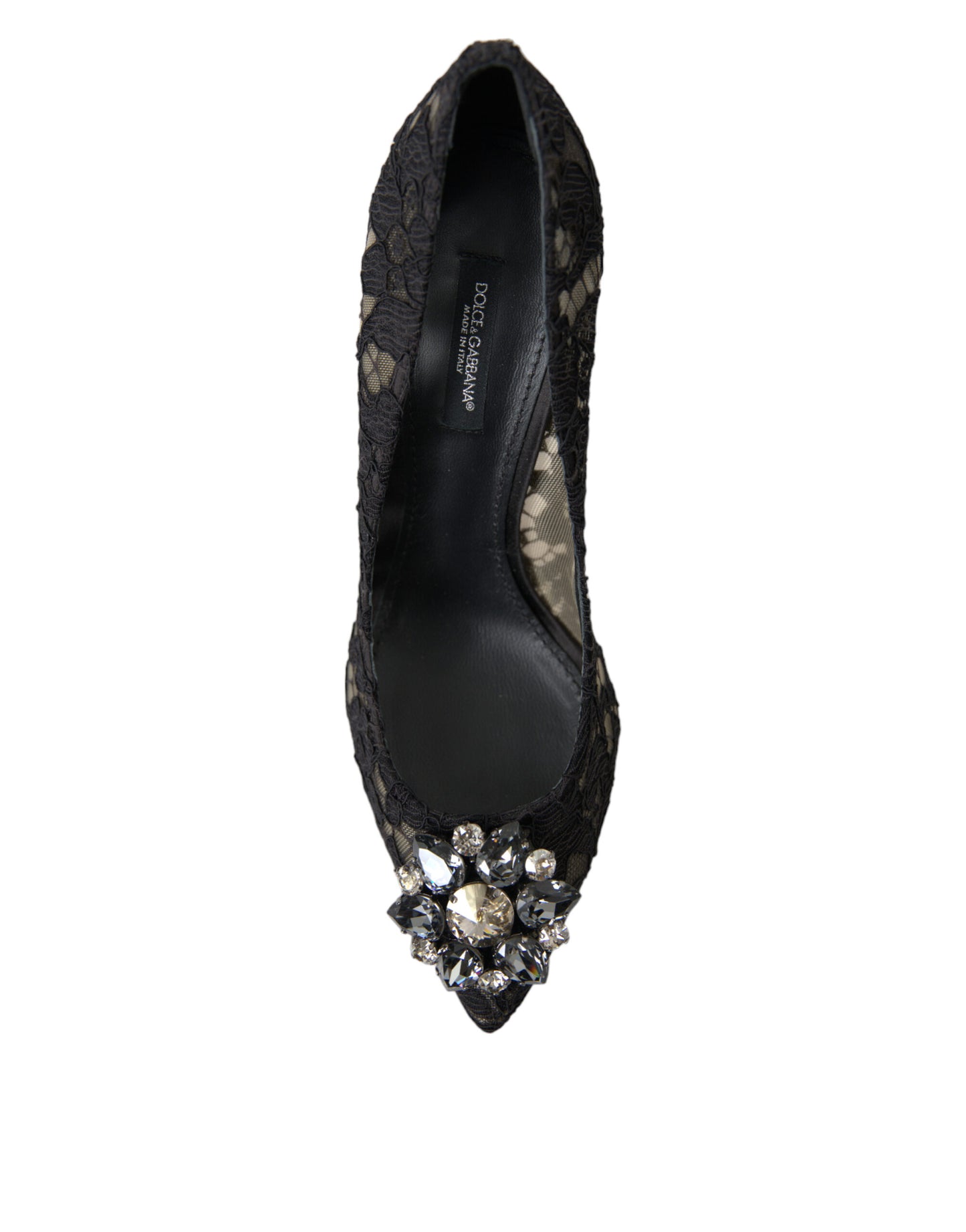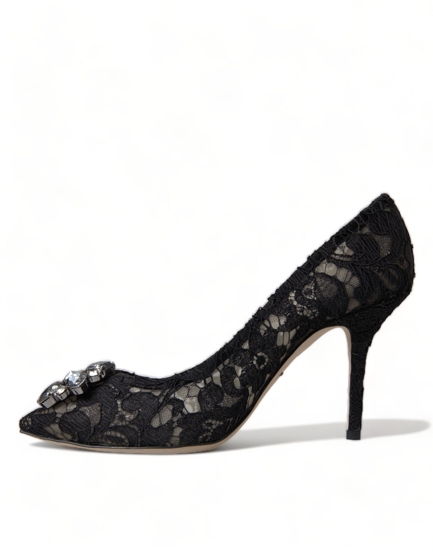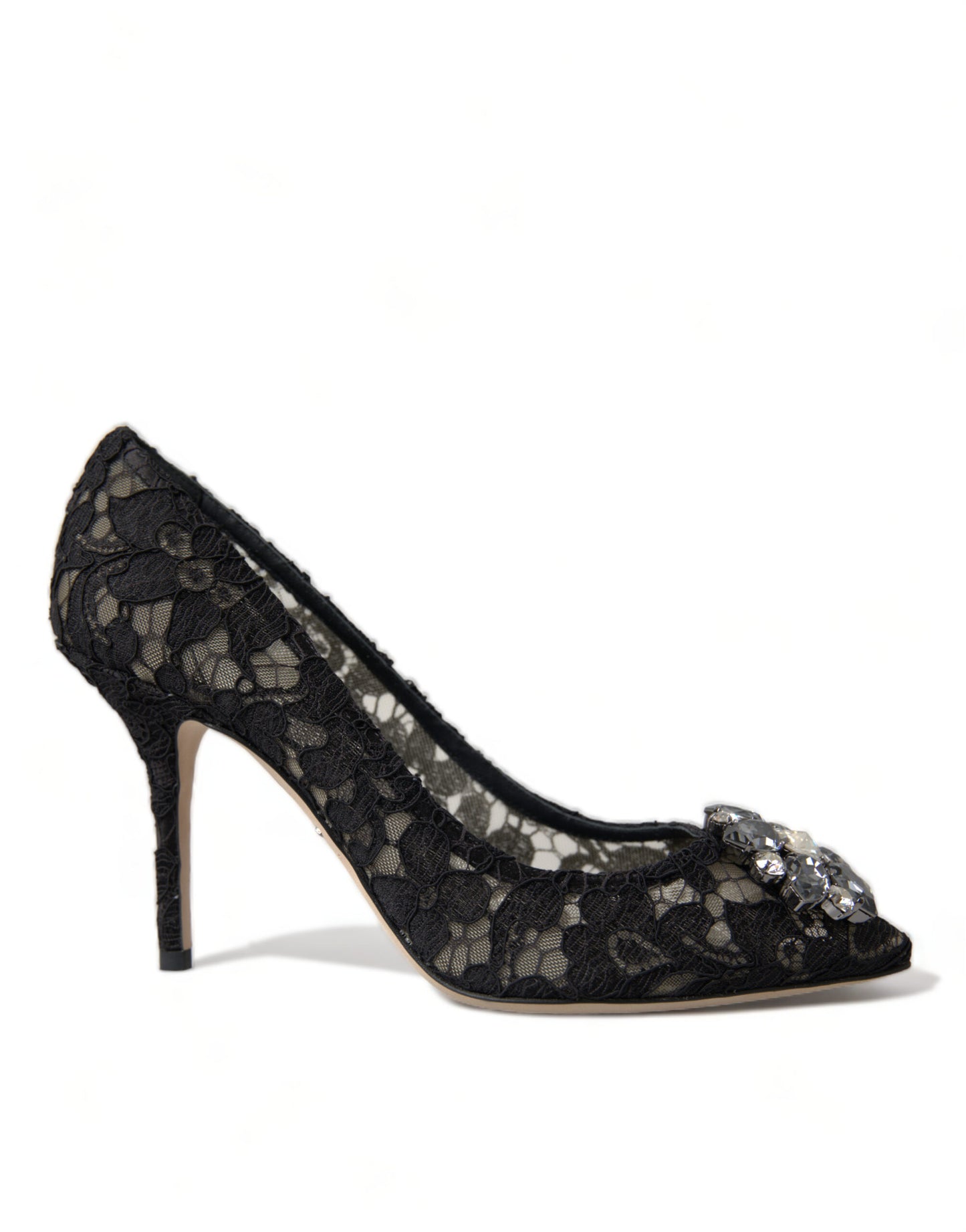 Elevate your evening wear with these exquisite Taormina lace heels from Dolce & Gabbana. Adorned with sparkling white and gray crystals, this pair from the Rainbow Collection promises to add a touch of glamour to your steps. Crafted with precision in Italy, these pumps feature a luxurious composition and a sleek black hue, matched with a leather bottom sole for durability and comfort. The logo detail subtly showcases the authenticity and craftsmanship of Dolce & Gabbana.