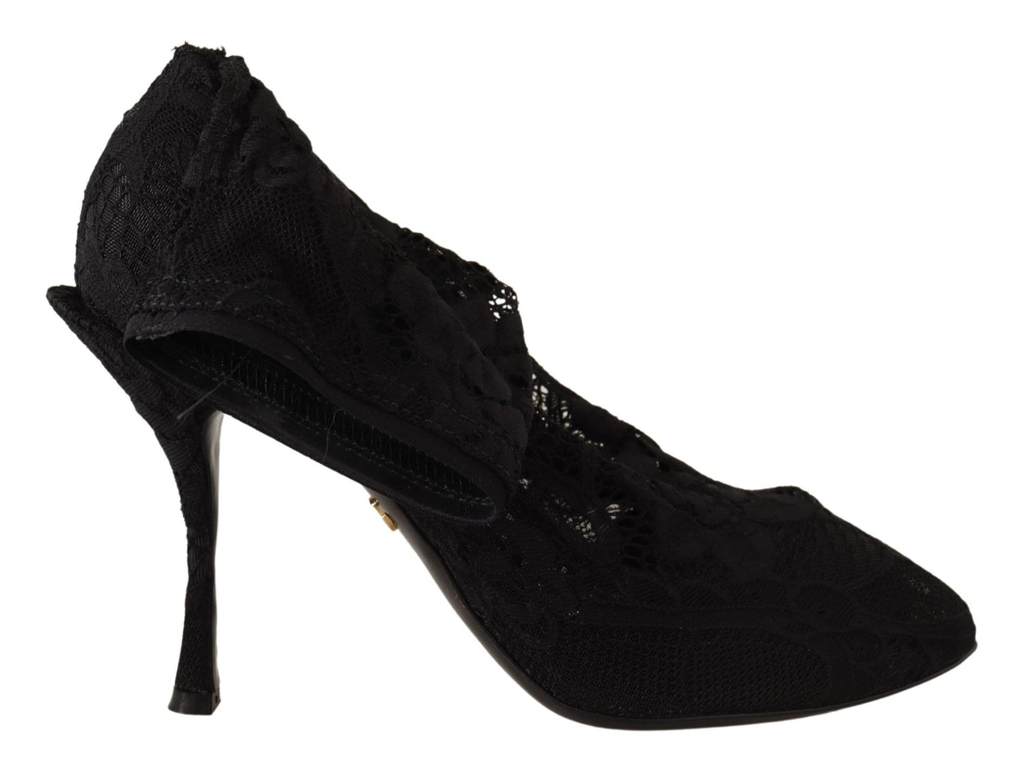 Step into luxury with these stunning Dolce & Gabbana ankle boots. These heels exude elegance with their exquisite floral lace detailing and sophisticated silhouette. Perfect for adding a touch of glamour to any outfit, the boots feature a pointed toe, a seamless slip-on style, and a comfortable branded insole. Crafted in Italy, they offer both a durable leather sole and an inner lining which ensures they are as enduring as they are beautiful.