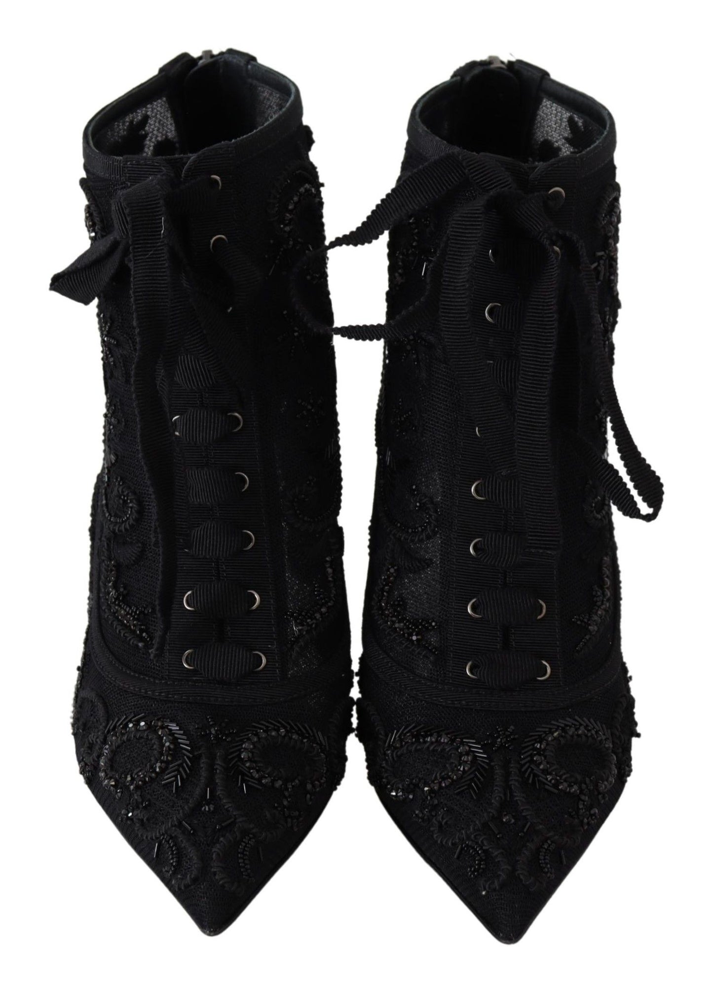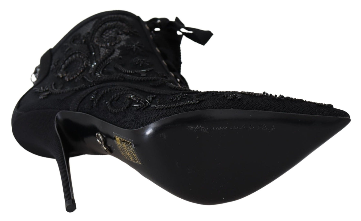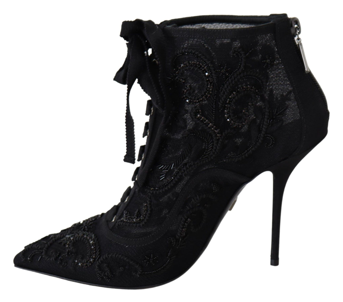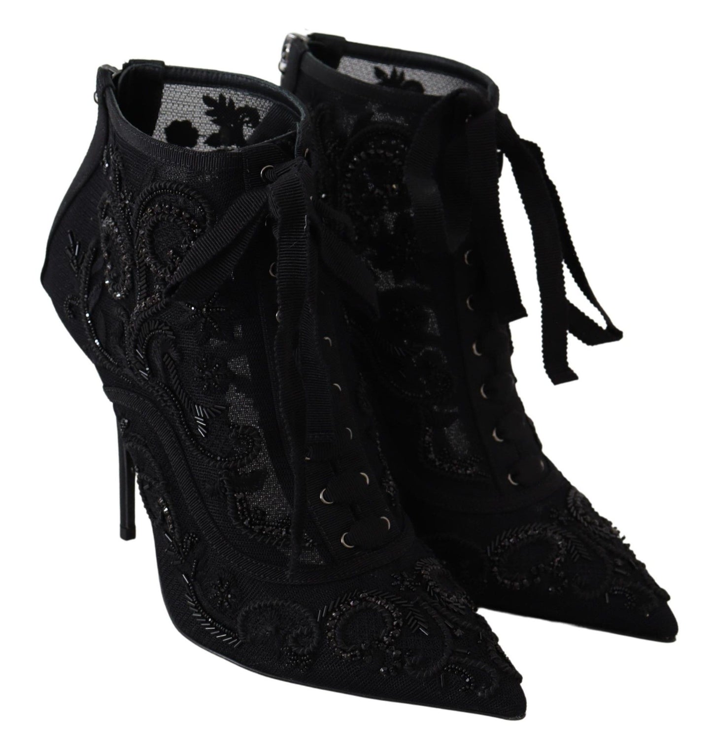 Experience the epitome of Italian craftsmanship with these exquisite Dolce & Gabbana black tulle boots. These brand new, tag-attached boots showcase a luxe blend of materials and fine details, ensuring both durability and style. The lace-up and zipper closure provide a secure and flattering fit, perfect for making a statement at any upscale event.